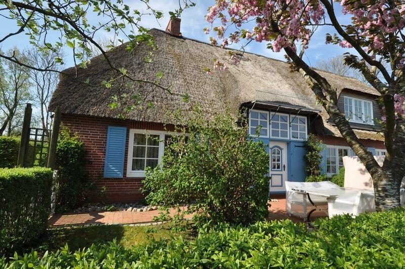 Romantische Reetdachhaushälfte in Garding mit Kamin, Terrasse und freistehender Badewanne im Schlafzimmer.