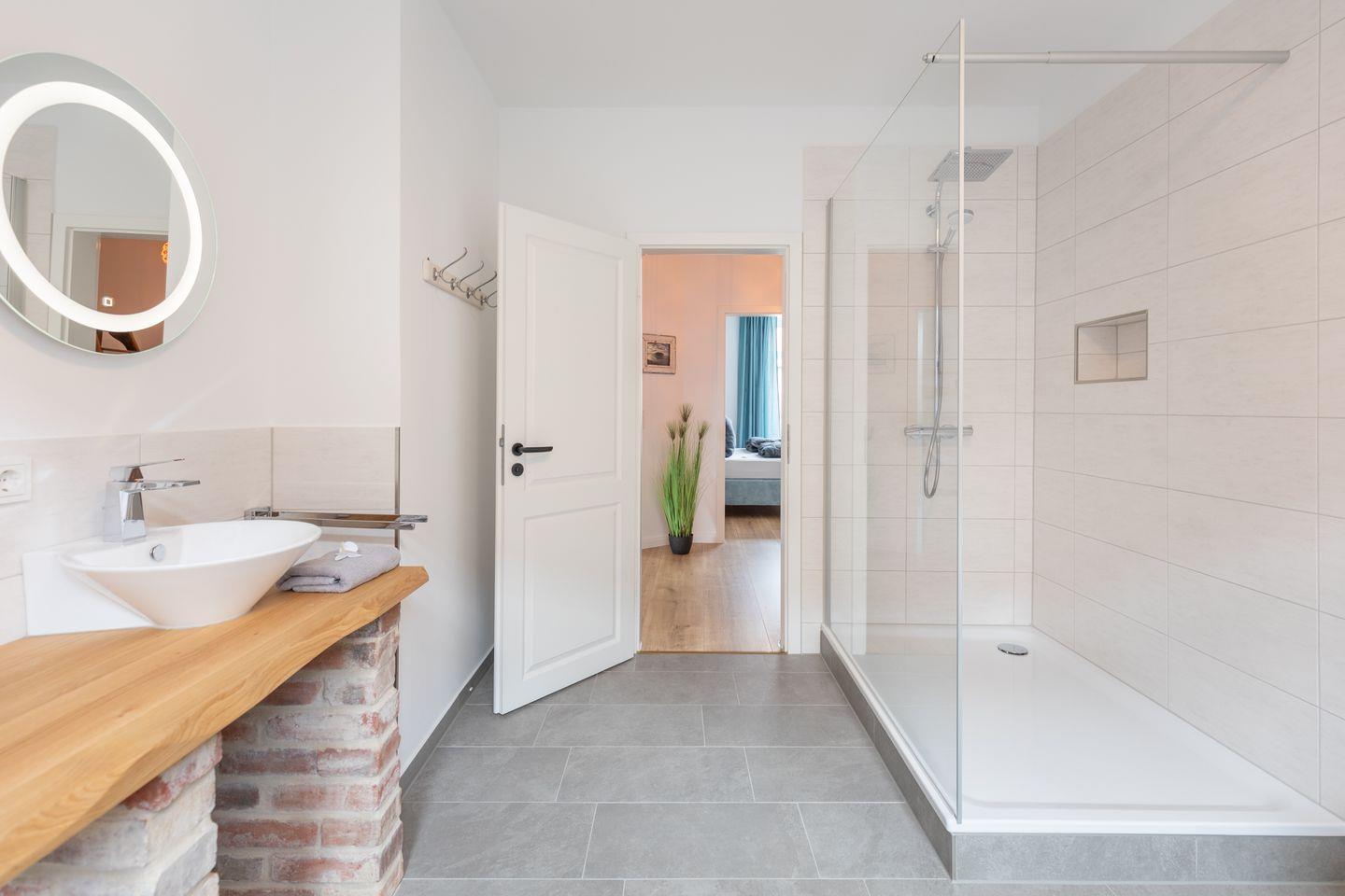 Das chic designte Bad mit Walk-In Dusche und WC runden das Bild ab.