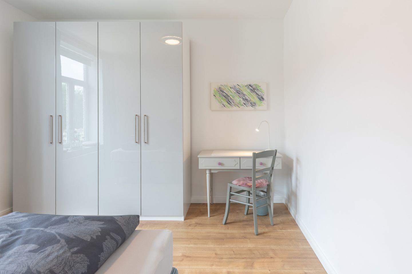 Das Schlafzimmer bietet Ihnen ein bequemes Doppelbett (180 x 200), einen Kleiderschrank und eine Workstation.