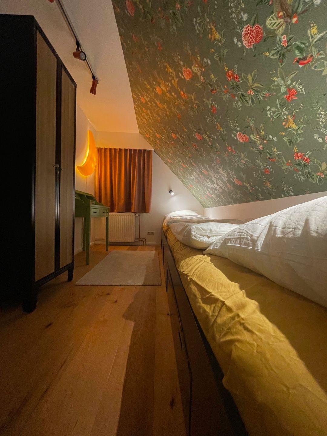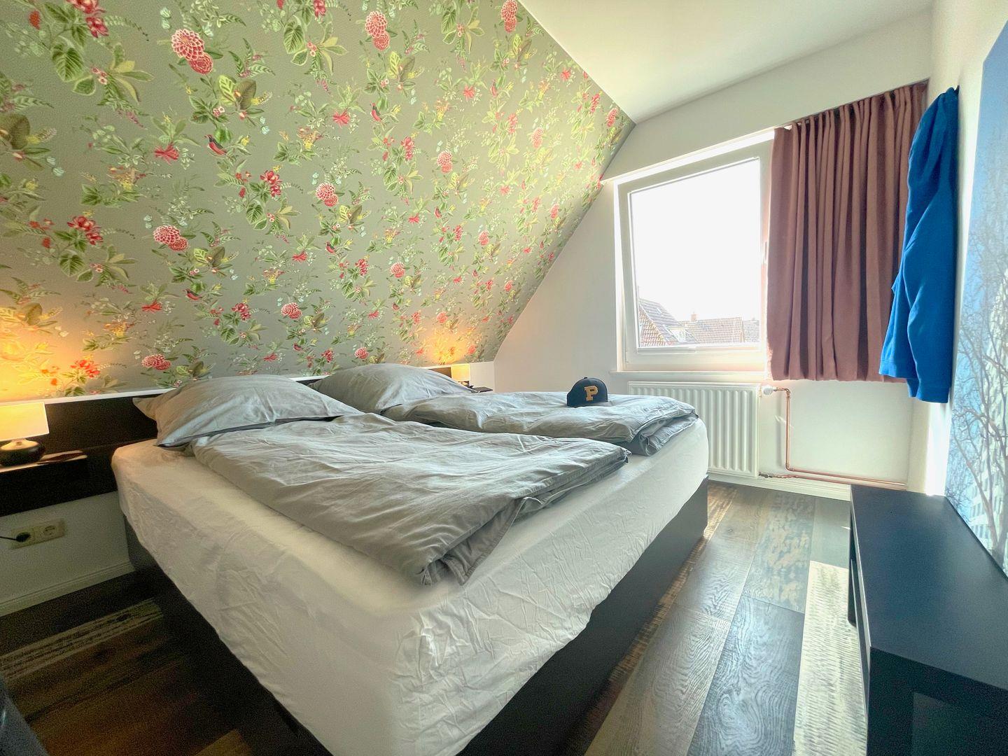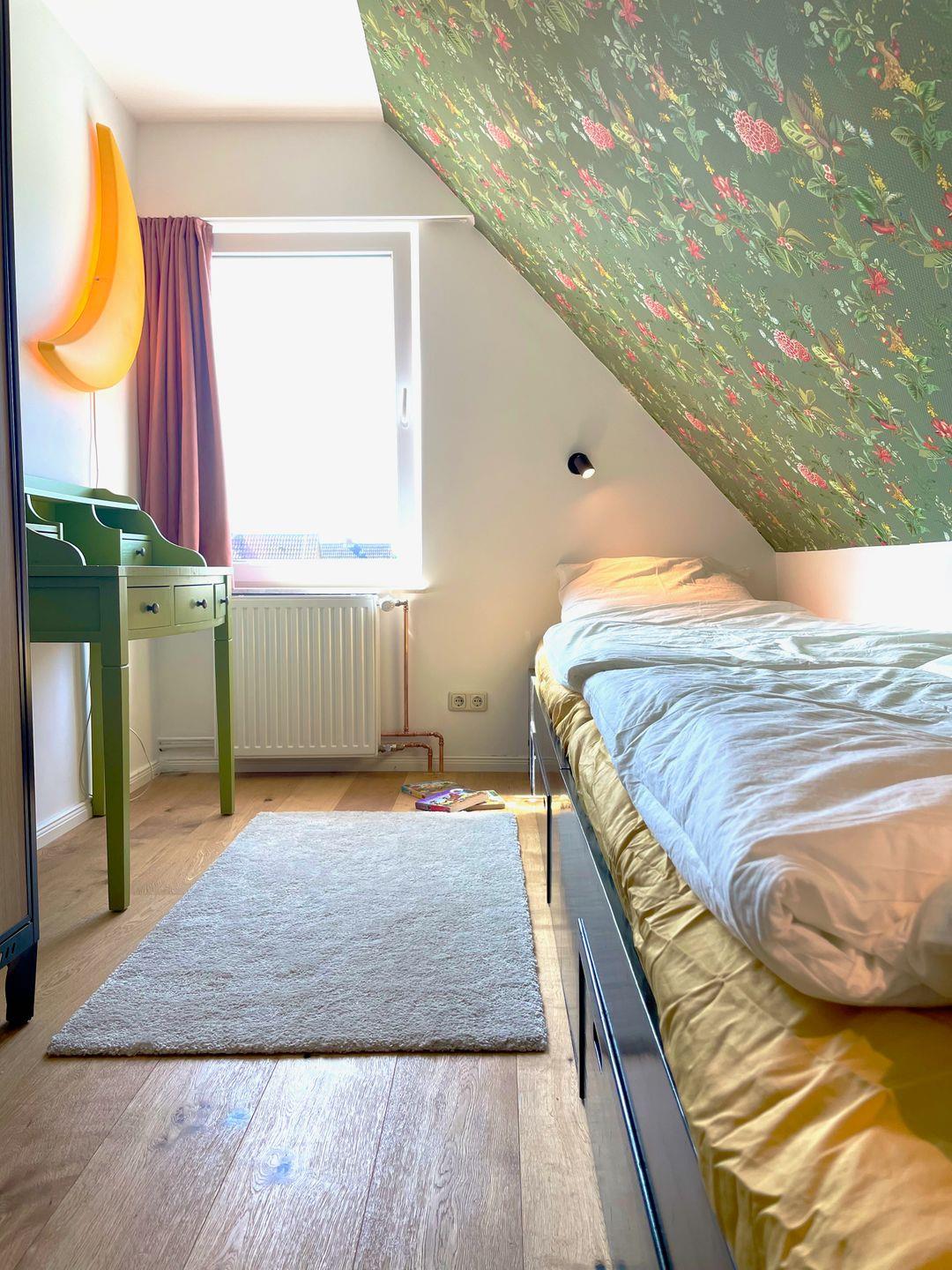 Das Melkmanns ist gut 130qm groß und bietet auf 2 Etagen entspannt Platz für 5 - 6 Gäste. In den 3 unterschiedlich großen Schlafzimmern kann man es sich jederzeit gemütlich machen, wobei im größten Schlafzimmer auch ein Tisch zum Arbeiten – wenn es denn unbedingt sein muss – oder zum Spielen bereitsteht. Das kleinste Schlafzimmer ist mit zwei Einzelbetten ausgestattet. Und sollte man sich zwischendurch mal aufs Ohr hauen wollen, steht im großen Flur auch ein Schlafsofa parat. Im Vollbad kann man nach einem Strandtag nochmal gemütlich in der Wanne abtauchen und im Duschbad unten schnell unter die Brause springen. Ab Herbst entsteht hier auch eine Sauna – stay tuned! Zusätzlich gibt’s auch noch ein praktisches Gäste-WC. Für die kleinen Gäste stehen zwei Reisebetten und zwei Hochstühle bereit.