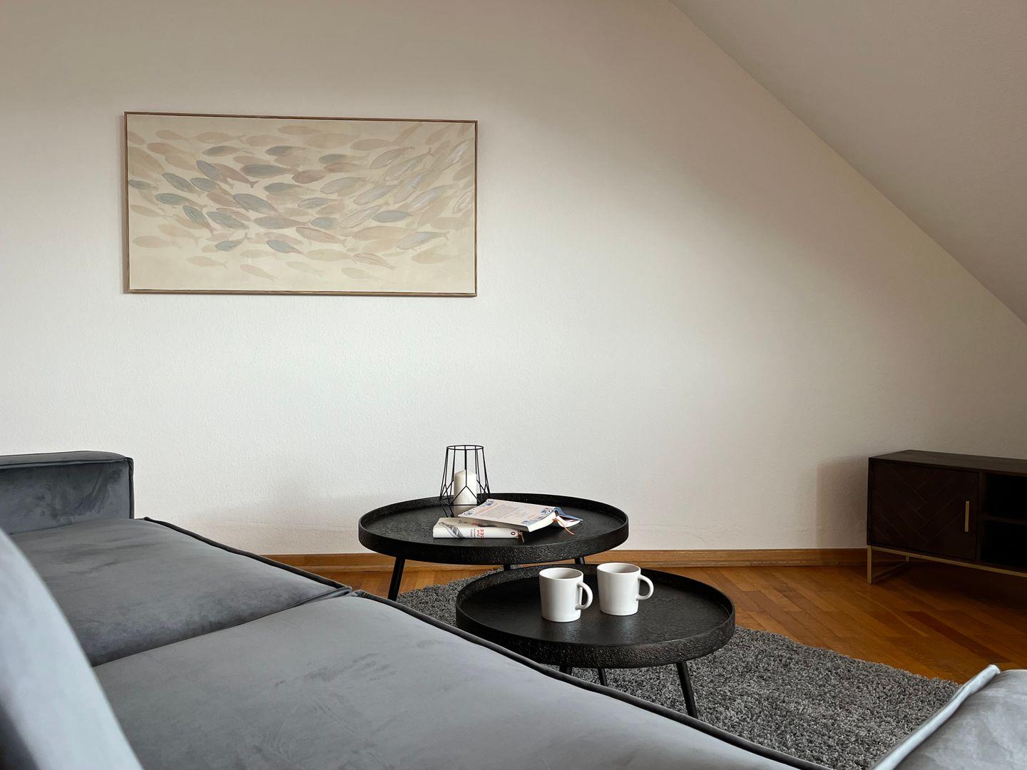 Der Wohnbereich ist mit Sofaecke, Sofa, Sesseln, TV mit digitalen und internationalen Kanälen, Radio, HiFi-Anlage sowie Büchern ausgestattet und schafft eine angenehme Umgebung für entspannte Urlaubstage. WLAN und Internet stehen Ihnen ebenfalls zur Verfügung. Ein Schreibtisch ergänzt die Ausstattung und bietet praktische Voraussetzungen, wenn Sie auch während Ihres Aufenthalts gelegentlich arbeiten oder schreiben möchten. Parkett im Wohnzimmer und Laminat in den Schlafzimmern sorgen für eine wohnliche Atmosphäre.