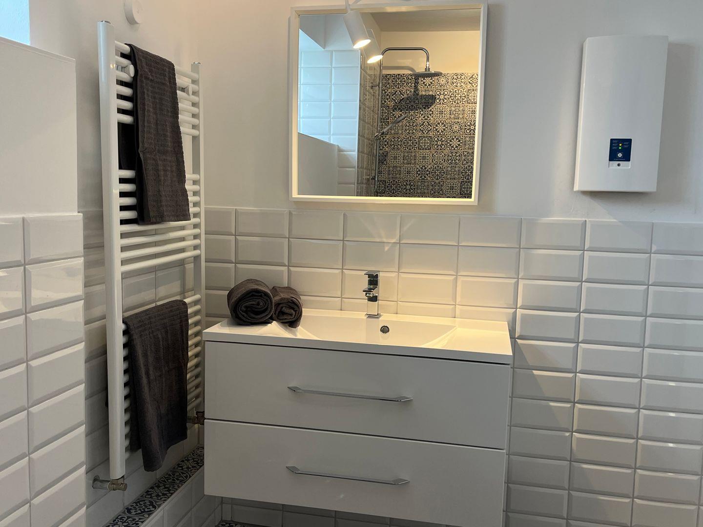 Das Badezimmer verfügt über eine bodengleiche Dusche, Waschbecken, WC, Spiegel und Haartrockner. Das zusätzliche Gäste-WC erhöht den Komfort insbesondere bei einer Belegung mit mehreren Personen.