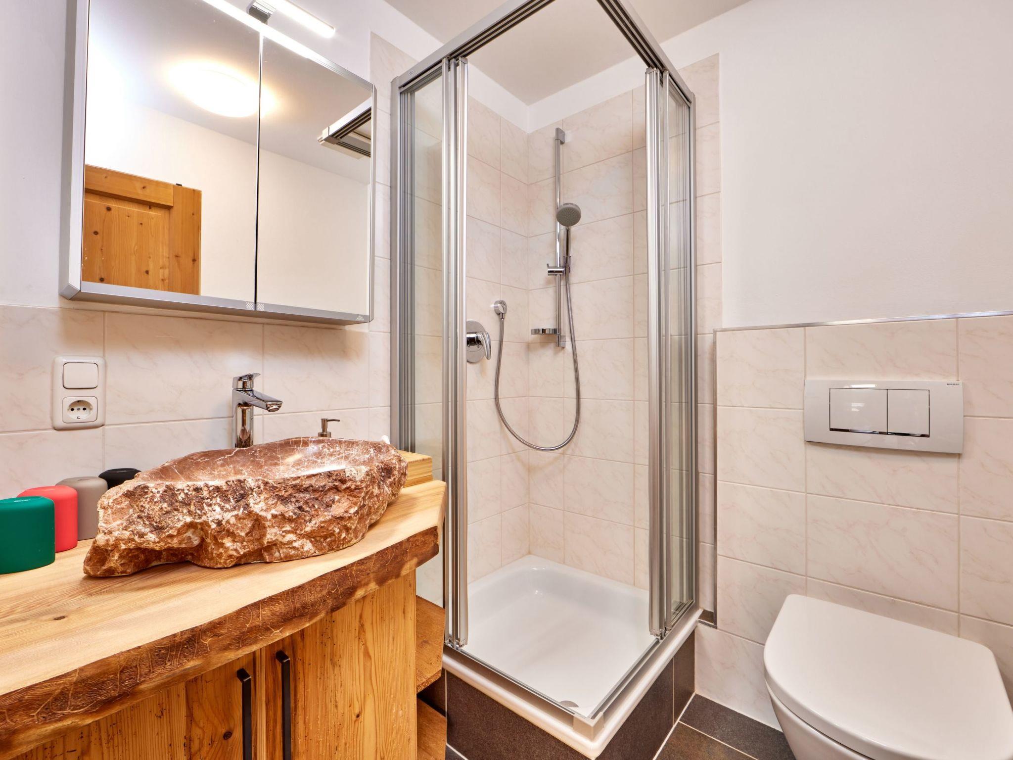 Das moderne Duschbad im Obergeschoss mit handgefertigtem Naturstein-Waschbecken und Fön ermöglicht dir sowohl einen fitten Start in den Morgen als auch einen regenerierenden Tagesausklang.