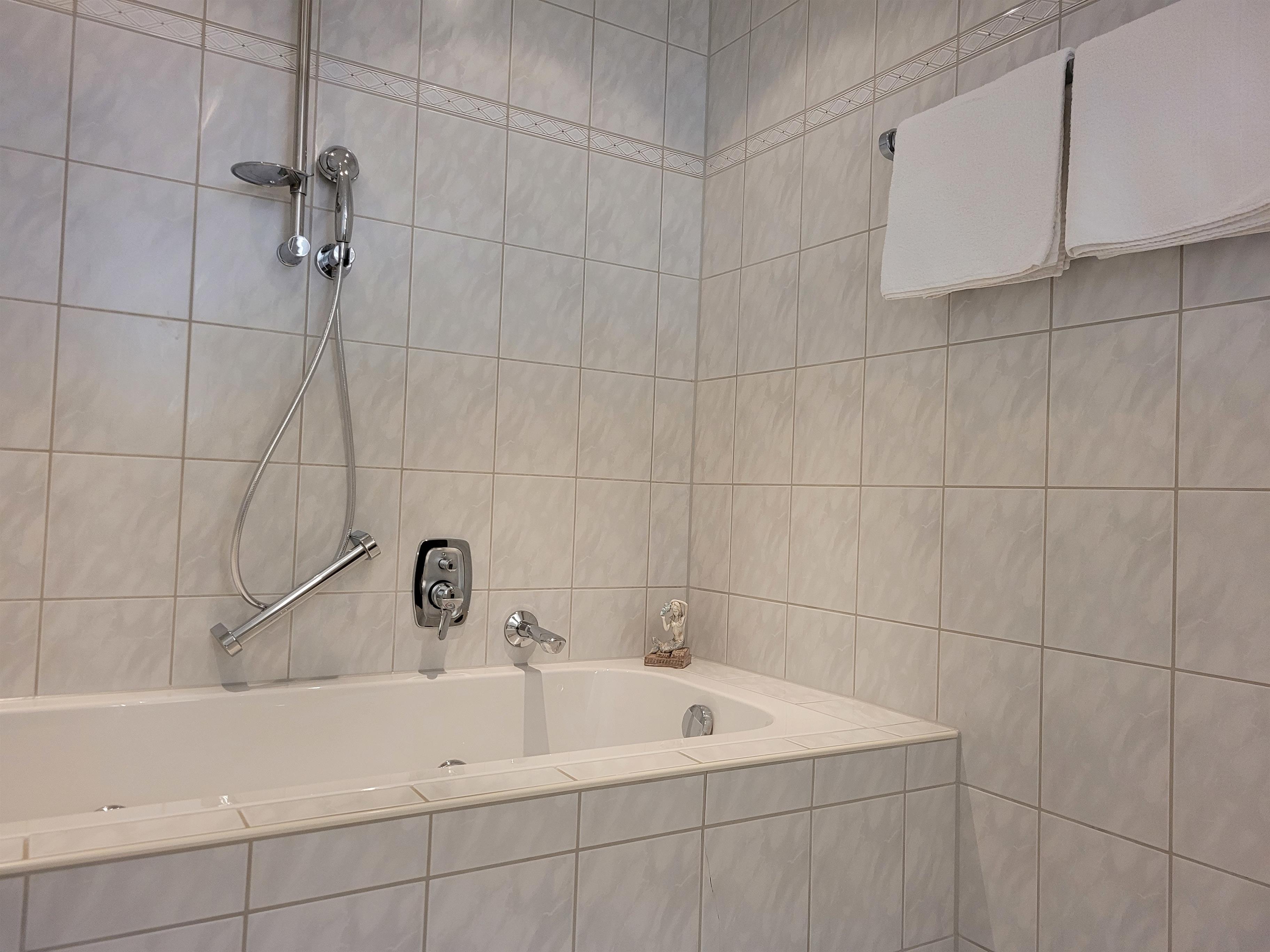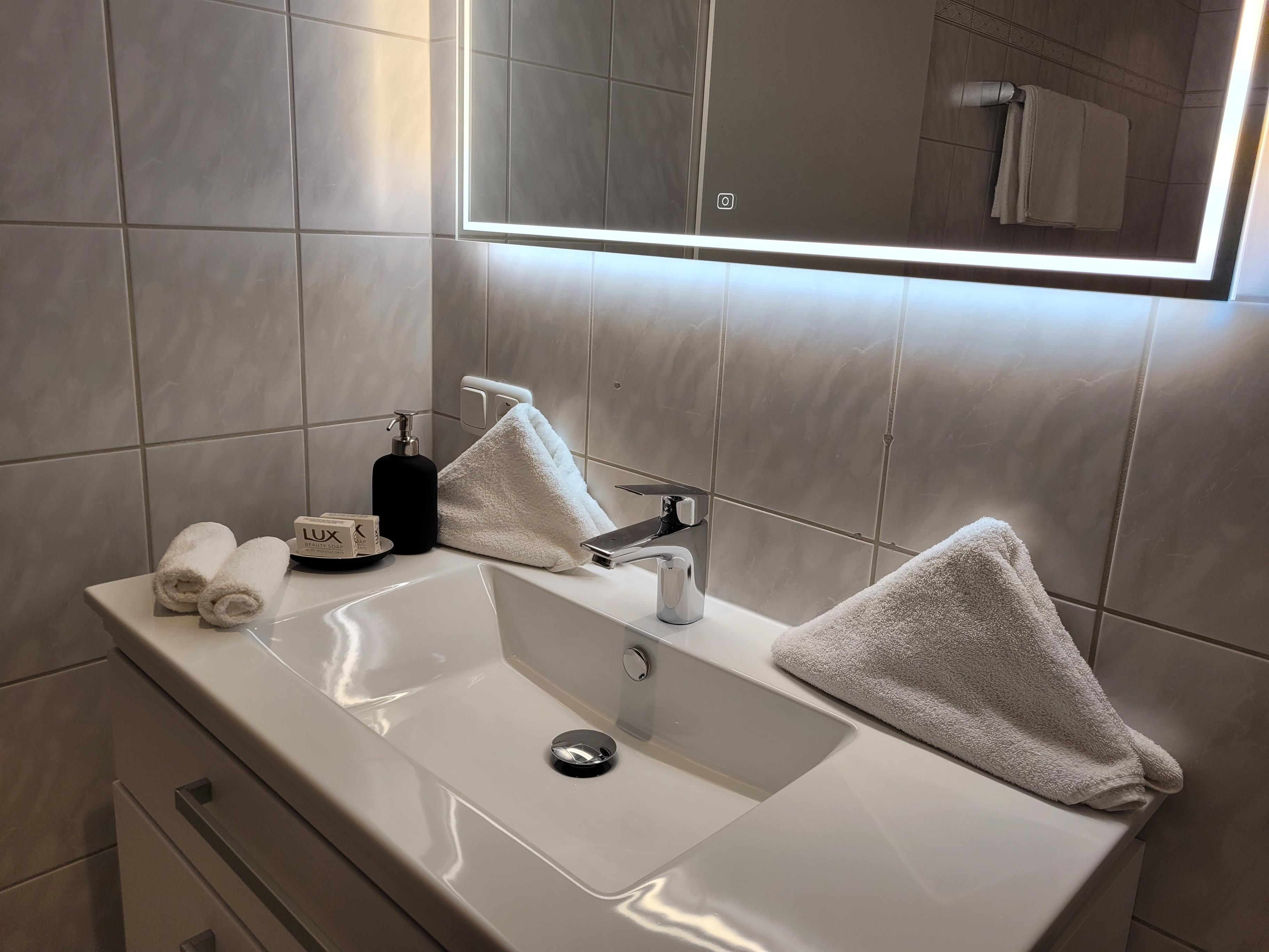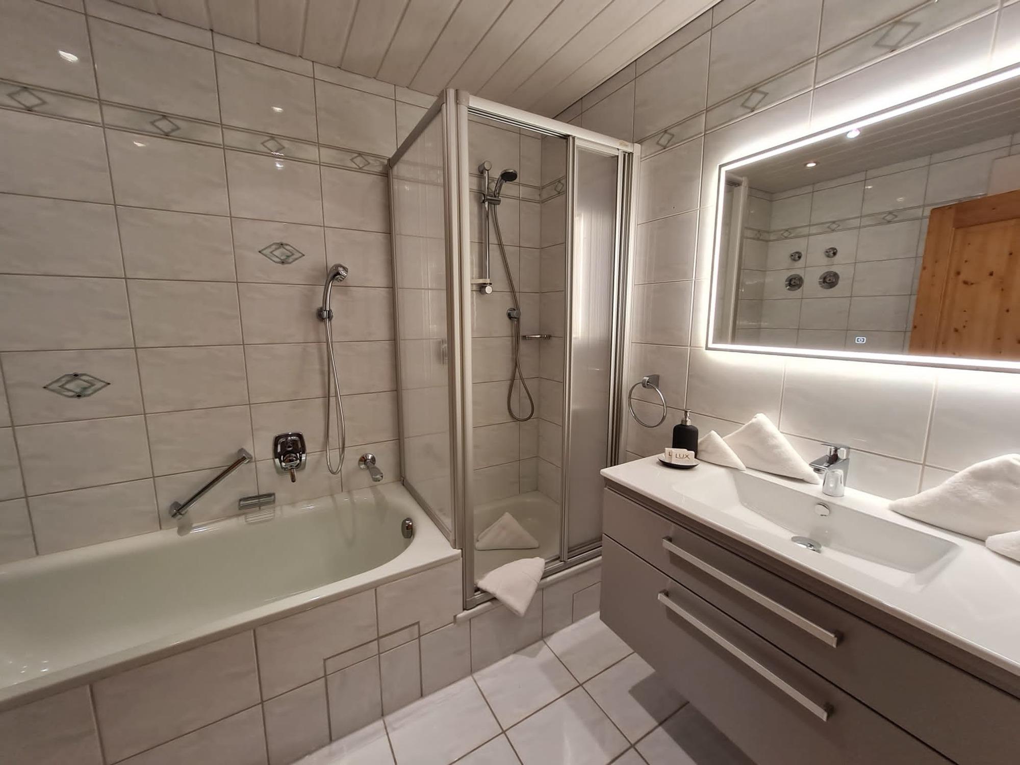 Die beiden modernen, ambient beleuchteten Bäder bieten neben einer Wanne zum entspannen auch eine separate Dusche für den kurzen belebenden Schauer.