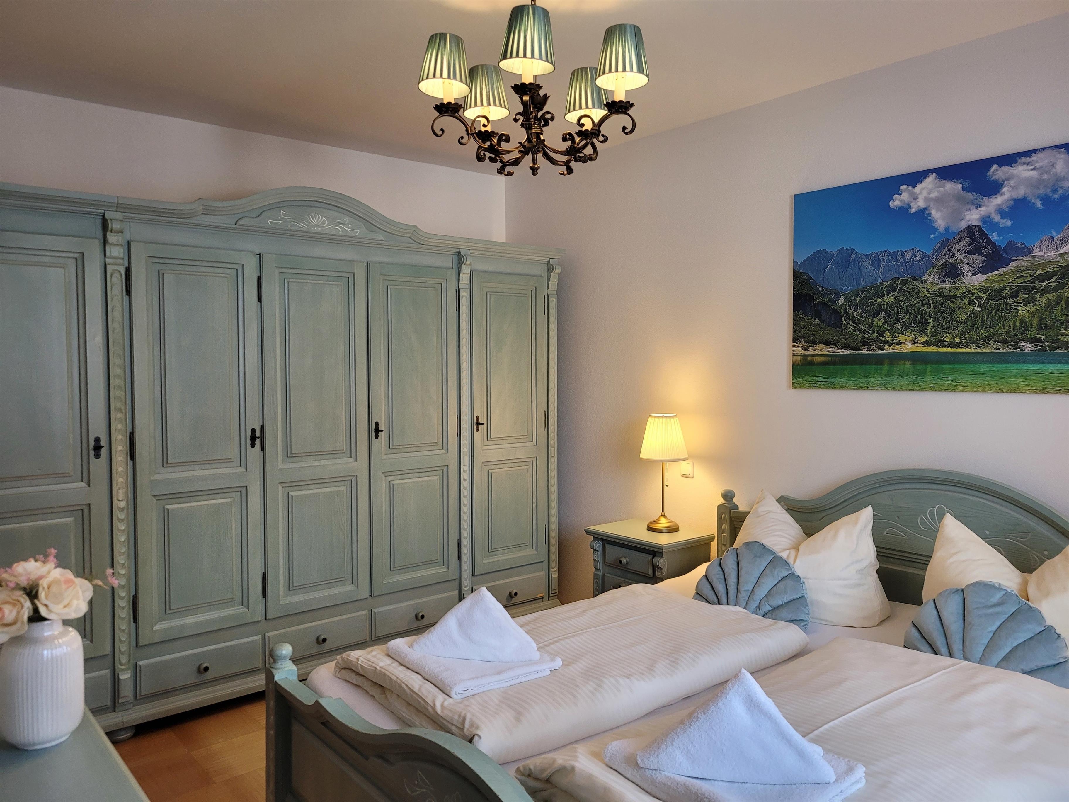 Die modern eingerichtete Ferienwohnung bietet auf großzügigen 86 Quadratmetern - aufgeteilt in Erdgeschoss und Souterrain - alle Annehmlichkeiten für einen perfekten Urlaub am Fuße der Zugspitze: die Ferienwohnung gefällt durch eine stilvolle moderne Einrichtung, die den klassisch bayerischen Landhausstil mit mediterranem Marmor überzeugend vereint. Besonders hervorzuheben sind in den beiden geräumigen Schlafzimmern die schönen, in liebevollen, an die bayerische Lüftlmalerei erinnernden, blau gestrichenen großzügigen Schränke in den in denen auch das große Familiengepäck verstaut werden kann. Die Doppelbetten bestechen durch ihre Geräumigkeit.
