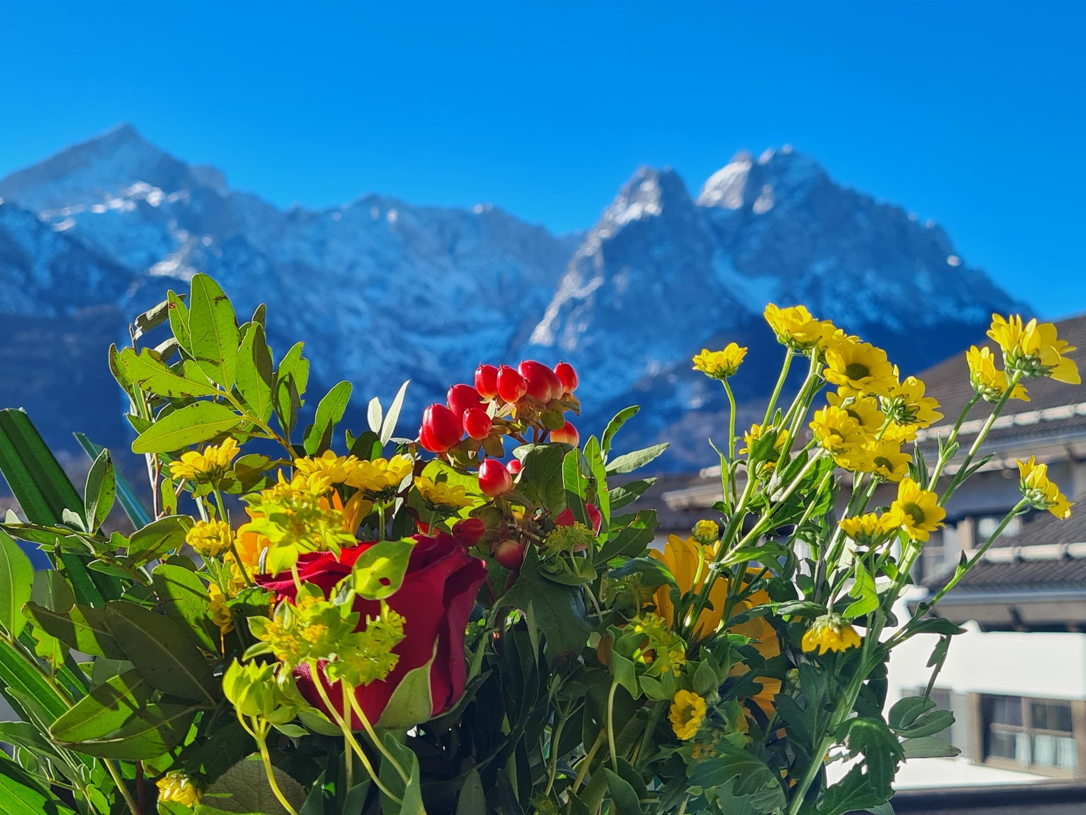 Vom Wohnzimmer aus haben Sie durch die bodentiefen Fenster einen wunderschönen Blick auf das Alpenpanorama des Wettersteinmassives.