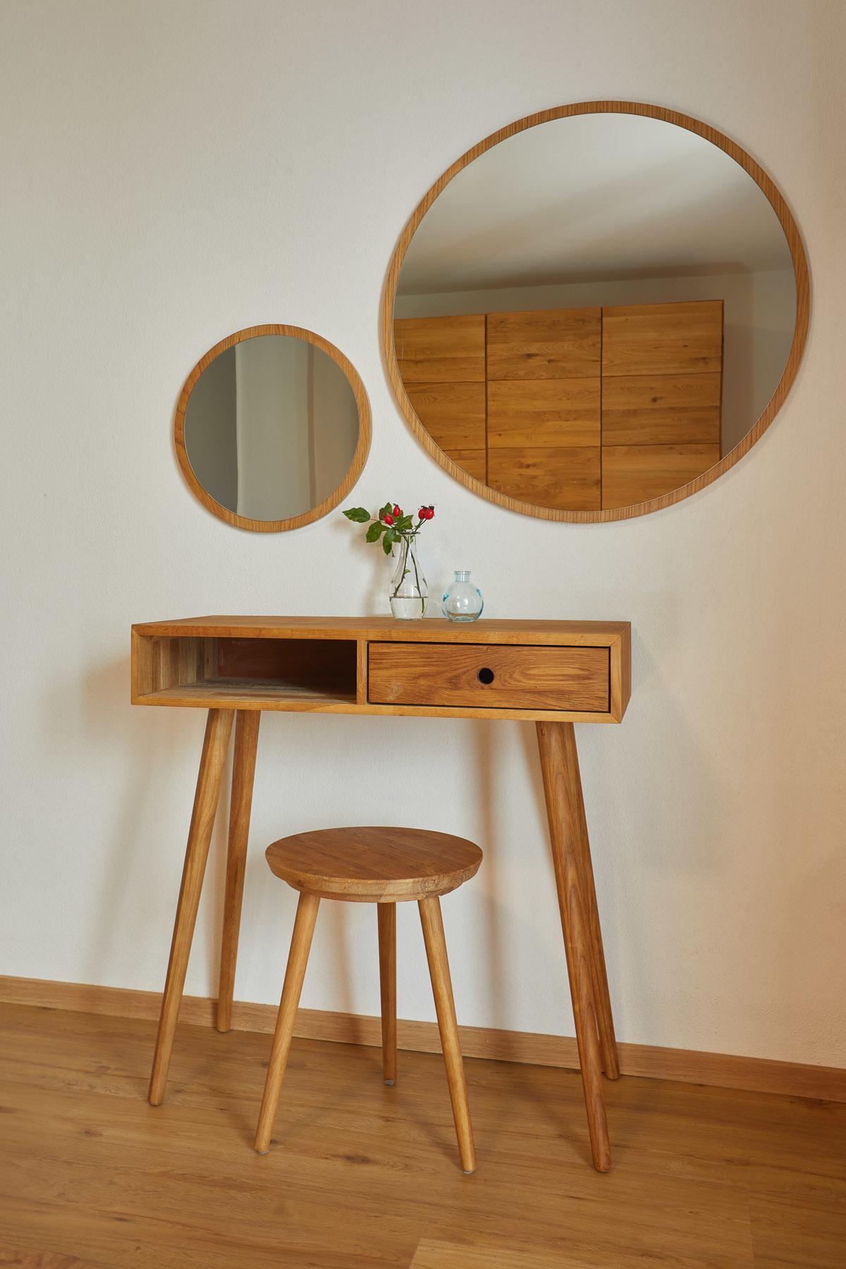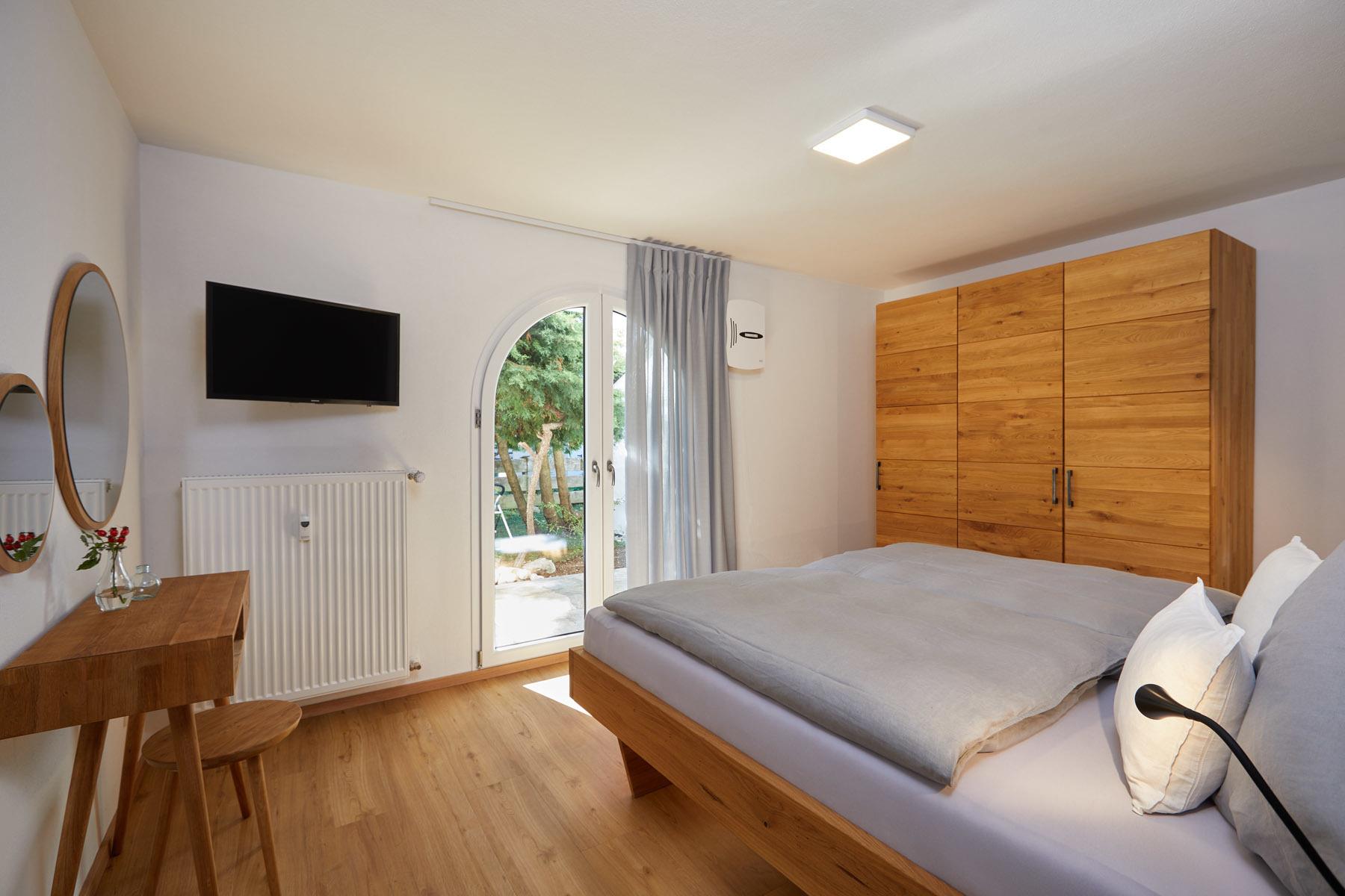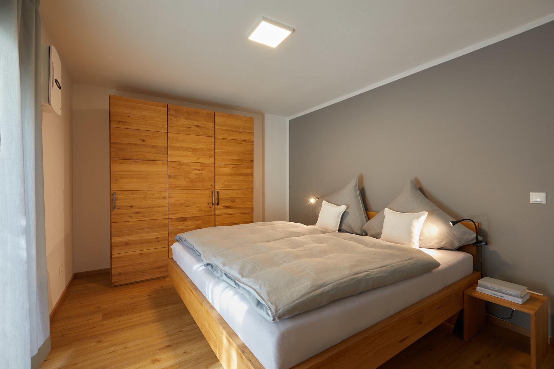 Das Schlafzimmer verfügt über hochwertige Holzmöbel, die eine warme und einladende Atmosphäre schaffen.