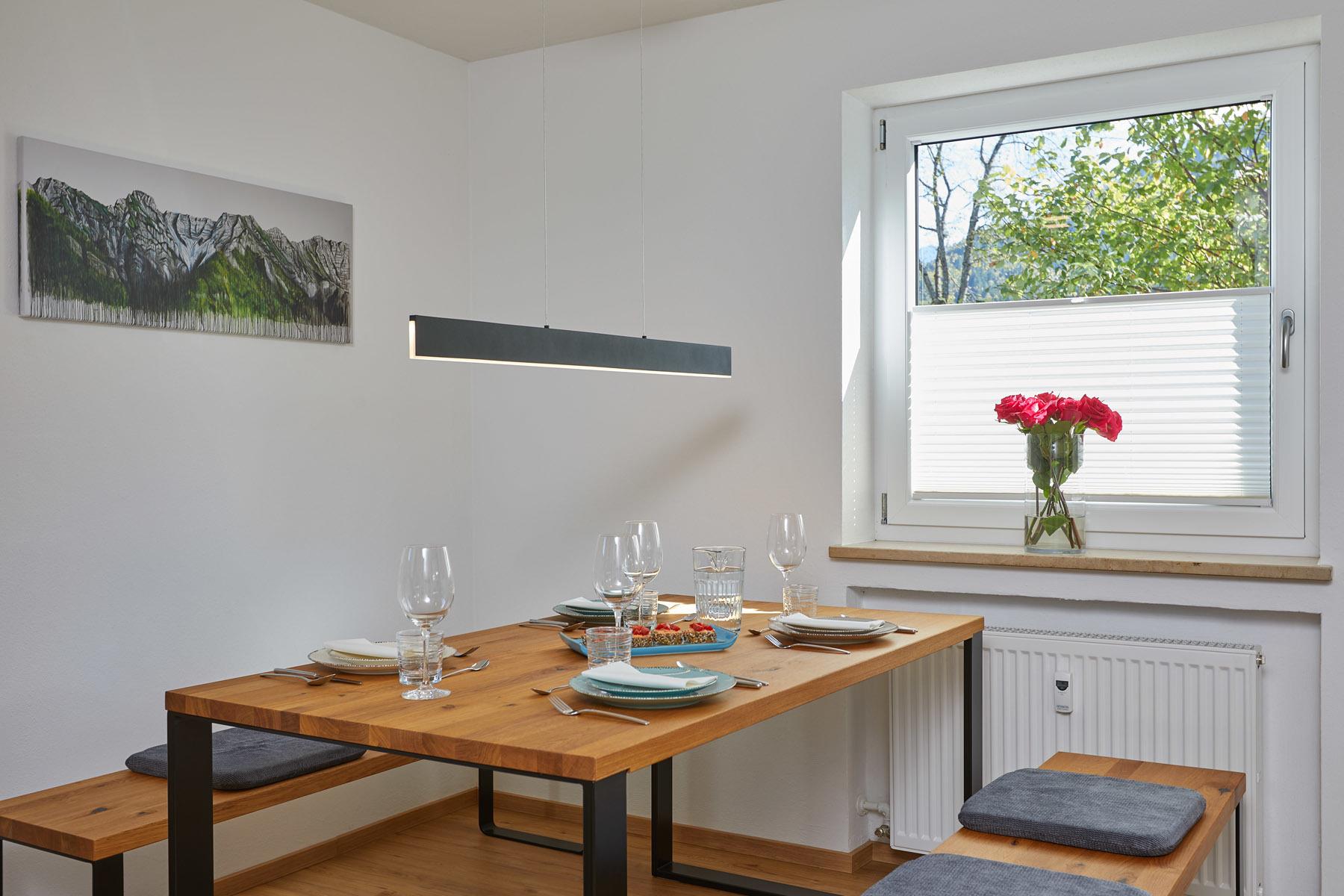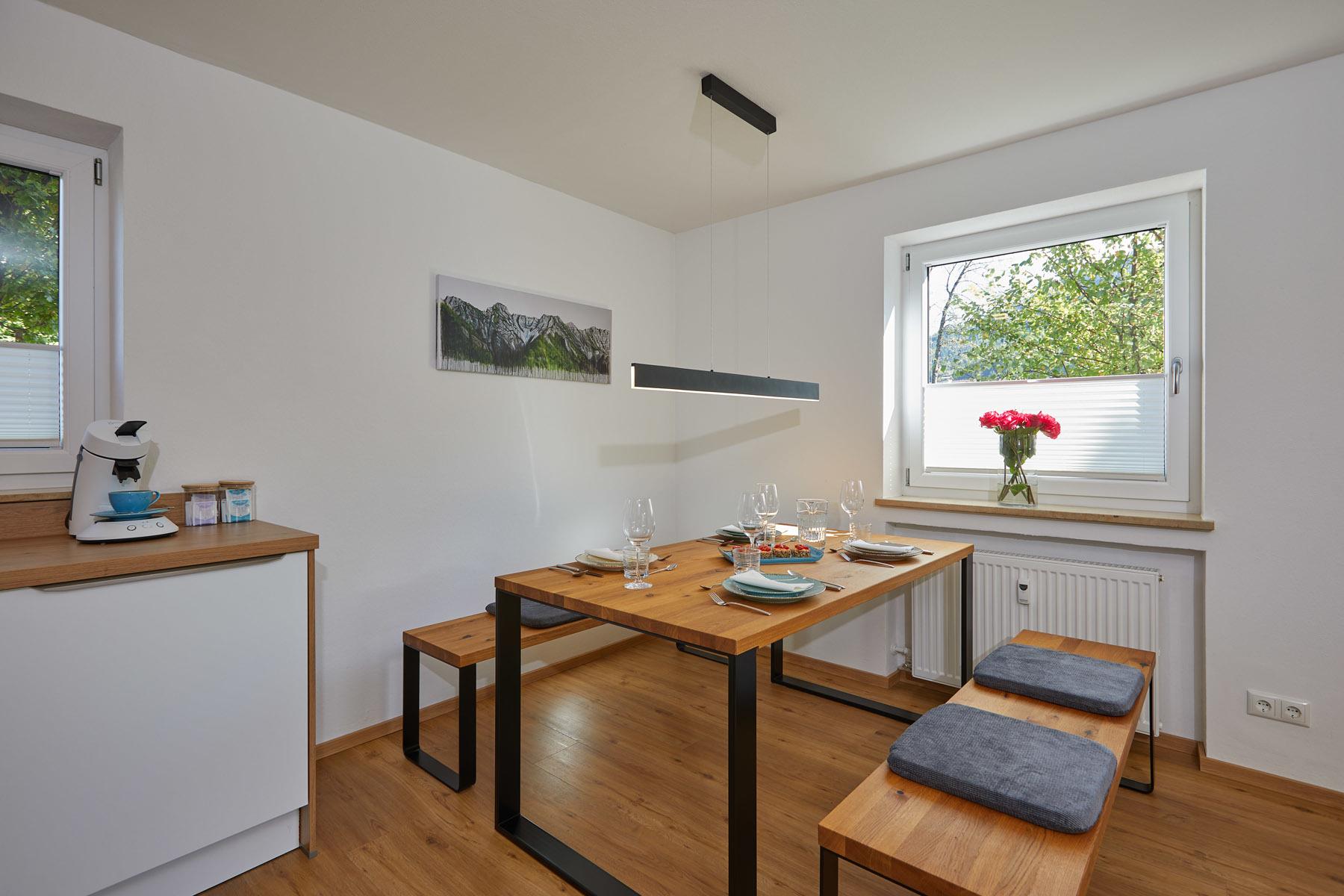 Zwischen Küche und Wohnzimmer gibt einen separaten Essbereich mit einem Tisch und Bänken.