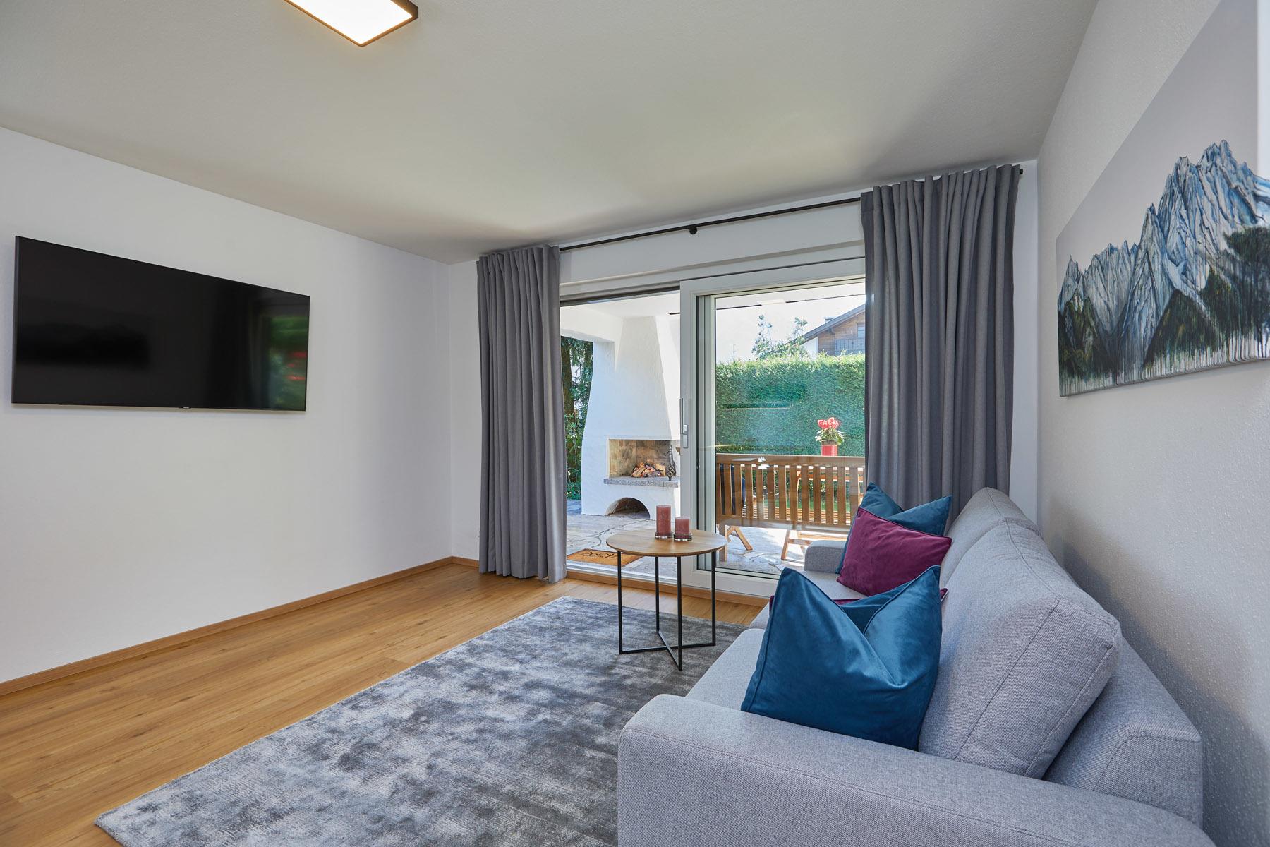 Das Wohnzimmer ist mit einer gemütlichen Couch und einem Couchtisch ausgestattet, ein Smart-TV fähiger LCD-Fernseher sorgt für Unterhaltung.