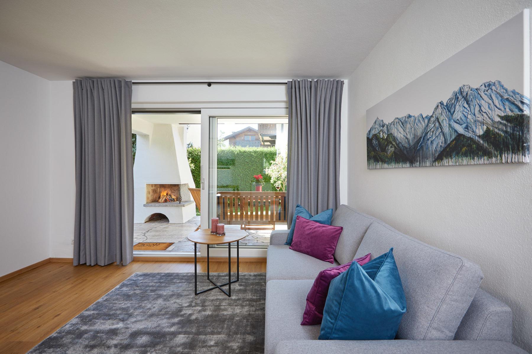 Die Erdgeschosswohnung verfügt über eine wunderschöne Terrasse mit Holzmöbeln und einem gemütlichen Kamin. Der dazugehörige Garten ist nach Südwesten ausgerichtet.