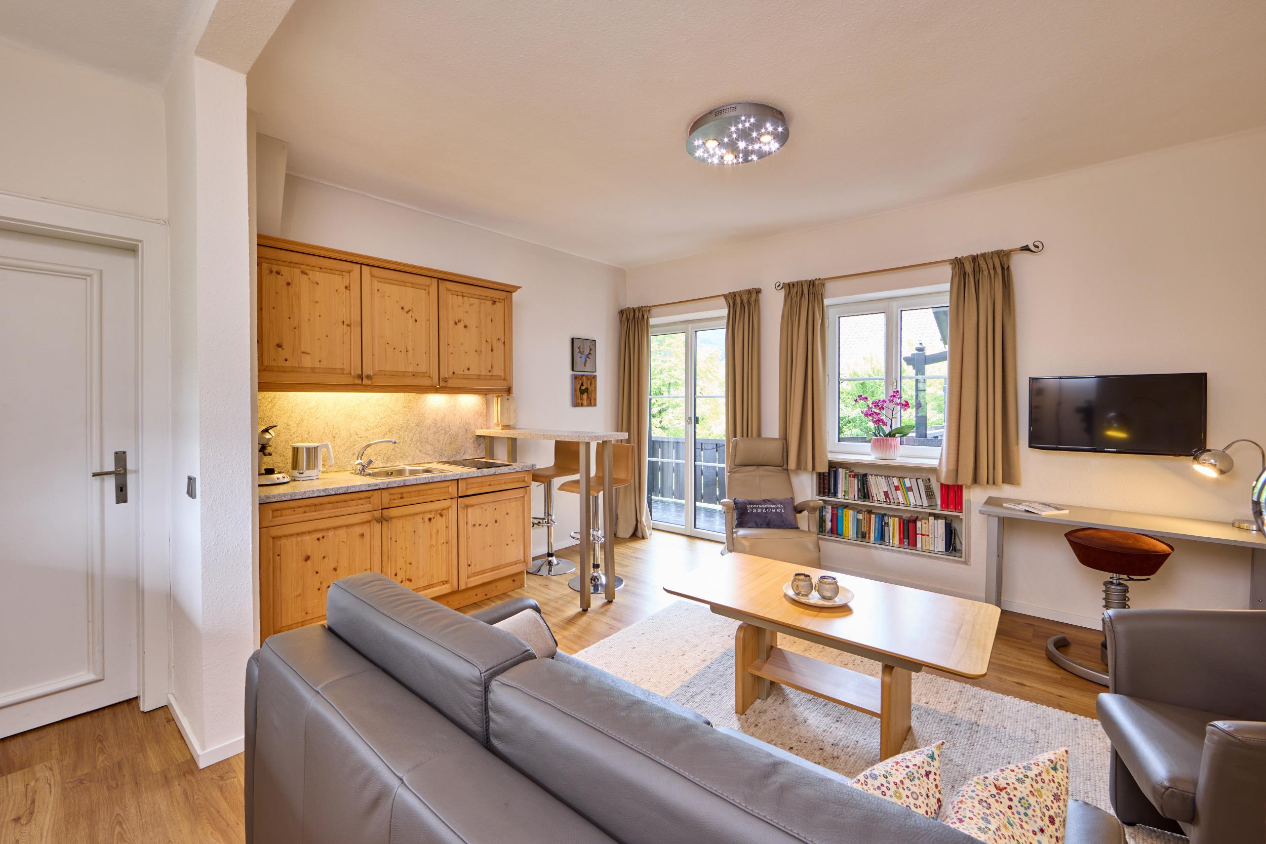 - Ein Doppelzimmer mit Dusche /WC, Wohnbereich mit Kochzeile und TV