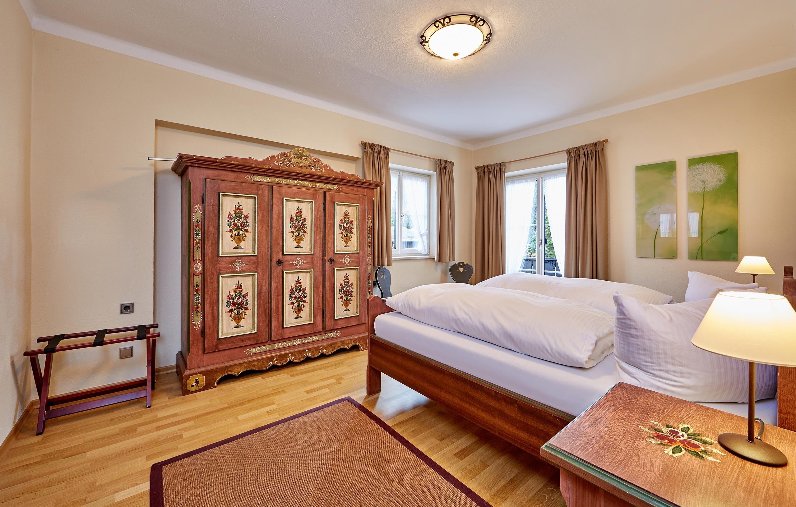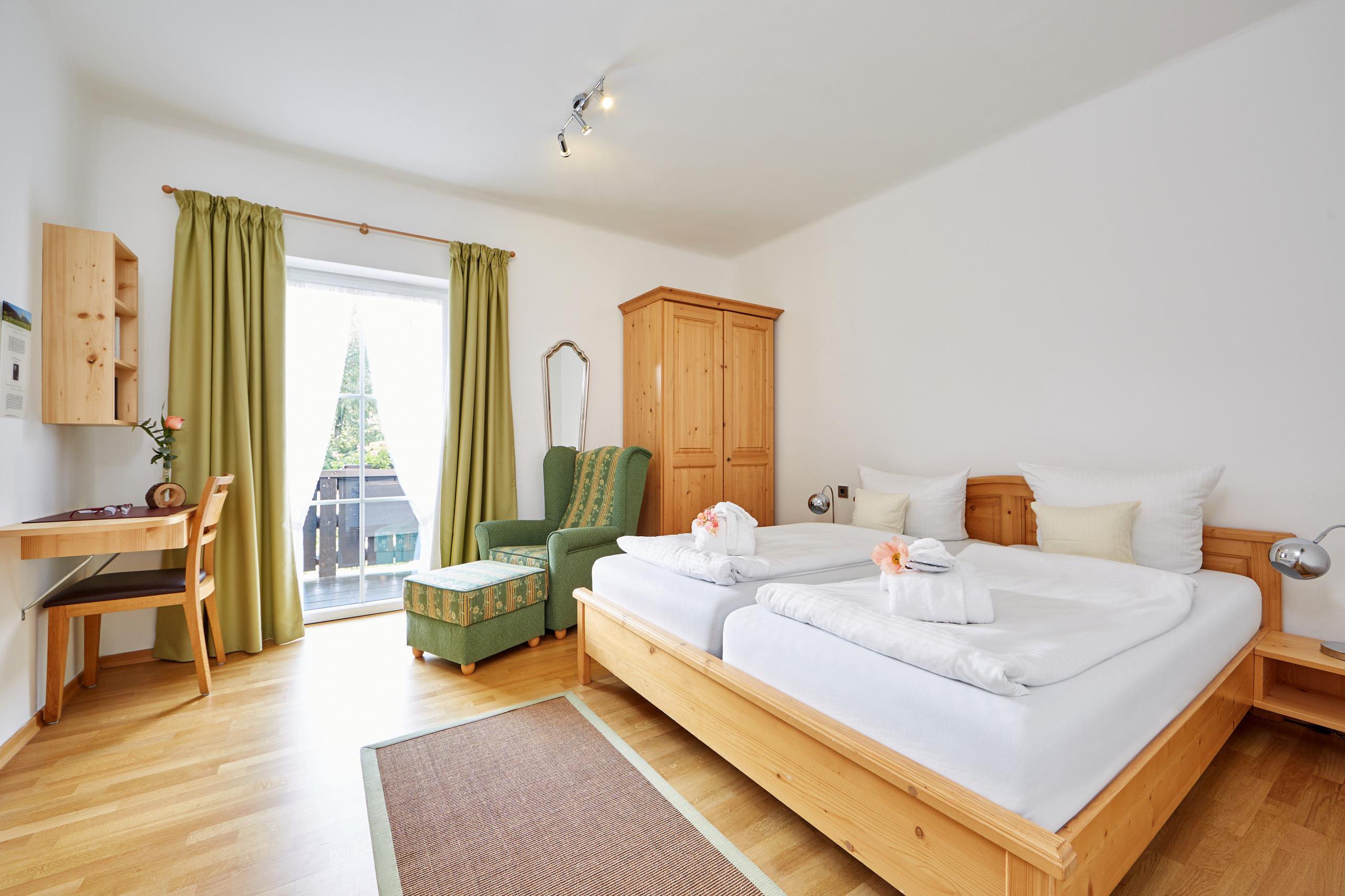 - Ein Doppelzimmer mit Dusche/WC, TV, Balkon mit Bergblick