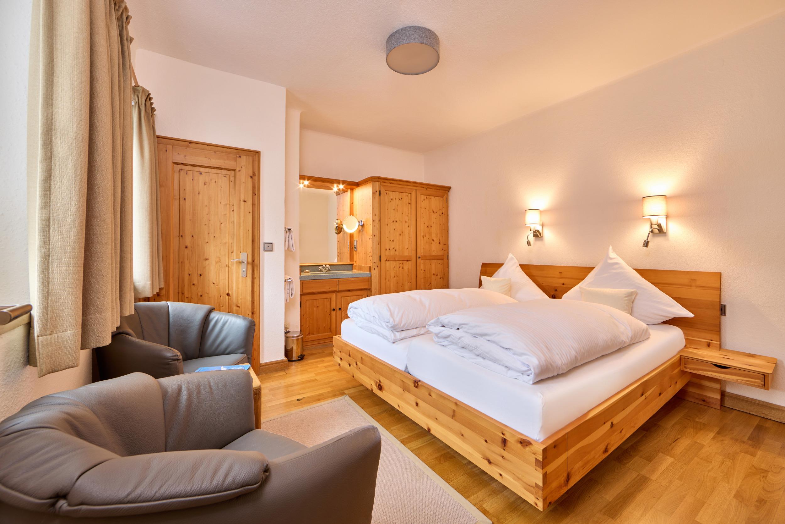 - Ein Doppelzimmer aus Zirbenholz mit eigenem Bad