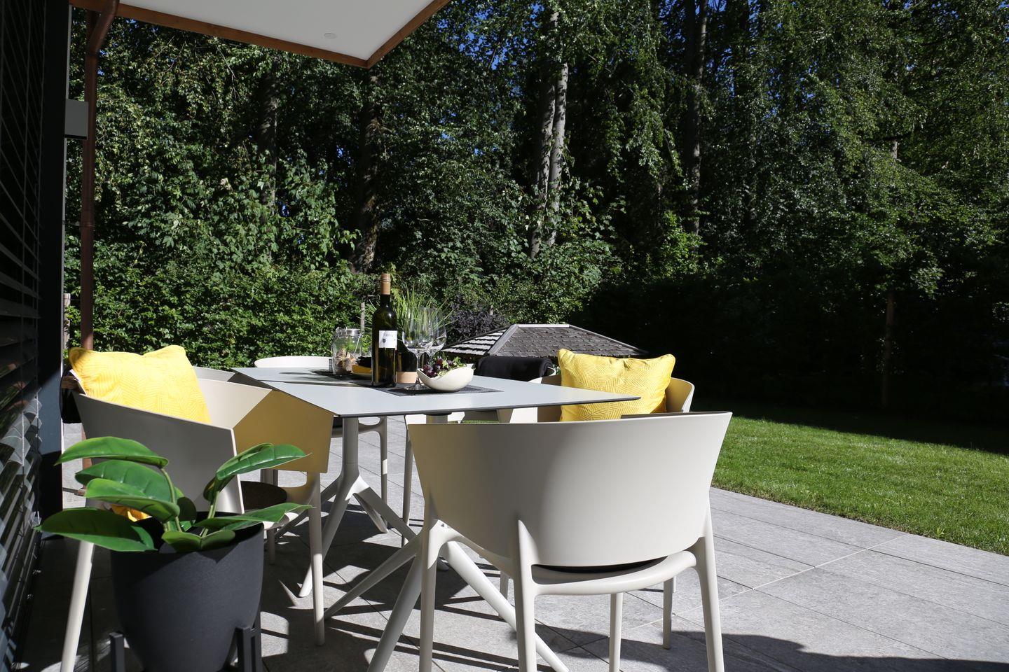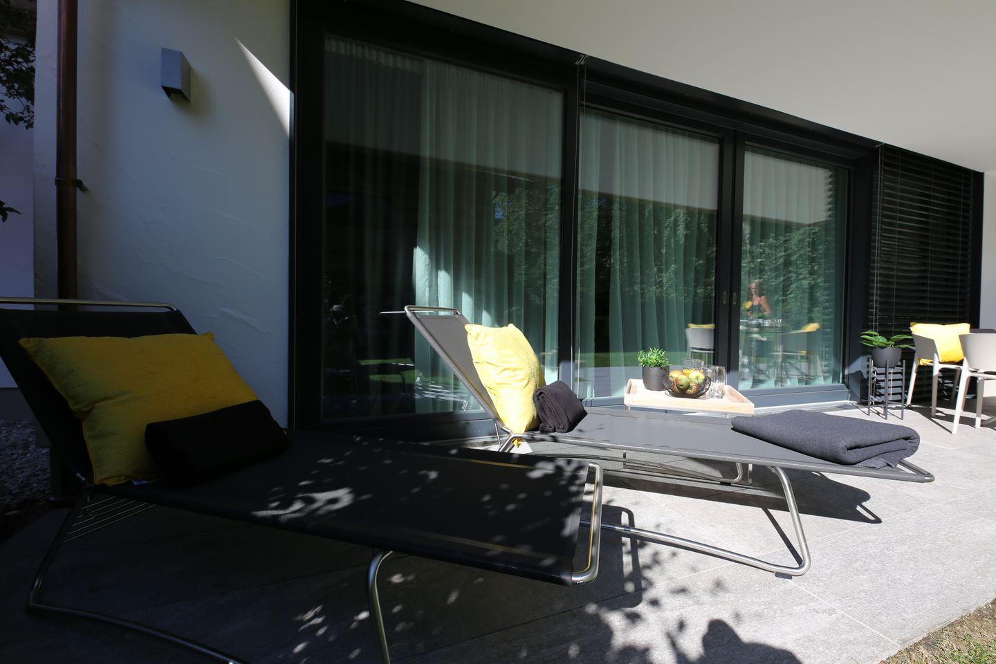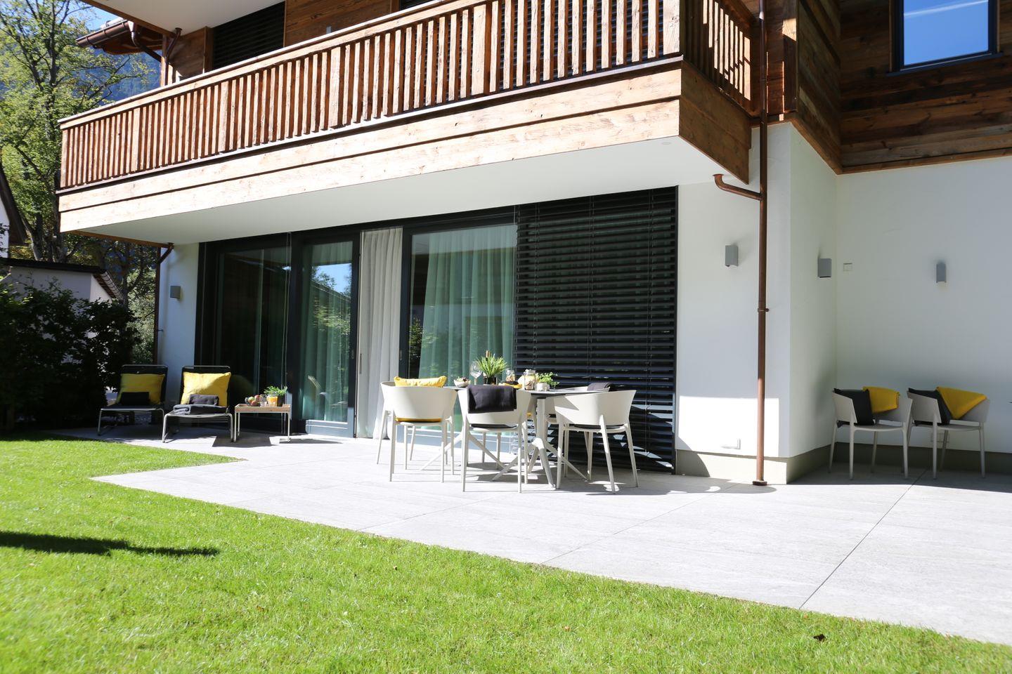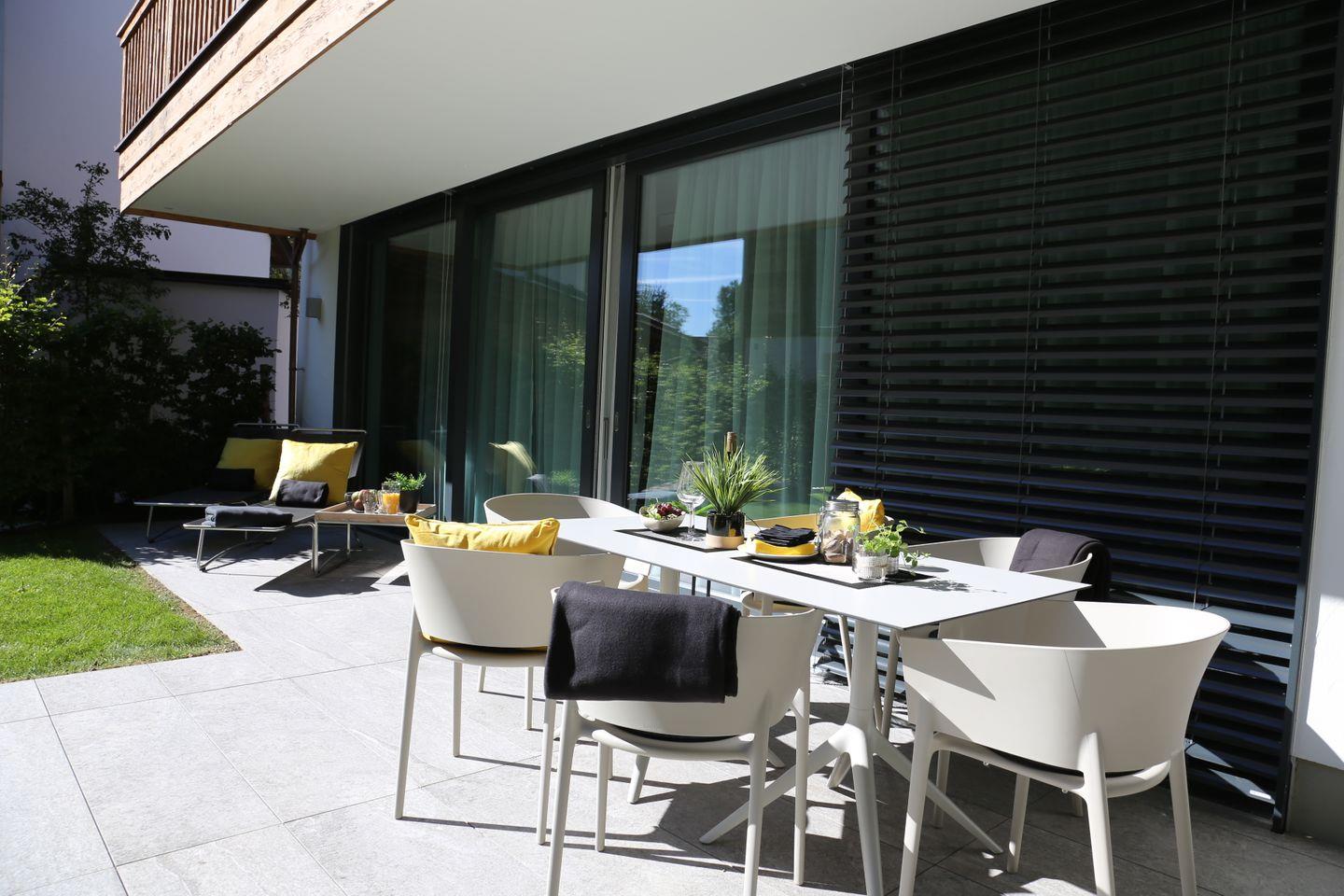 Ein besonderes Highlight bieten Ihnen ein eigener Garten und die umlaufende Terrasse, die zum Verweilen und Durchatmen an der frischen Luft einladen. Für ein gemütliches Beisammensein stehen dort ein großer Tisch und 8 Stühle, sowie 2 Sonnenliegen zur Verfügung.