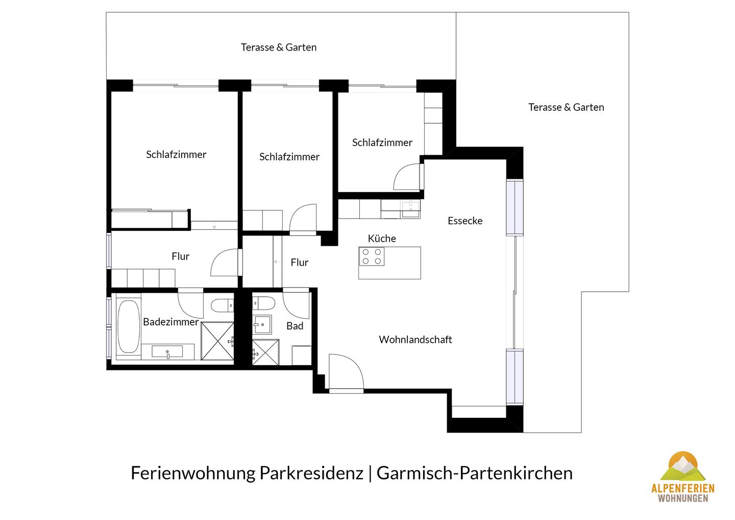 Gleich neben dem Garmisch-Partenkirchener Kurpark liegt diese einzigartige Wohnung im Erdgeschoss eines modernen Neubaus. Auf über 100 qm bietet sie Ihnen mit 3 Schlafzimmern und 2 Bädern ausreichend Platz für 5 Personen.