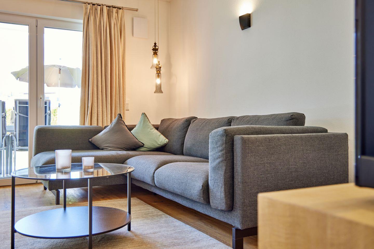 Im Erdgeschoss-Bereich der Wohnung finden Sie das moderne Wohnzimmer mit hochwertigem Sofa, auf dem man sich gerne niederlassen will.
