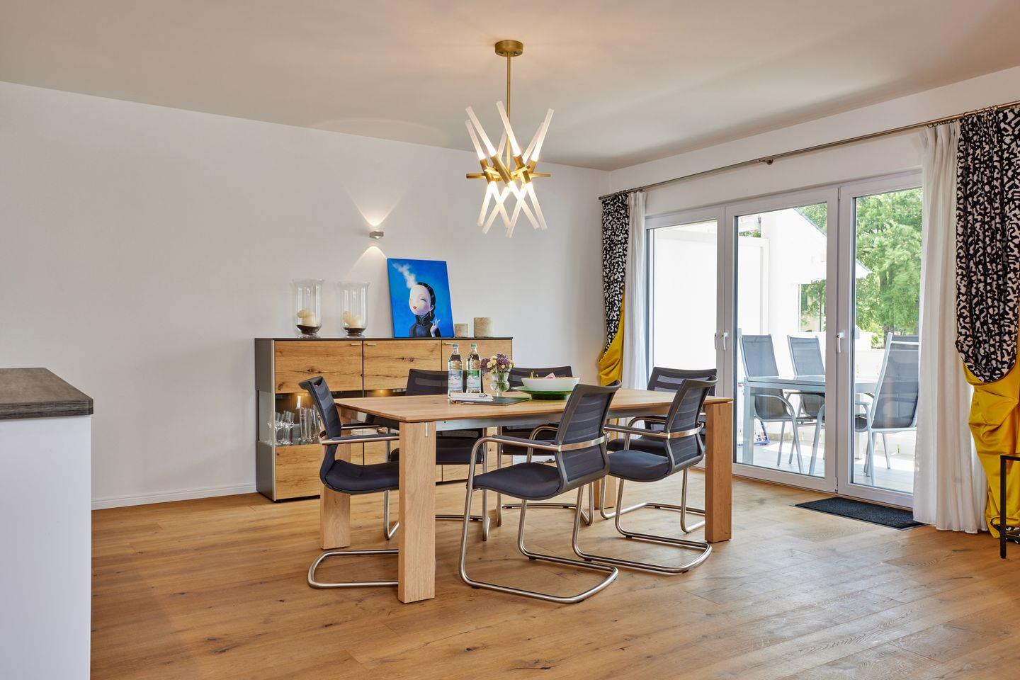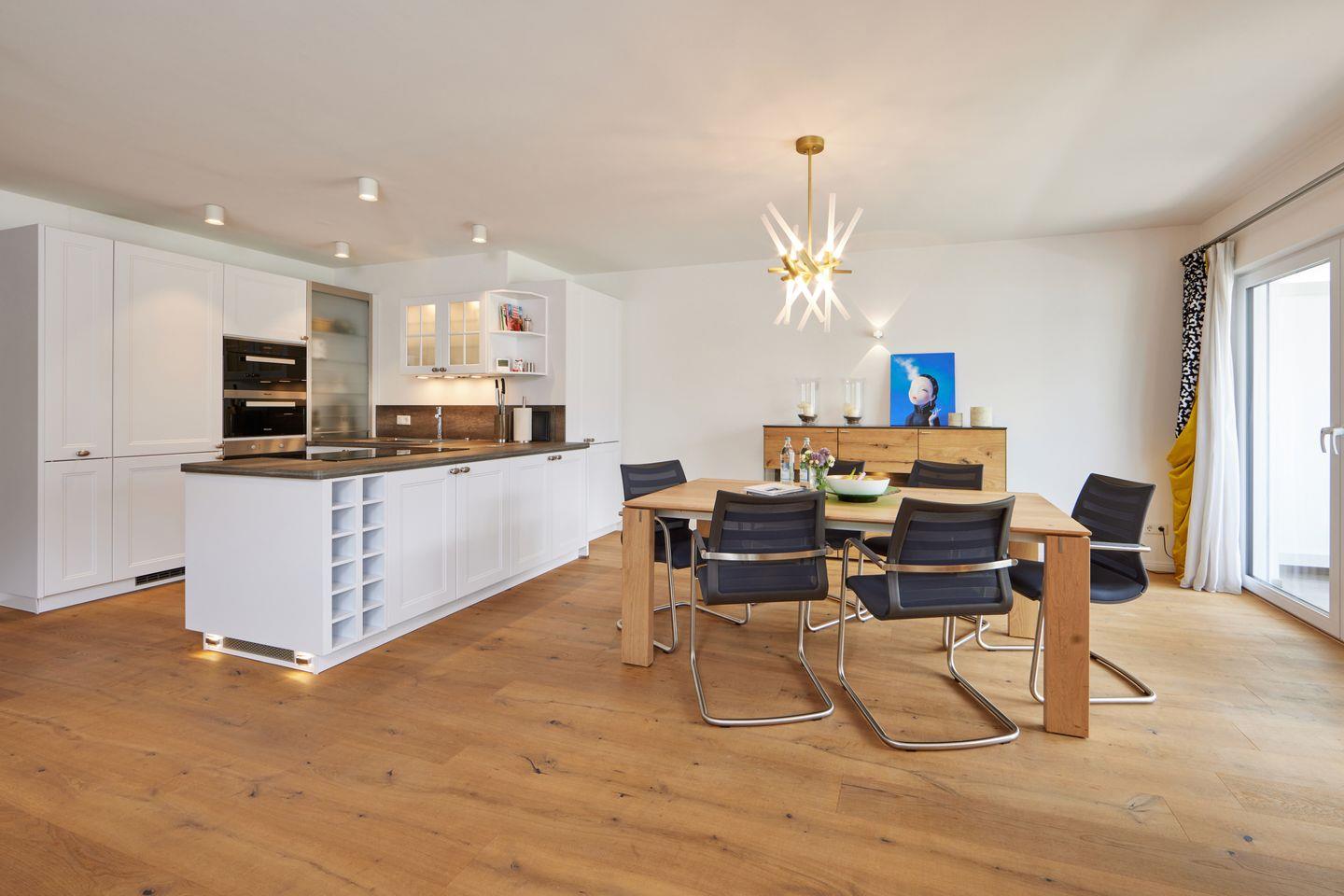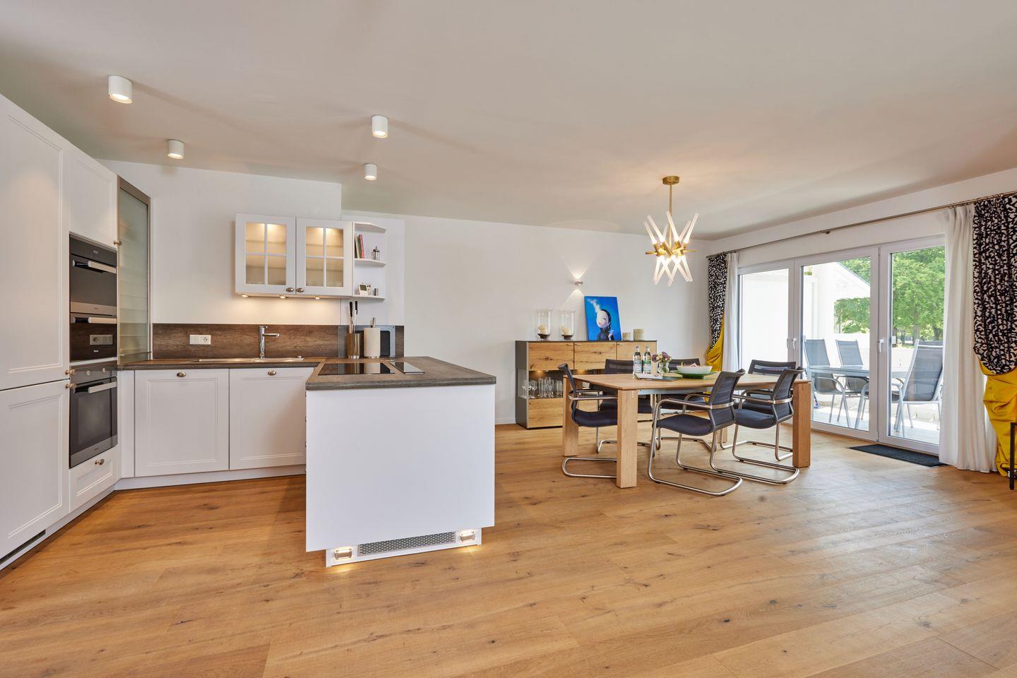 Das Wohnzimmer bietet als besonderes Extra neben den qualitativ hochwertigen Möbeln einen Kamin - knisterndes Feuer im Winter, wem wird da nicht warm ums Herz? Während ein Teil der Familie die Füße hoch legt, kann sich der andere Teil in der offenen Küche austoben. Modernste Technik lassen das Herz eines jeden Hobbykochs höher schlagen. Die Küche ist voll ausgestattet. Neben dem Backofen verfügen Sie auch über einen Dampfgarer! Machen Sie sich in dem hochwertigen Standmixer morgens Ihren Smoothie oder nutzen Sie die Nespresso-Maschine für den perfekten Start in den Tag!