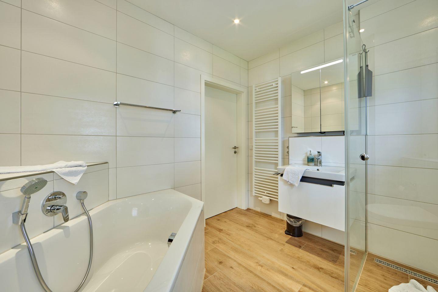 Das Badezimmer ist sehr geräumig und bietet neben einer Eckbadewanne eine große ebenerdige Dusche separat. Handtuchtrockner und Haarföhn sind ebenfalls vorhanden. Nicht nur im Badezimmer, sondern in der ganzen Wohnung sorgt die Fußbodenheizung für angenehme Wärme!