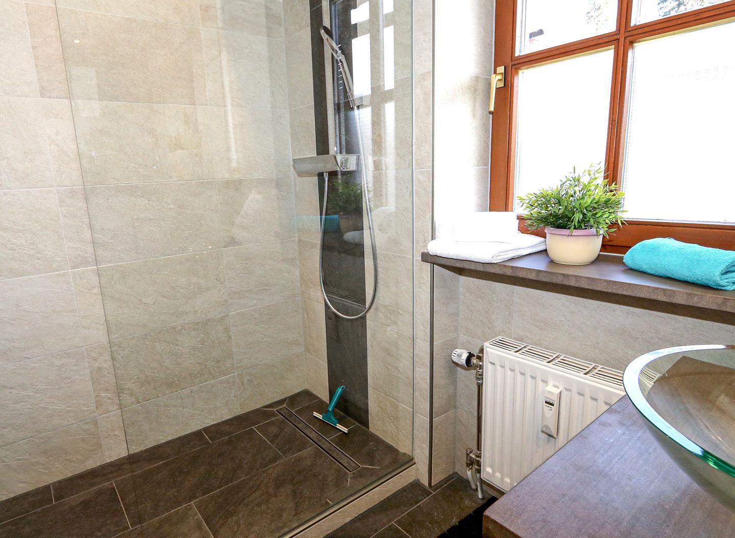 Das moderne Badezimmer im 1. OG verfügt über eine ebenerdige Dusche. Ein Föhn ist vorhanden.