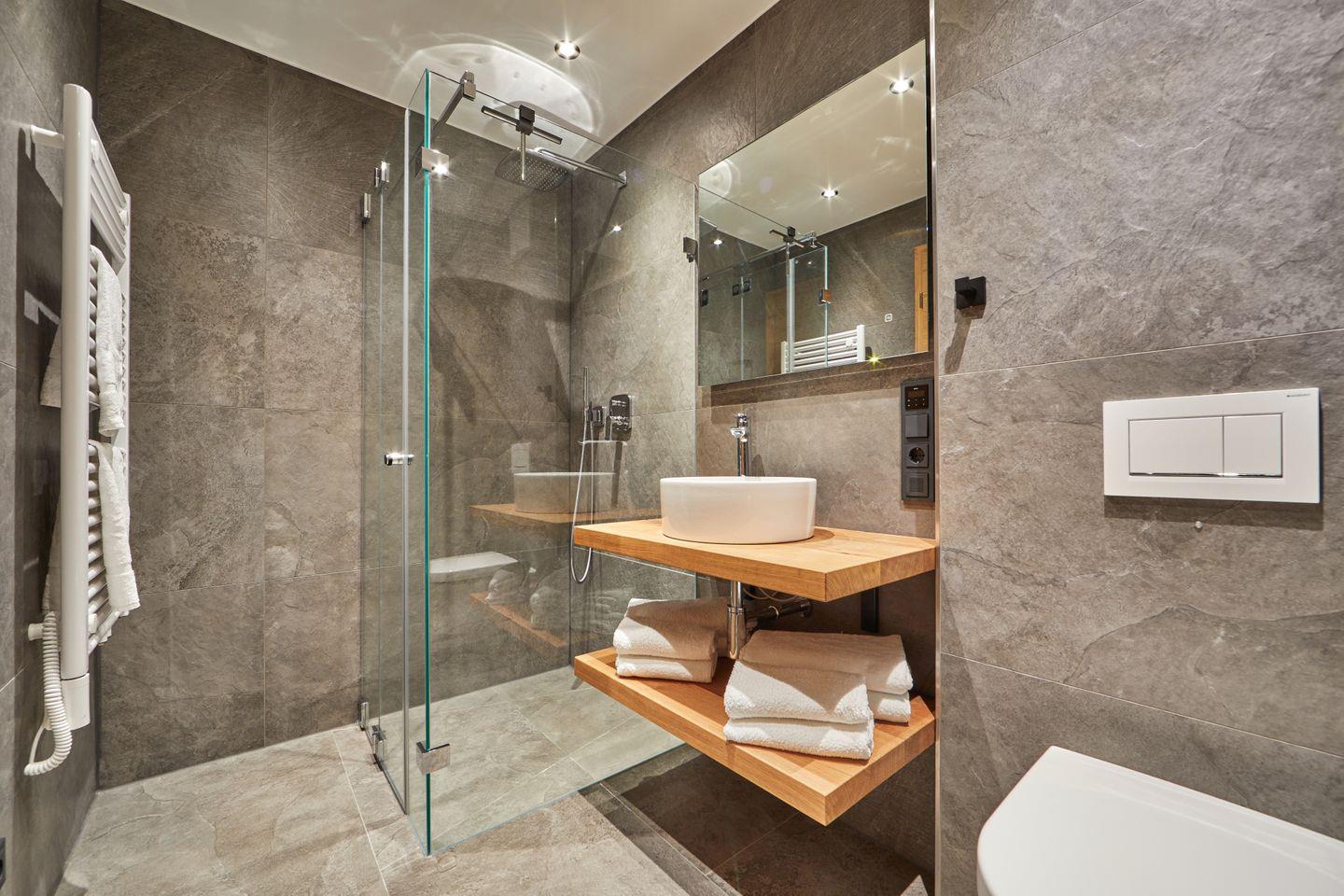 Das Badezimmer mit einer ebenerdigen Dusche mit Regenwald-Kopfbrause erfrischt Sie nach einem erlebnisreichen Tag. Als Highlight befindet sich direkt oberhalb des Waschbeckens ein beheizbarer Spiegel. Dieser sorgt auf Knopfdruck zu jeder Zeit für einen klaren Blick.