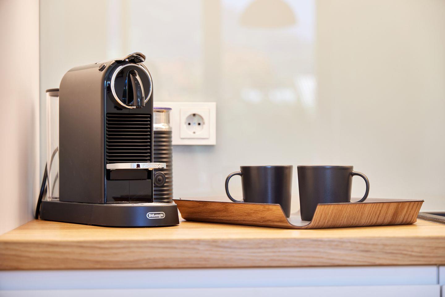 Die Küche erstrahlt in einem schlichten, modernen Design und ist neben Backofen, Geschirrspüler, Kühlschrank mit Gefrierfach und Kaffeemaschine auch mit allen weiteren gängigen Utensilien ausgestattet, die man zum Kochen benötigt.
