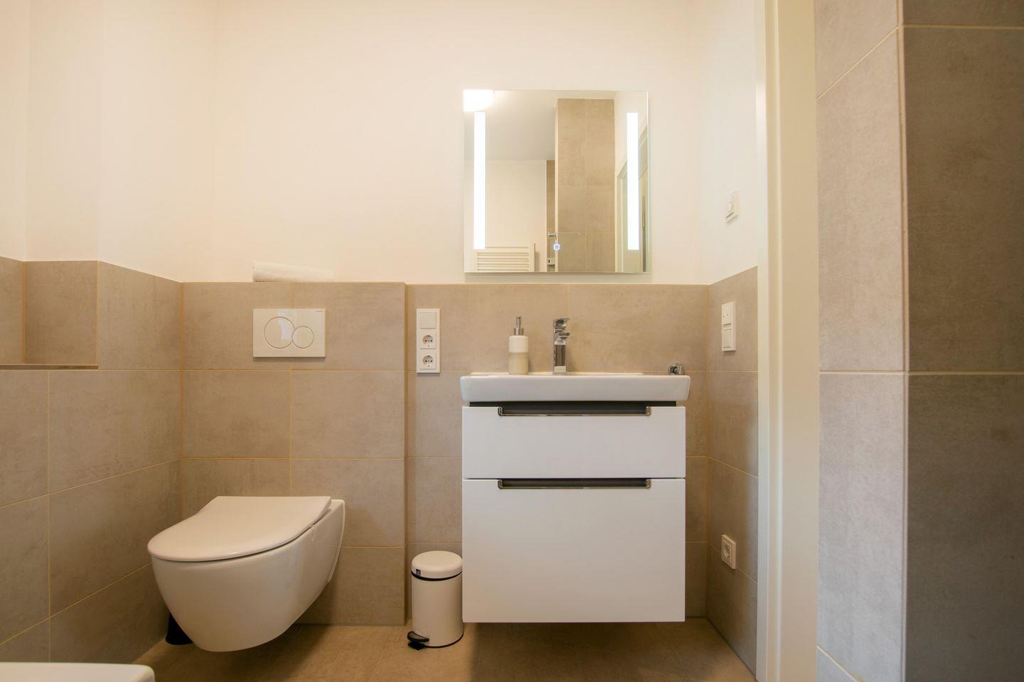 Die Küche erstrahlt in einem schlichten, modernen Design und ist neben Backofen, Geschirrspüler, Kühlschrank mit Gefrierfach und Kaffeemaschine auch mit allen weiteren, gängigen Utensilien ausgestattet.