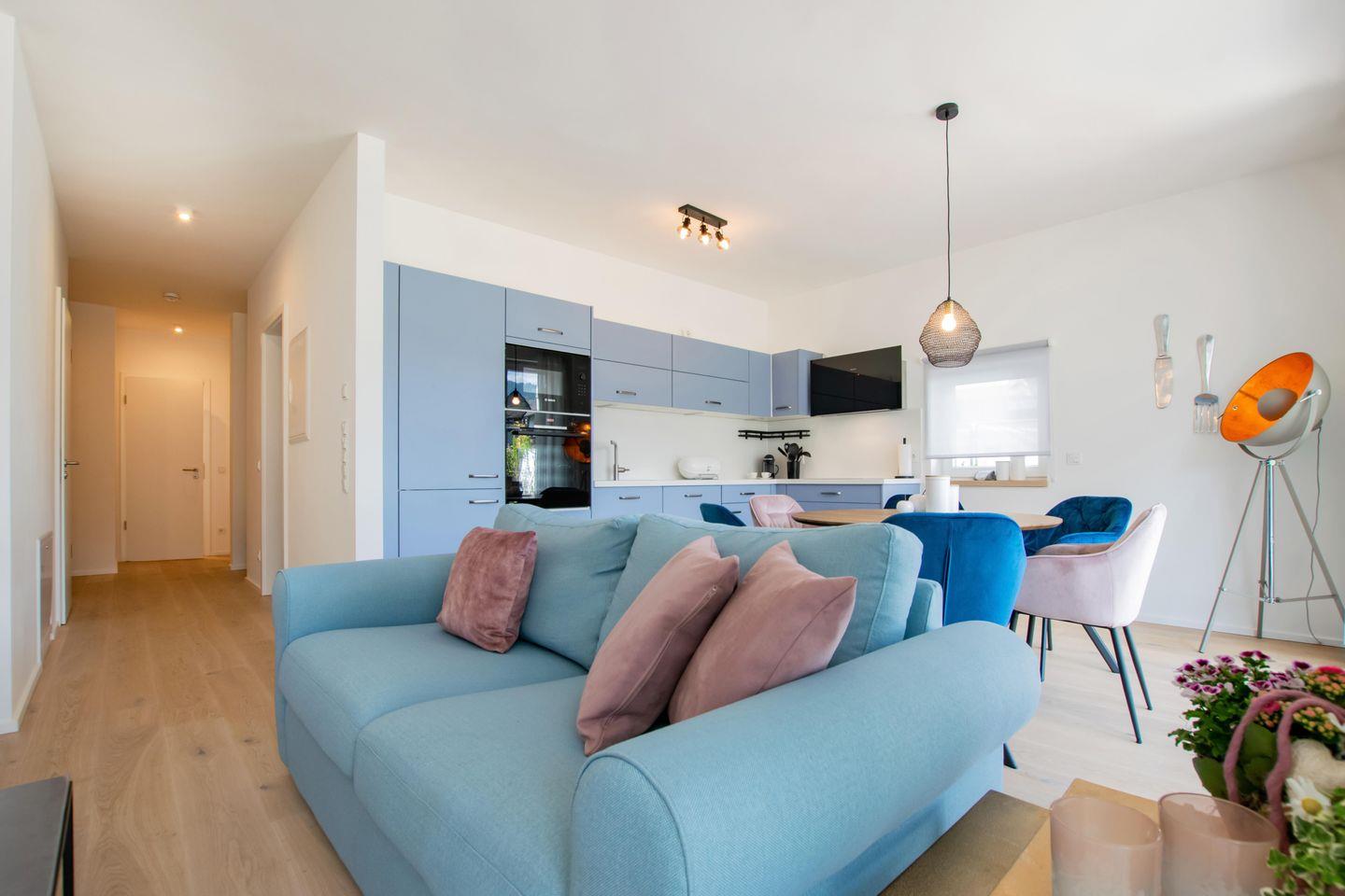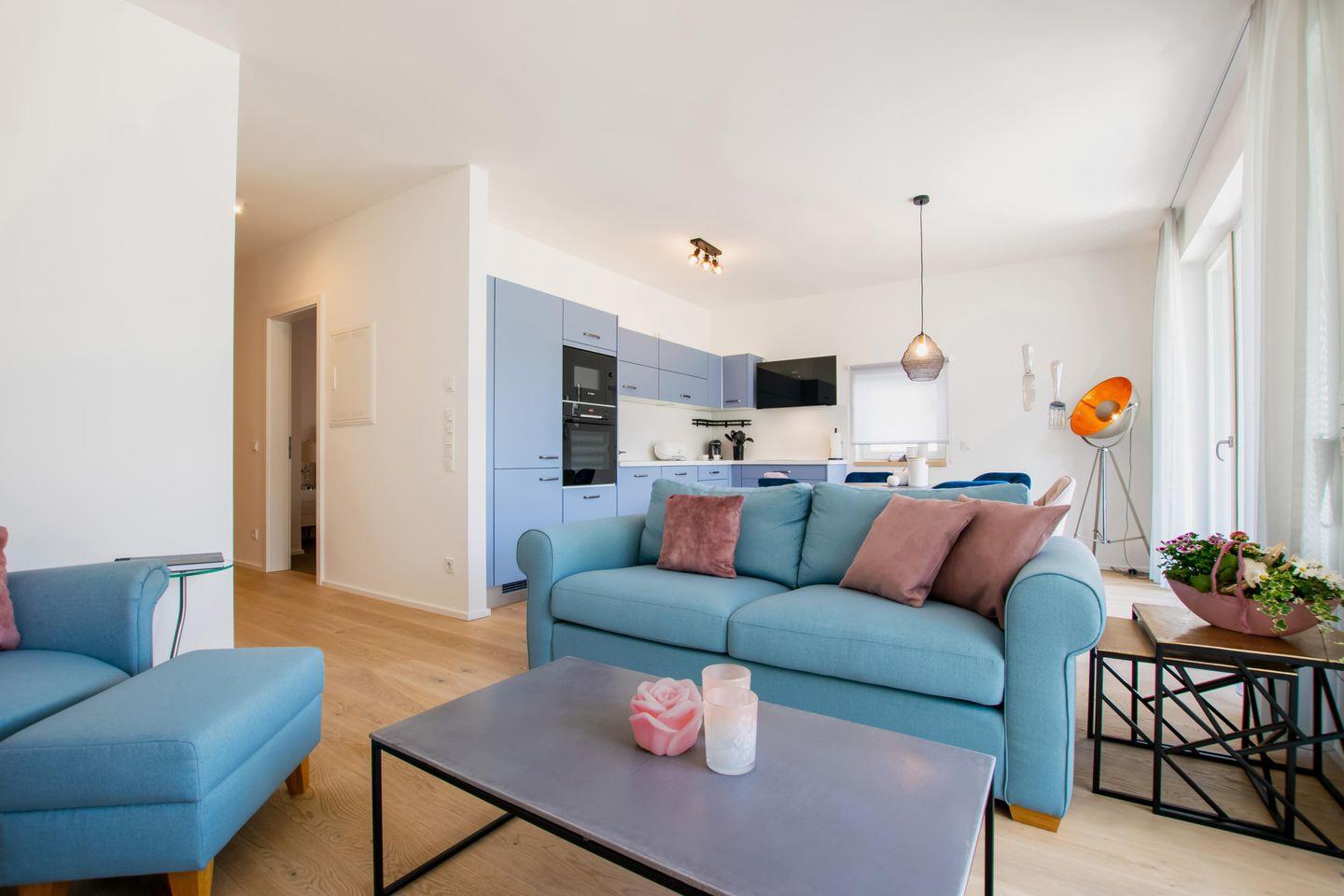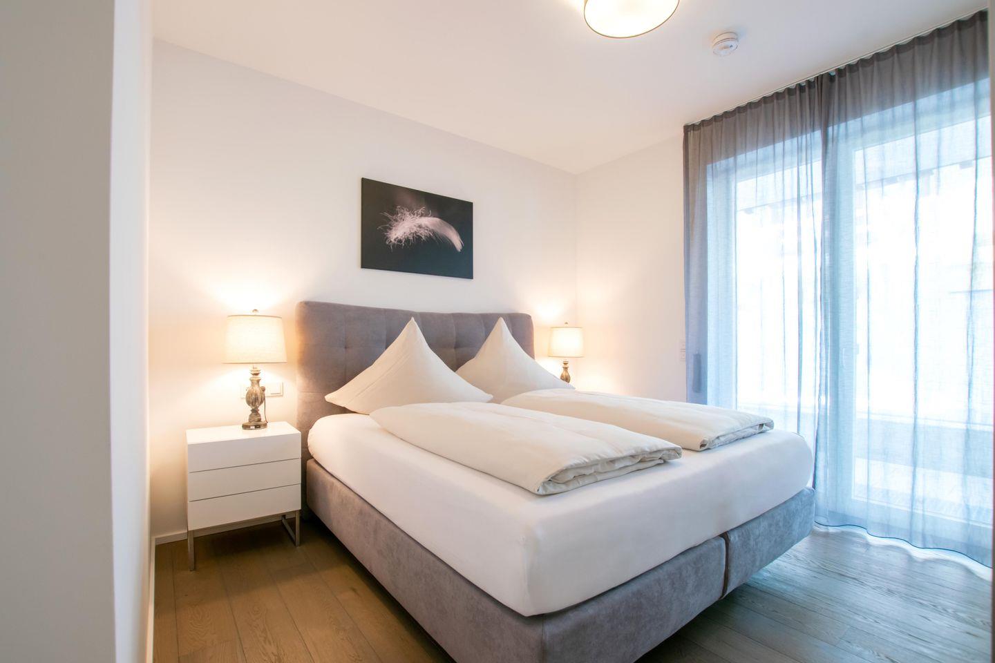 Die 3 Schlafzimmer und 3 Bäder halten genug Platz für bis zu 6 Personen bereit. Eine hochwertige Ausstattung in schicken Farbtönen, in Kombination mit hellen Räumen und modernen Akzenten, gibt der Wohnung einen schlichten, aber gehobenen Charme.
