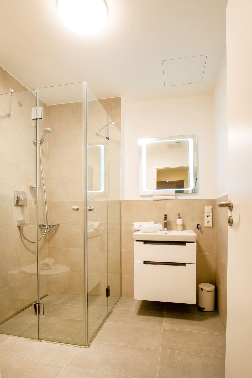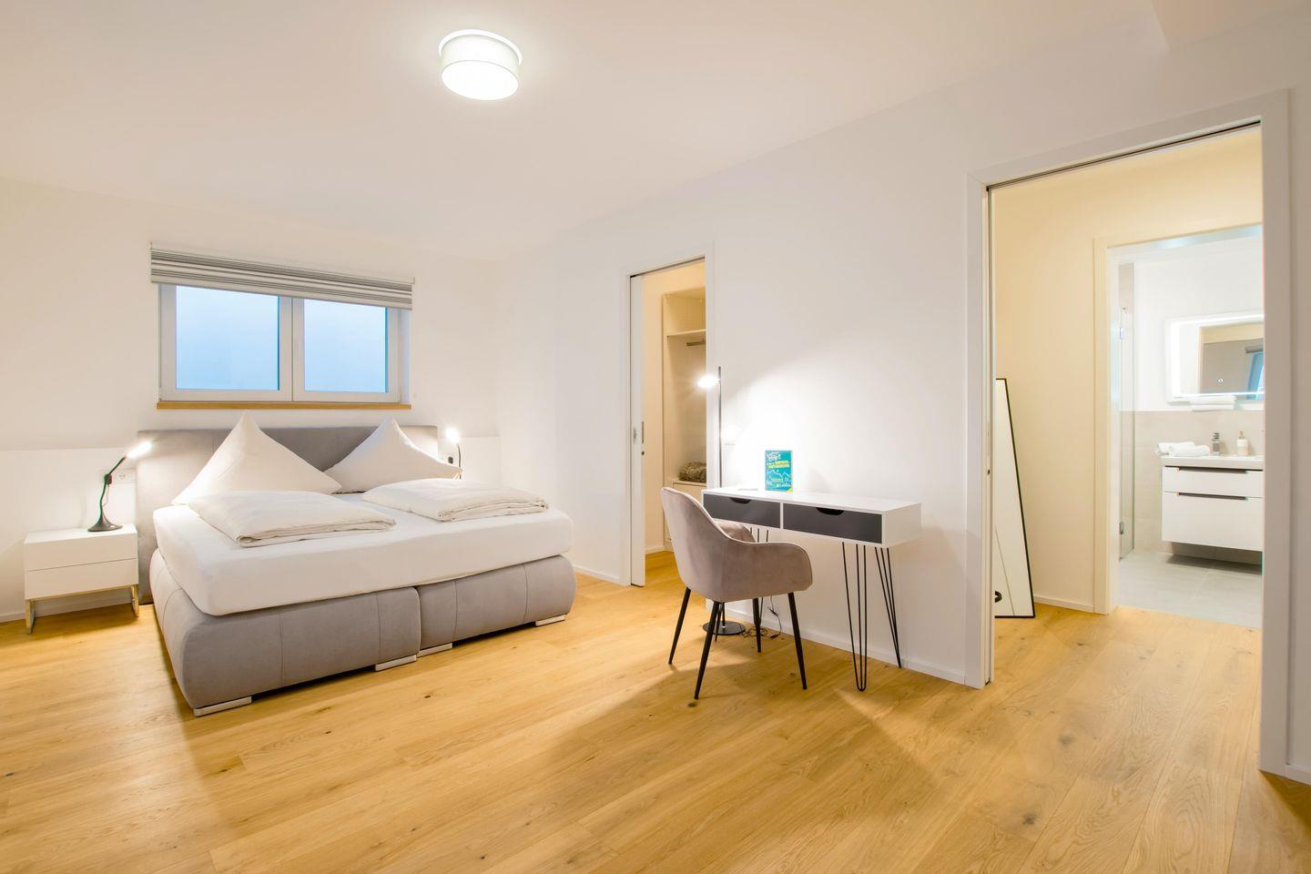 Über eine Treppe gelangen Sie ins Untergeschoss, wo Sie neben einem weiteren großen Schlafzimmer mit Doppelbett und begehbarem Kleiderschrank auch ein weiteres Bad mit Dusche erwartet. Ein zweiter Wohnungseingang ermöglicht über eine kleine Ankleide direkten Zugang zum Untergeschoss.