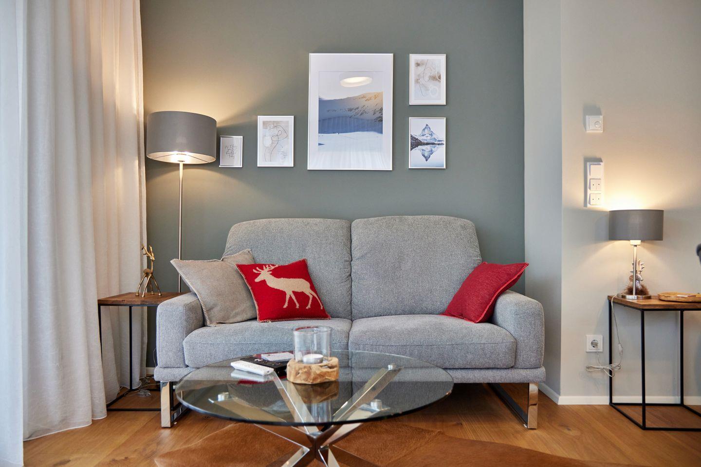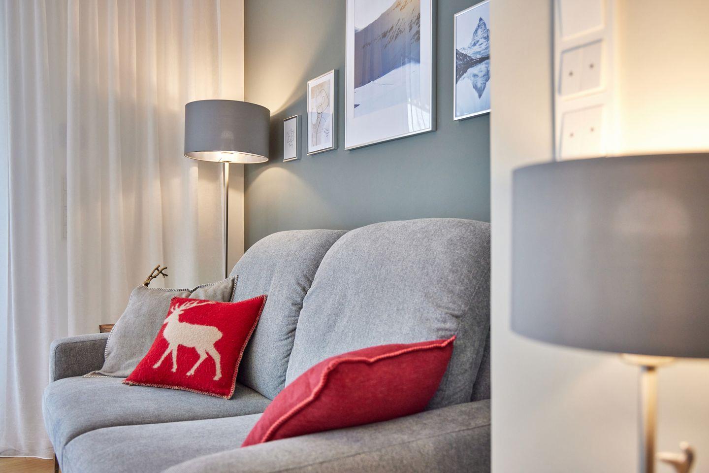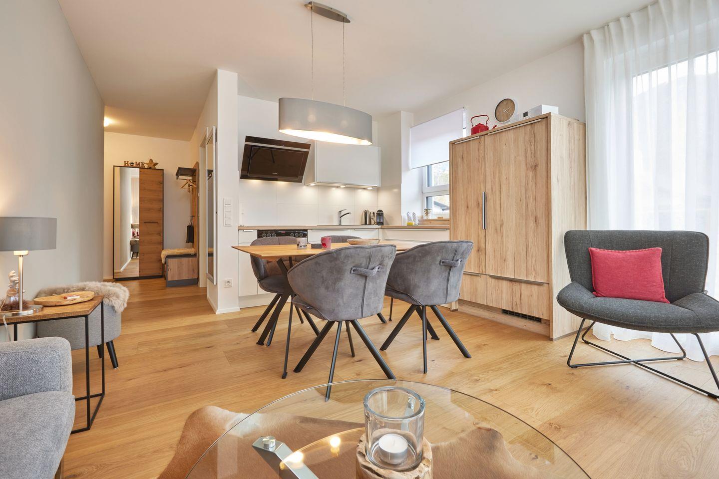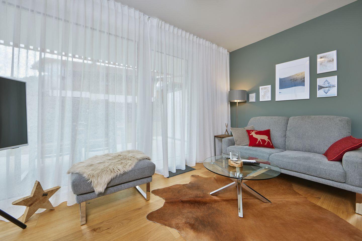 Im offen gestalteten Wohnraum finden Sie zum Entspannen eine kuschelige Sitzecke mit bequemem Sofa, Sessel und Flachbild-TV, und zum gemütlichen Zusammensitzen einen einladenden Esstisch. Bodentiefe Fenster lassen viel Licht in die Wohnung und ermöglichen direkten Zugang zur sonnigen Terrasse.