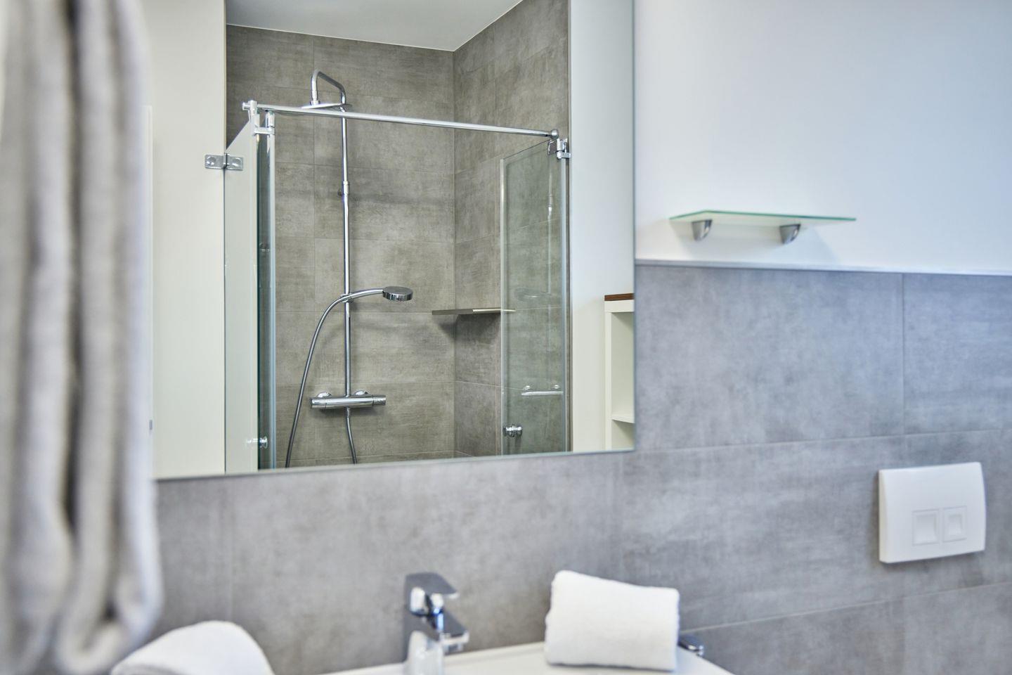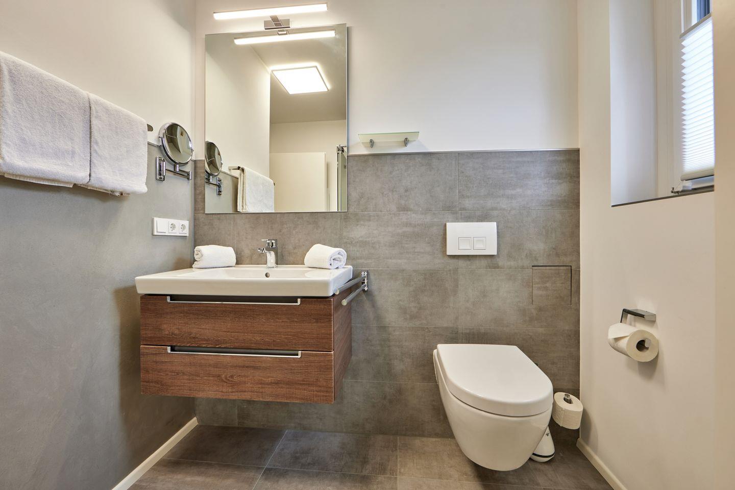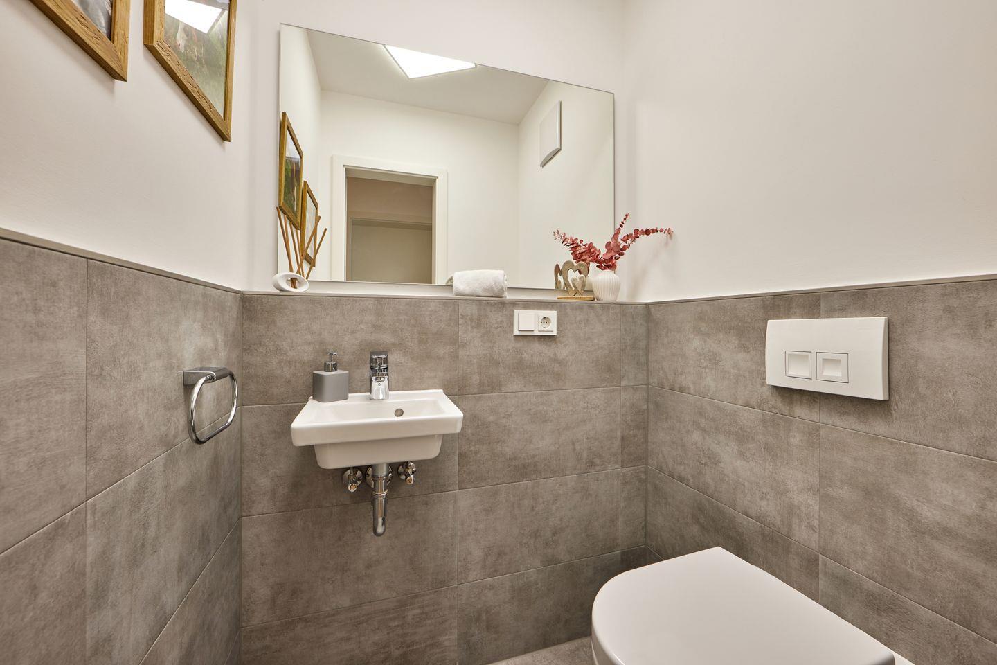 Das helle Tageslicht-Badezimmer ist mit einer verglasten, ebenerdigen Dusche, Waschbecken und WC ausgestattet. Zusätzlich verfügt die Wohnung über ein separates Gäste-WC.