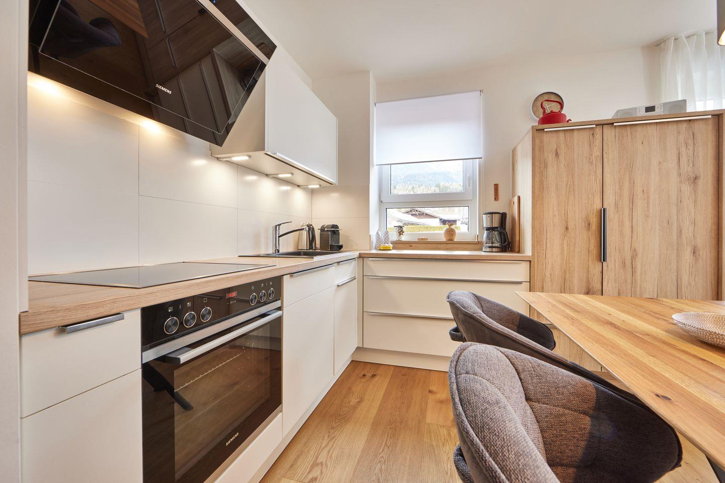 Die moderne Küchenzeile ist zum Wohnraum hin offen und voll bestückt. Hier finden Sie neben Kühlschrank, Herd und Backofen auch Kaffeemaschine, Wasserkocher, Toaster und alle gängigen Kochutensilien, die zu einer gut ausgestatteten Küche gehören.