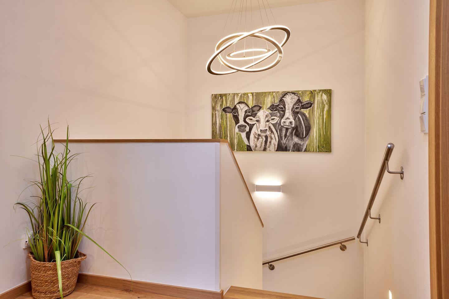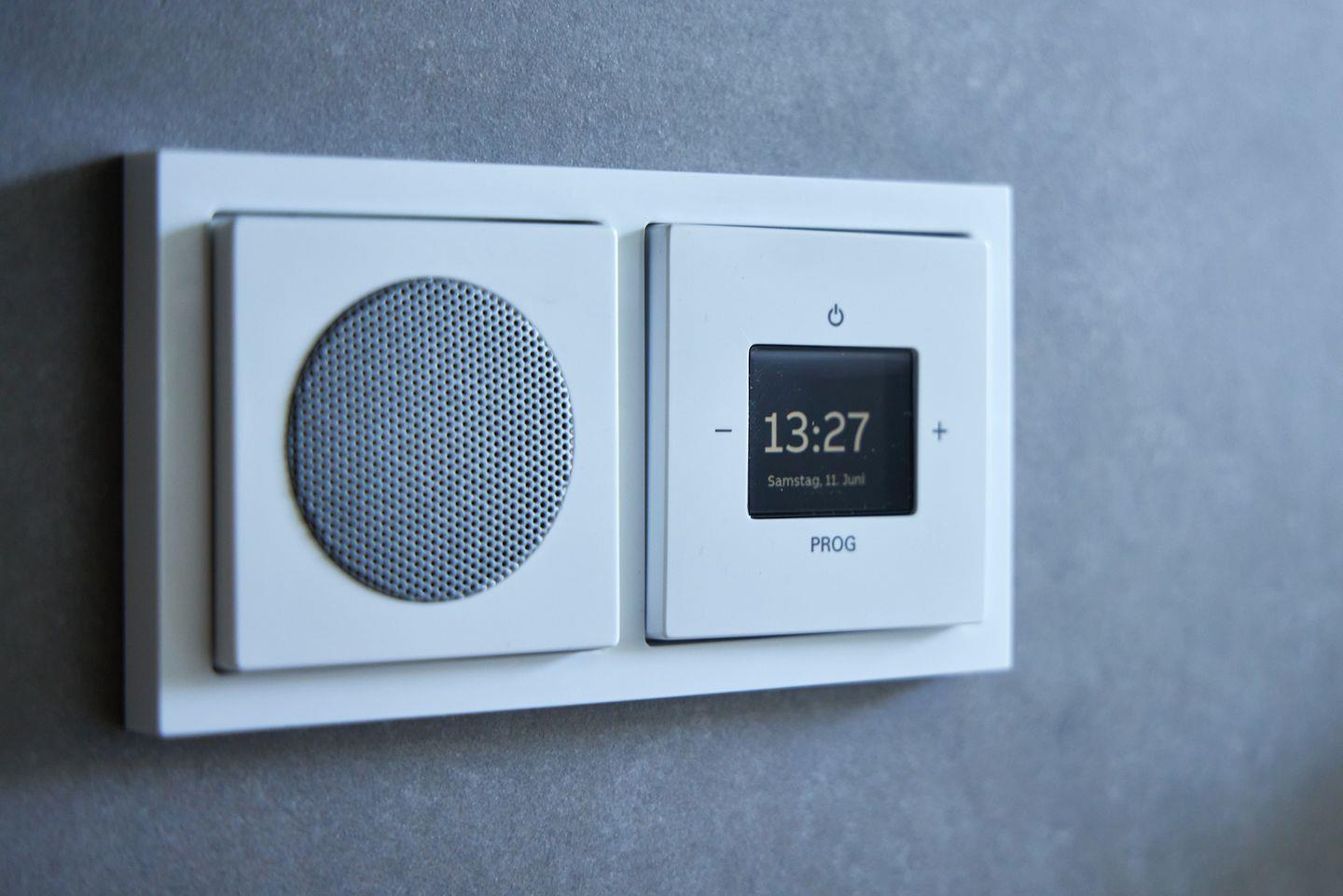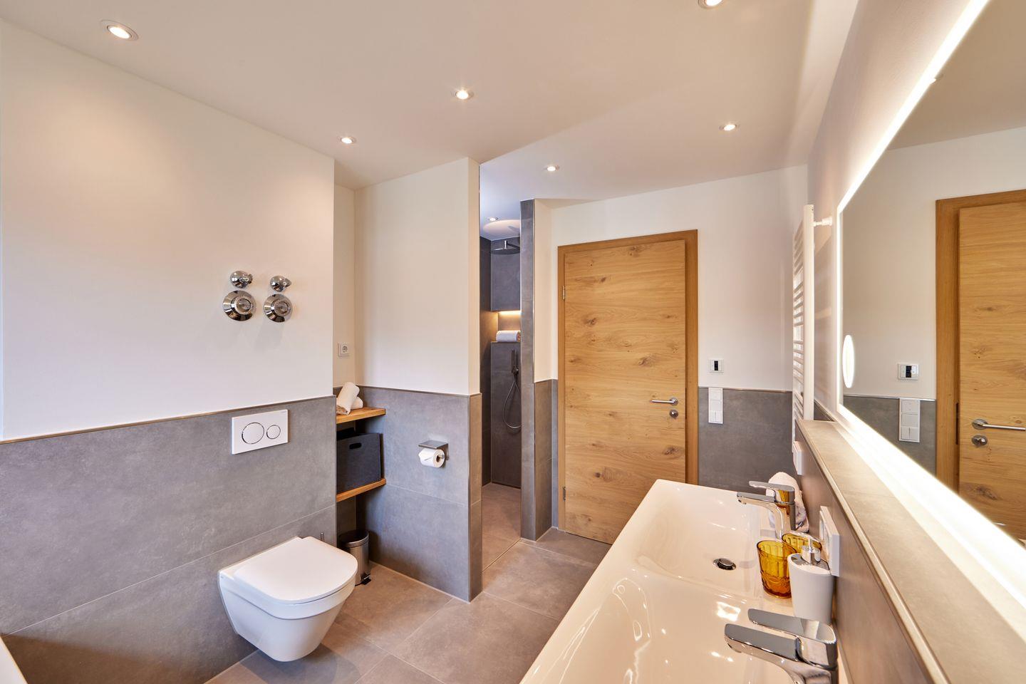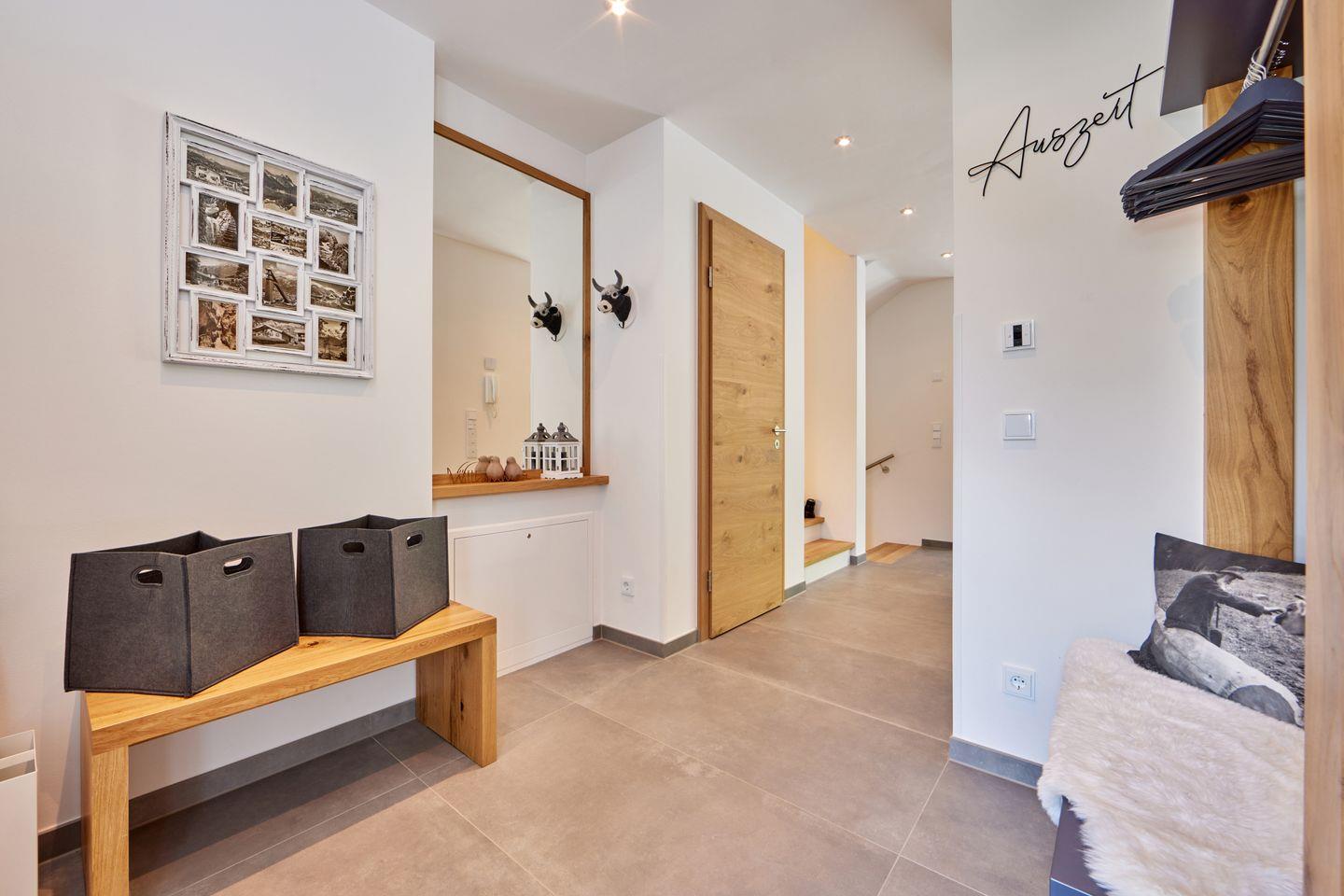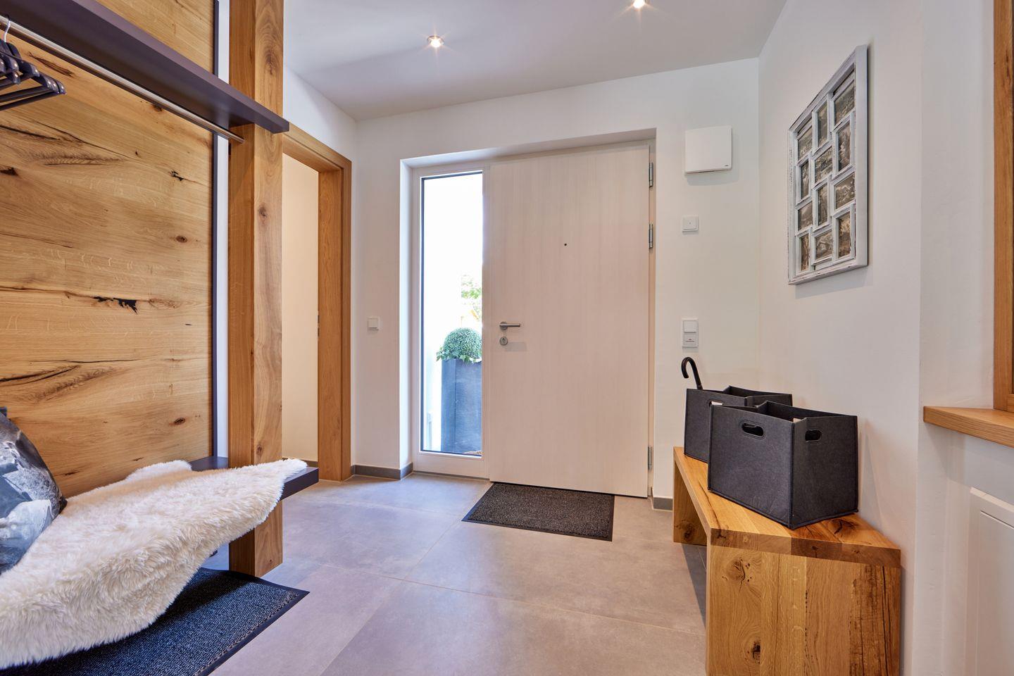 Im Eingangsbereich finden Sie neben einer praktischen Garderobe und einem Abstellraum mit Waschmaschine und Trockner auch ein weiteres Badezimmer mit ebenerdiger Dusche und Regenbrause. Damit auch hier für gute Stimmung gesorgt ist, ist das Bad – so wie alle anderen Bäder auch – mit einem Einbauradio ausgestattet.