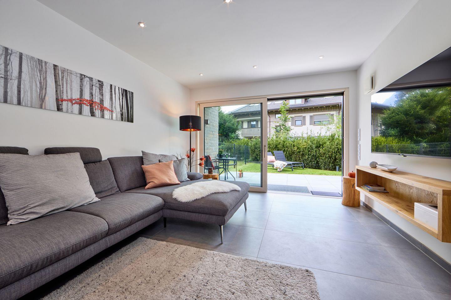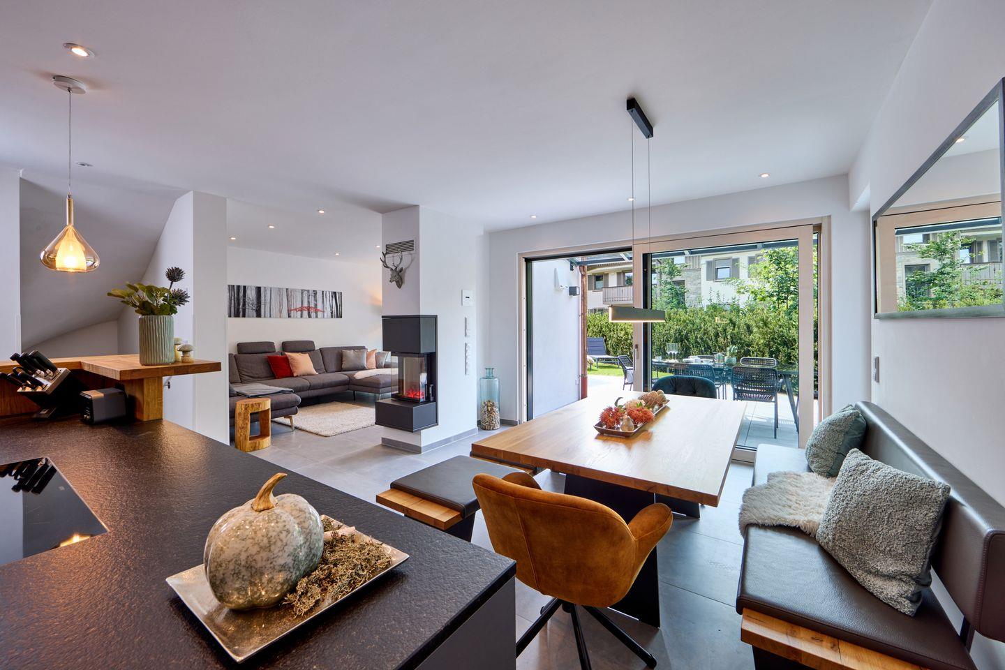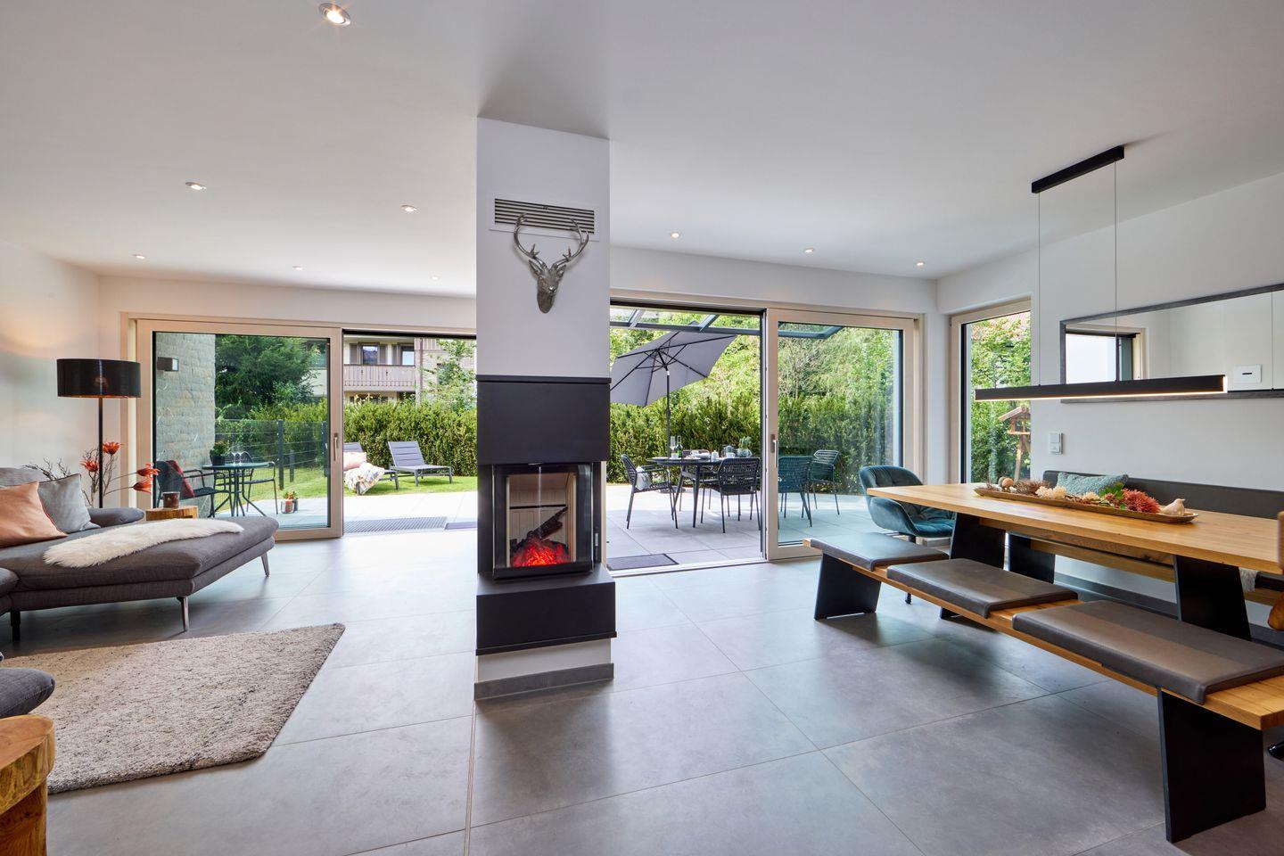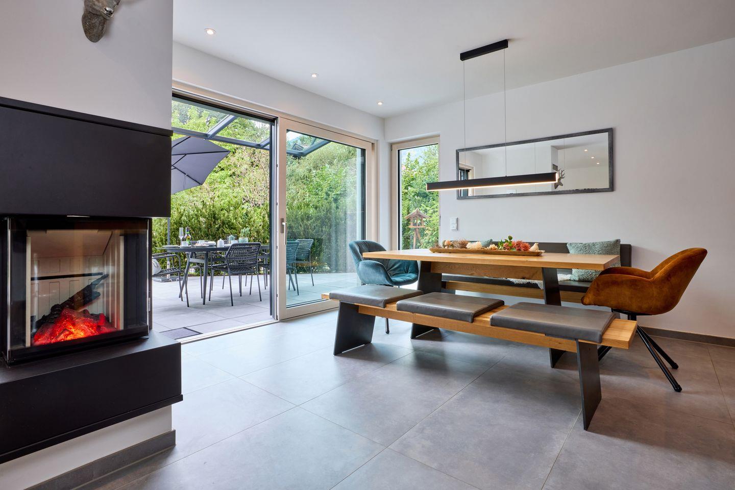 Im Erdgeschoss begrüßt Sie ein heller, offener Wohnraum. Bodentiefe Fenster lassen viel Tageslicht herein und bieten Zugang zur sonnigen Terrasse, auf der Sie in bequemen Gartenmöbeln die herrliche Bergluft genießen können. Am großen Esstisch lässt es sich gesellig zusammensitzen und die offene Küche lässt dank hochwertiger Ausstattung auch begeisterte Köche nichts vermissen. Ein dekorativer Kamin sorgt gerade zu späterer Stunde für eine gemütliche Atmosphäre. Die gemütliche Fernsehecke mit Flachbild-Fernseher und Wohnlandschaft lädt zum Füße hochlegen oder zu einem entspannten Fernsehabend ein.