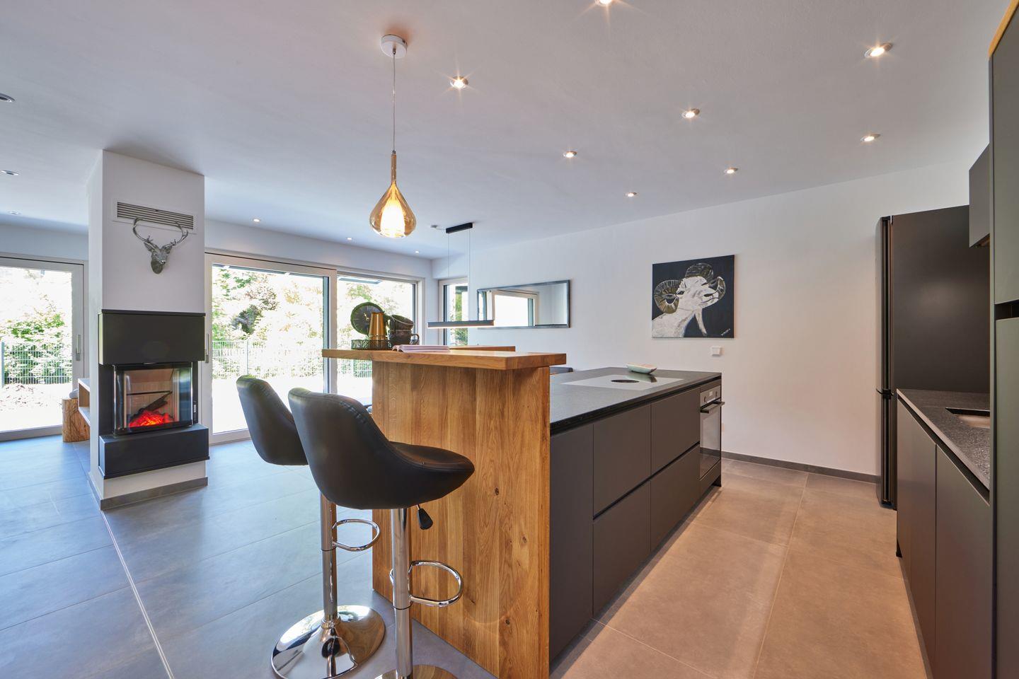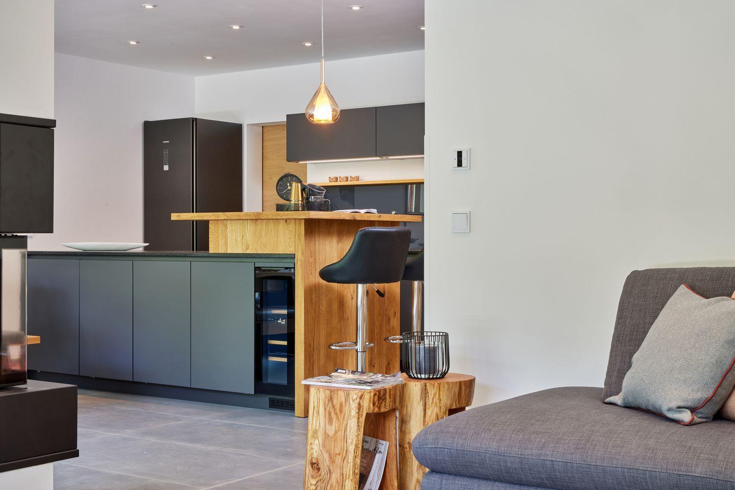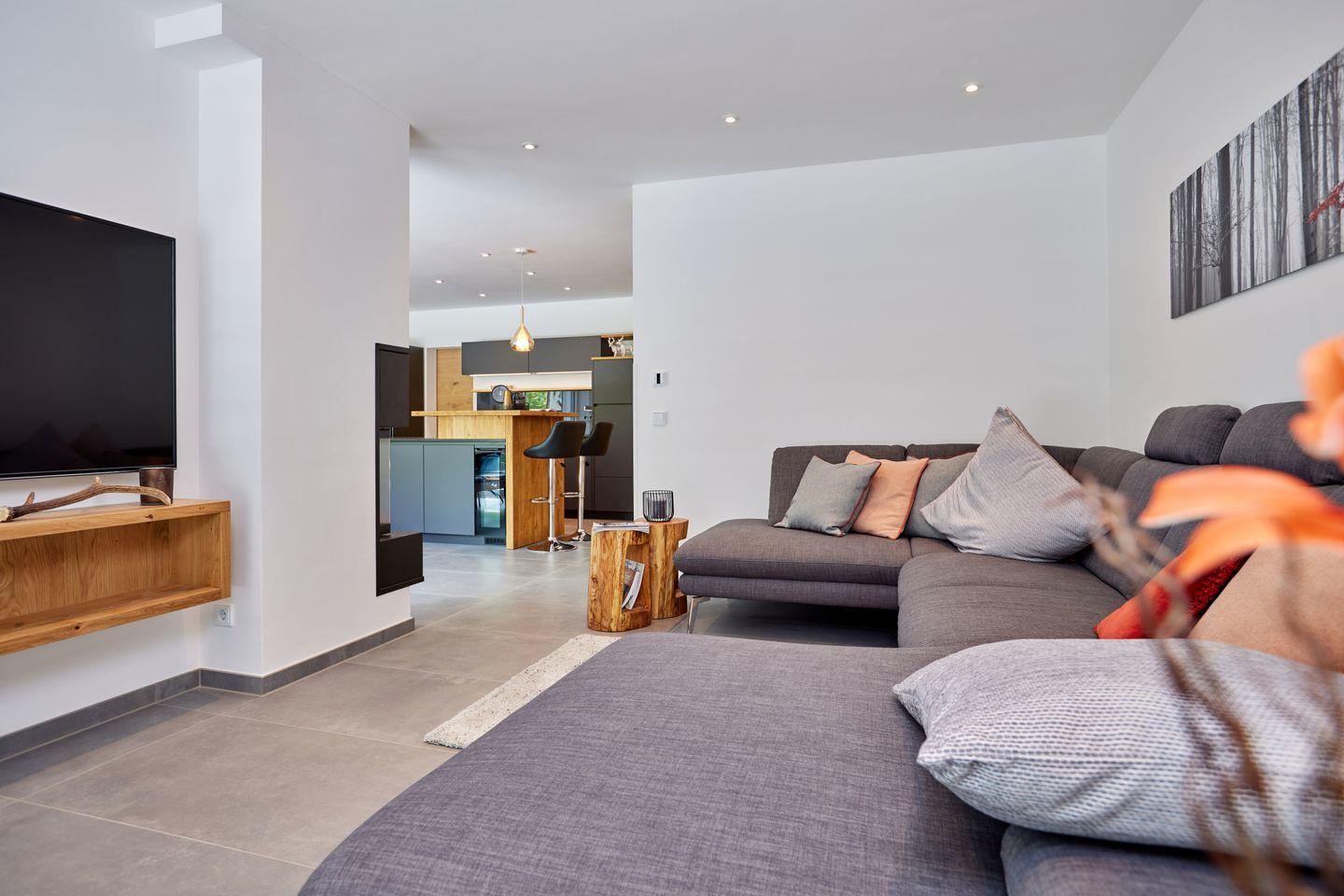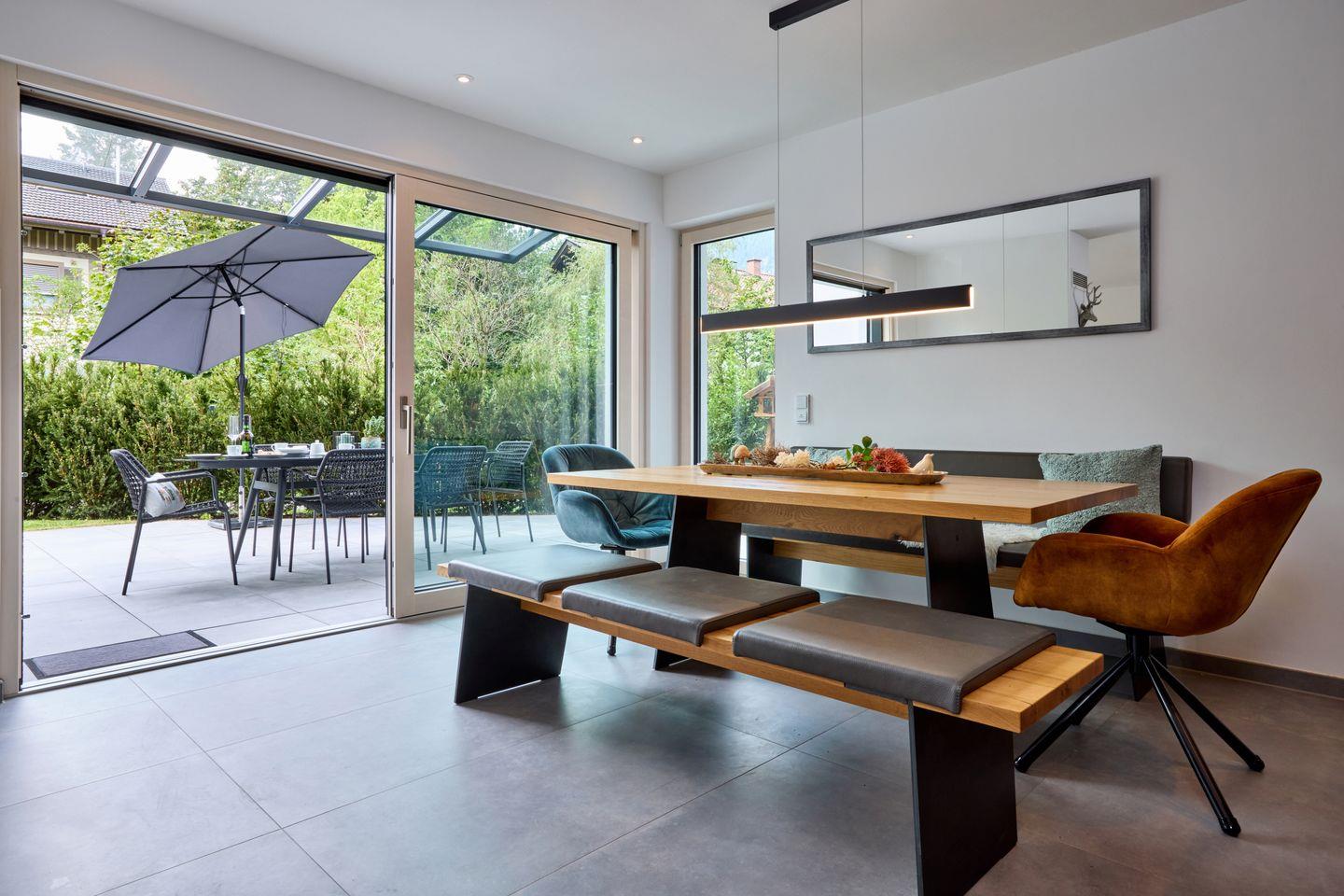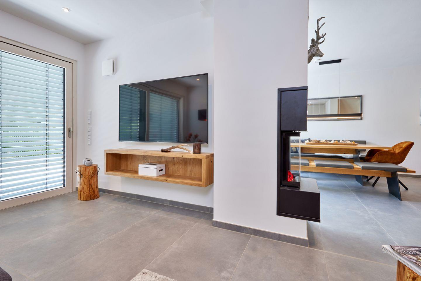 Im Erdgeschoss begrüßt Sie ein heller, offener Wohnraum. Bodentiefe Fenster lassen viel Tageslicht herein und bieten Zugang zur sonnigen Terrasse, auf der Sie in bequemen Gartenmöbeln die herrliche Bergluft genießen können. Am großen Esstisch lässt es sich gesellig zusammensitzen und die offene Küche lässt dank hochwertiger Ausstattung auch begeisterte Köche nichts vermissen. Ein dekorativer Kamin sorgt gerade zu späterer Stunde für eine gemütliche Atmosphäre. Die gemütliche Fernsehecke mit Flachbild-Fernseher und Wohnlandschaft lädt zum Füße hochlegen oder zu einem entspannten Fernsehabend ein.