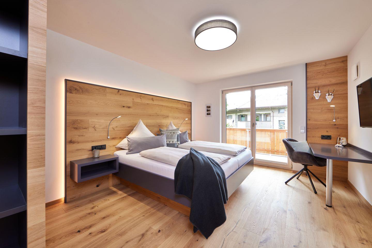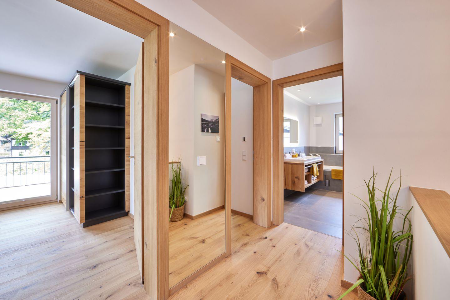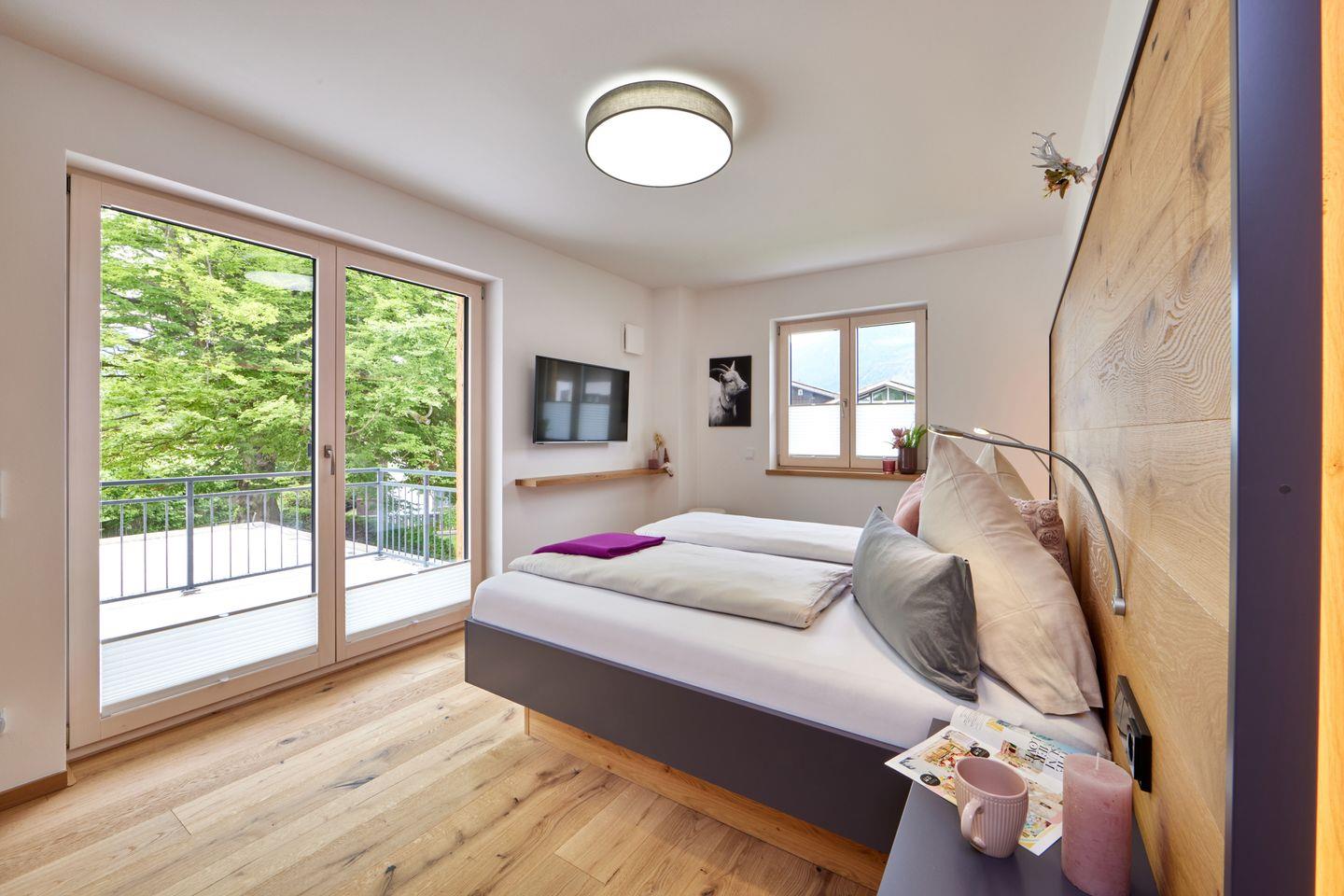 Alle Schlafzimmer sind jeweils mit bequemen Doppelbetten, großzügigen Kleiderschränken für Ihr Gepäck und eigenen Fernsehern ausgestattet. Zudem verfügen 3 der Schlafzimmer auch über praktische Schreibtische. 3 Schlafzimmer befinden sich im Obergeschoss, zusammen mit einem großen Badezimmer, in dem Sie neben einer ebenerdigen Dusche mit Regenbrause auch eine entspannende Badewanne finden. 2 der Schlafzimmer haben jeweils einen Zugang zum großen Balkon, auf dem sich bei schönem Bergblick herrlich die Abendsonne genießen lässt. Das andere Schlafzimmer verfügt über einen eigenen, kleineren Balkon.