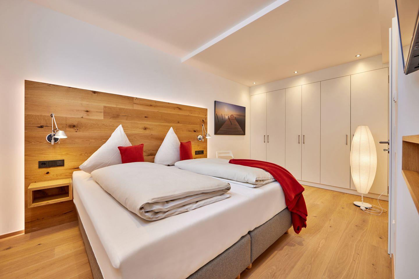 Angrenzend zum Wohnbereich befinden sich ein Gäste-WC und eines der Schlafzimmer. Ausgestattet mit einem komfortablen Doppelbett, Flachbild-Fernseher, geräumigem Kleiderschrank und eigenem Badezimmer mit Dusche, finden Sie hier einen idealen Rückzugsort und kuscheliges Plätzchen für die Nachtruhe.