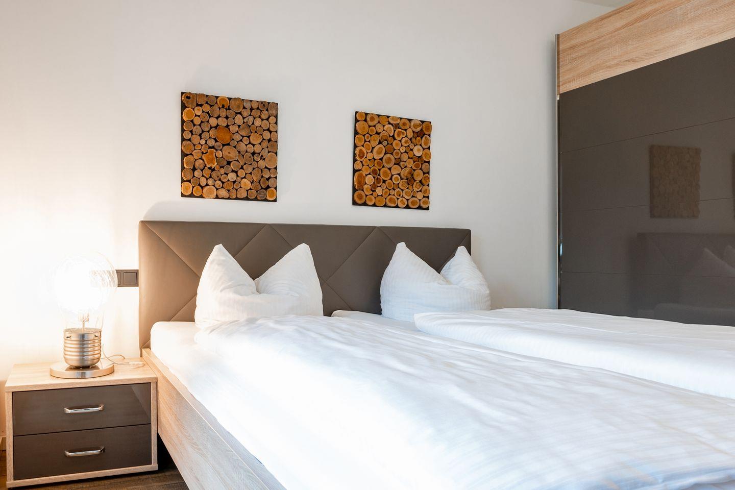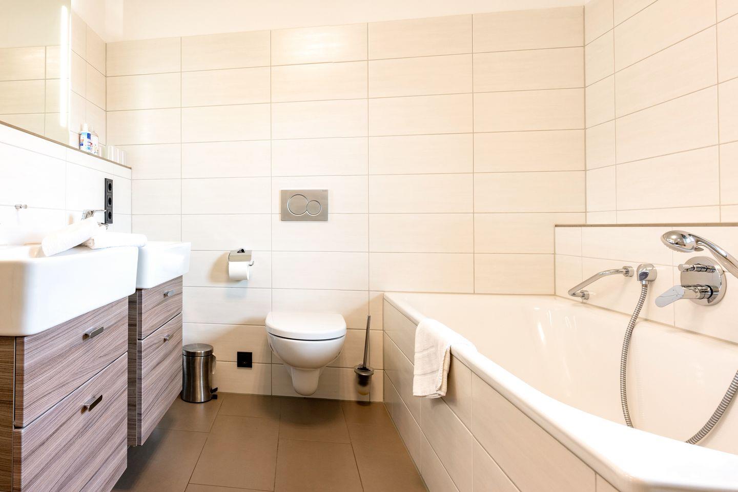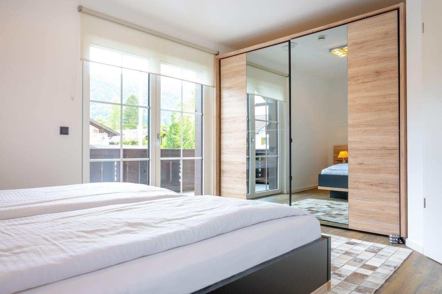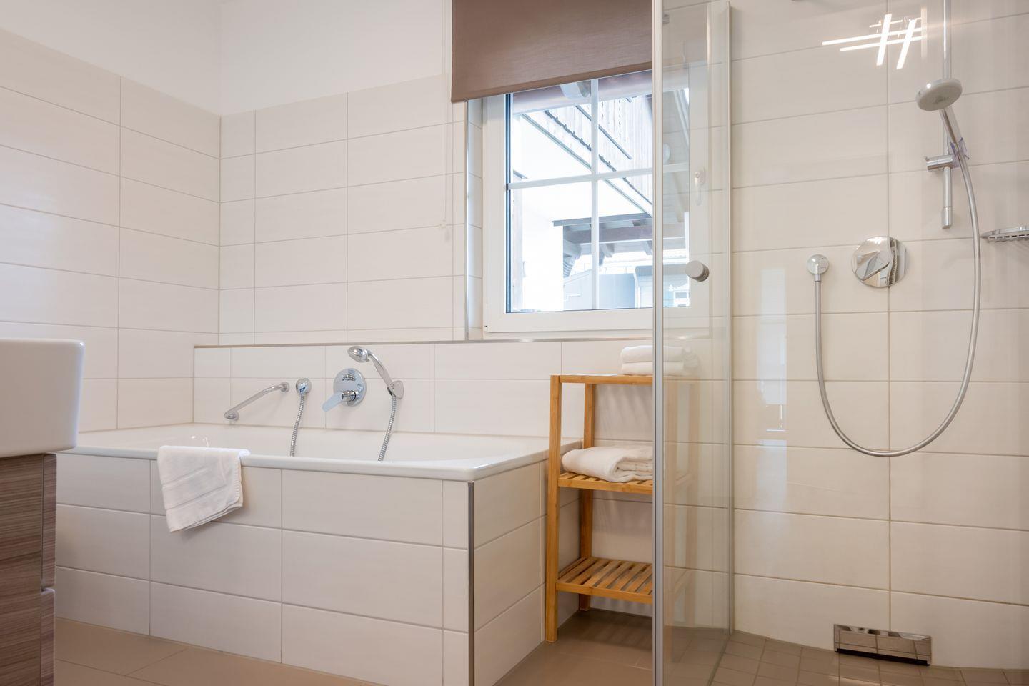 Über einen Treppenaufgang erreichen Sie das 1. Obergeschoss, wo 2 Schlafzimmer mit gemütlichen Doppelbetten und 1 Schlafzimmer mit zwei bequemen Einzelbetten darauf warten, Ihnen eine entspannte Nachtruhe zu bereiten. Die Schlafzimmer sind jeweils mit einem eigenen Flachbild-Fernseher und geräumigem Kleiderschrank ausgestattet und bieten Zugang zum umlaufenden Balkon, auf dem sich bei tollem Bergblick entspannt die Abendsonne genießen lässt. Neben den Schlafzimmern befindet sich hier auch ein zweites, helles Badezimmer mit ebenerdiger Dusche und Badewanne.