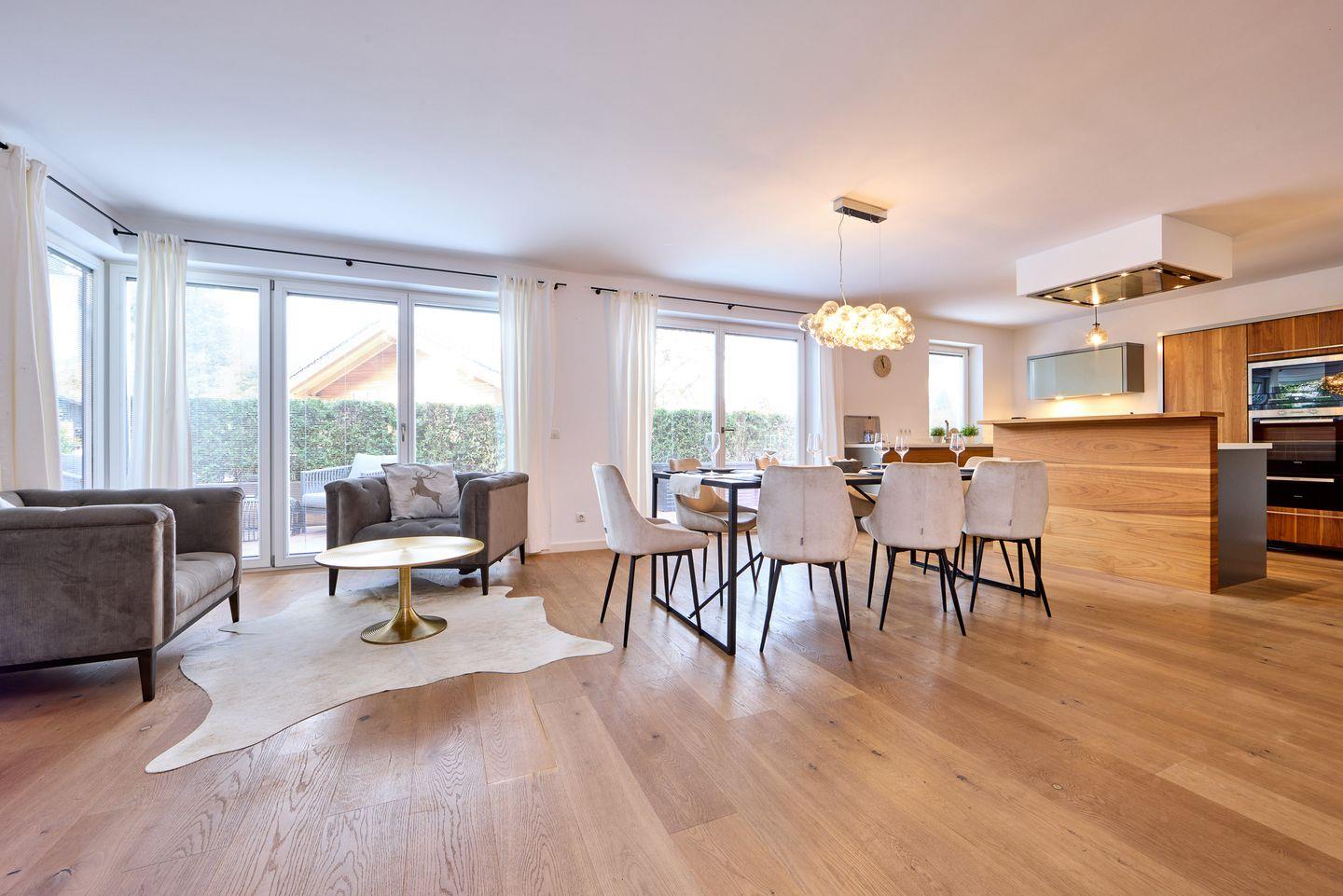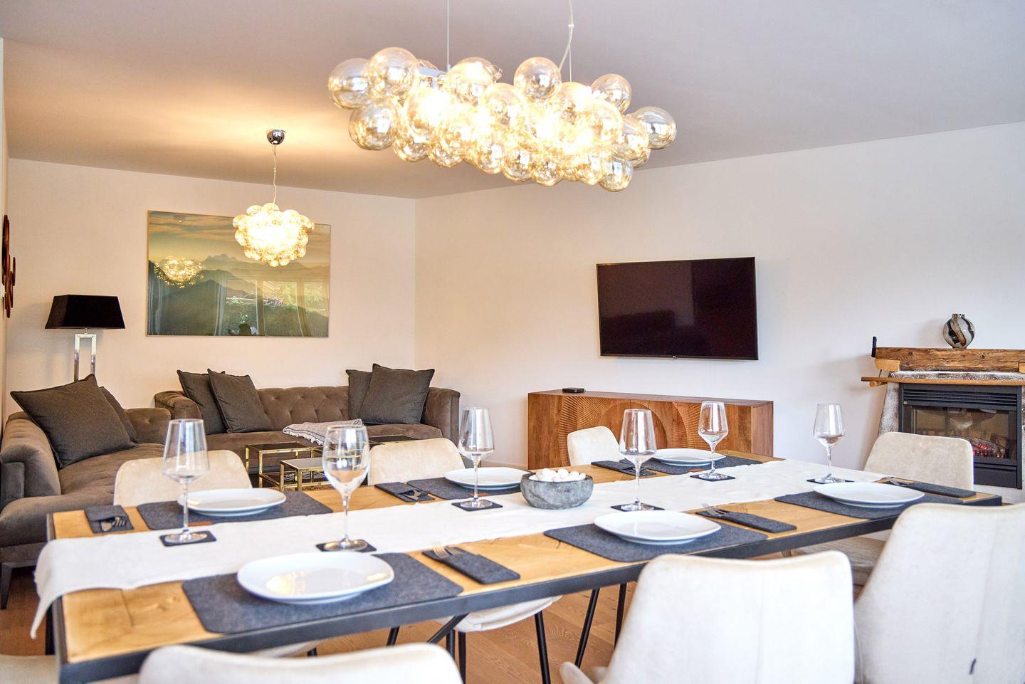 Ein großer, offen gestalteter Wohnraum mit großzügigem Esstisch mit Platz für 8 Personen vereint den idealen Ort zum Zusammenkommen mit einer modernen, voll ausgestatteten Küche, in der Sie Ihre kulinarischen Ideen verwirklichen können. Eine einladende Wohnlandschaft lädt zum Füße hochlegen ein. Ein großer Flachbild-Smart TV sorgt bei Bedarf für die nötige Unterhaltung. Ein Elektrokamin verbreitet auch an kalten Tagen kuscheliges Ambiente. Der hölzerne Boden und das Mobiliar in natürlichen Materialien vereinen einen gewissen alpinen Charme und Gemütlichkeit mit modernem Design. Bodentiefe Fenster lassen Tageslicht in den Wohnraum und ermöglichen direkten Zugang zur großen Terrasse.