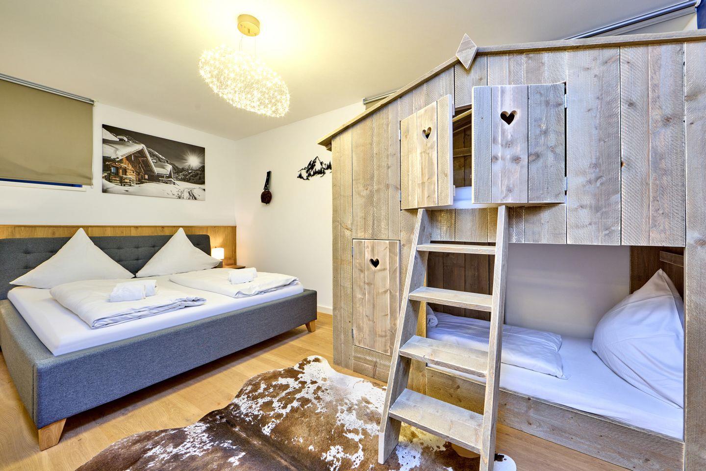 Ein drittes Schlafzimmer bietet außer einem Doppelbett auch noch ein Stockbett. Auch hier finden Sie einen eigenen Flachbild-Smart TV.