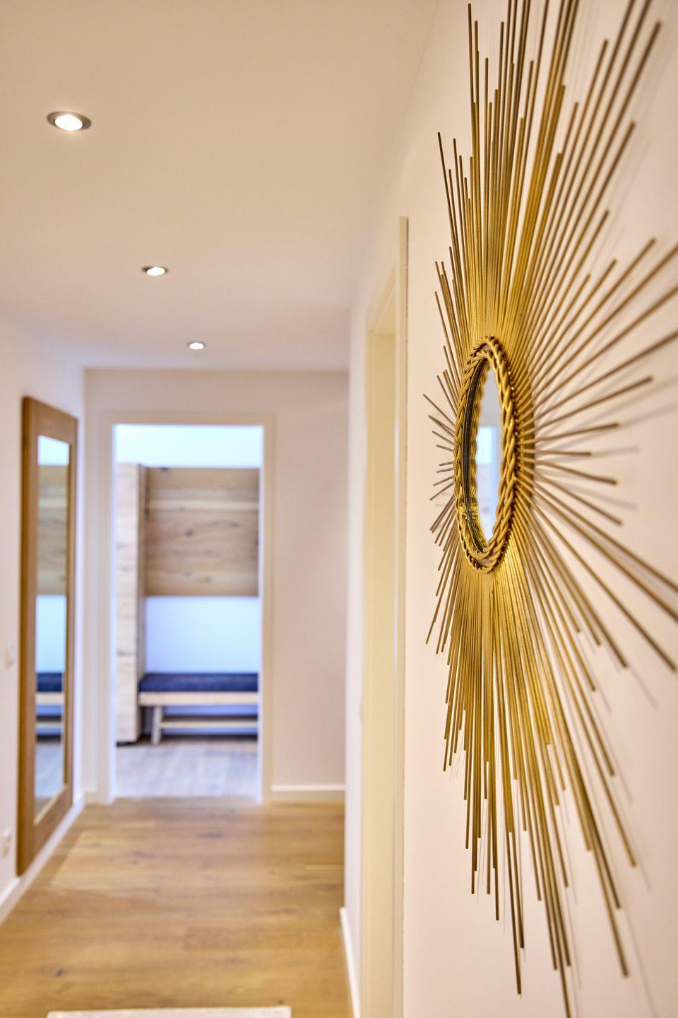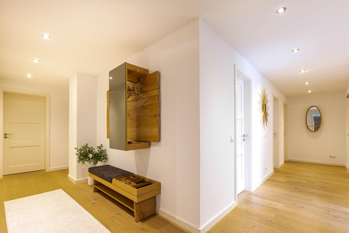 An den Wohnraum schließt sich ein geräumiger Flur an, von dem alle weiteren Zimmer abgehen. Hier finden sich neben den 3 Schlafzimmern auch ein Gäste-WC, ein großes Badezimmer mit ebenerdiger Dusche, sowie ein weiterer Raum mit Sauna, in dem sich auch eine Waschmaschine und ein Trockner befinden.