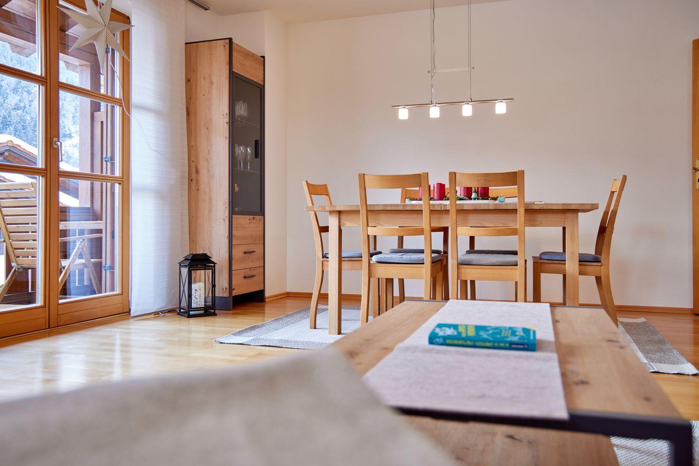 Die Wohnung verfügt über ein helles und geräumiges Schlafzimmer mit einem bequemen Doppelbett, das für erholsame Nächte sorgt. Im geräumigen Wohnzimmer befindet sich neben einem großen Esstisch auch eine einladende Wohnecke mit Schlafcouch, die sich perfekt für Kinder eignet. Die separate Küche ist mit modernen Geräten ausgestattet und bietet Ihnen die Möglichkeit, Ihre Lieblingsgerichte zuzubereiten, während Sie die atemberaubende Aussicht auf die umliegenden Berge genießen. Hier befindet sich auch ein zusätzlicher kleiner Tisch, der sich für ein gemütliches Frühstück zu zweit anbietet.