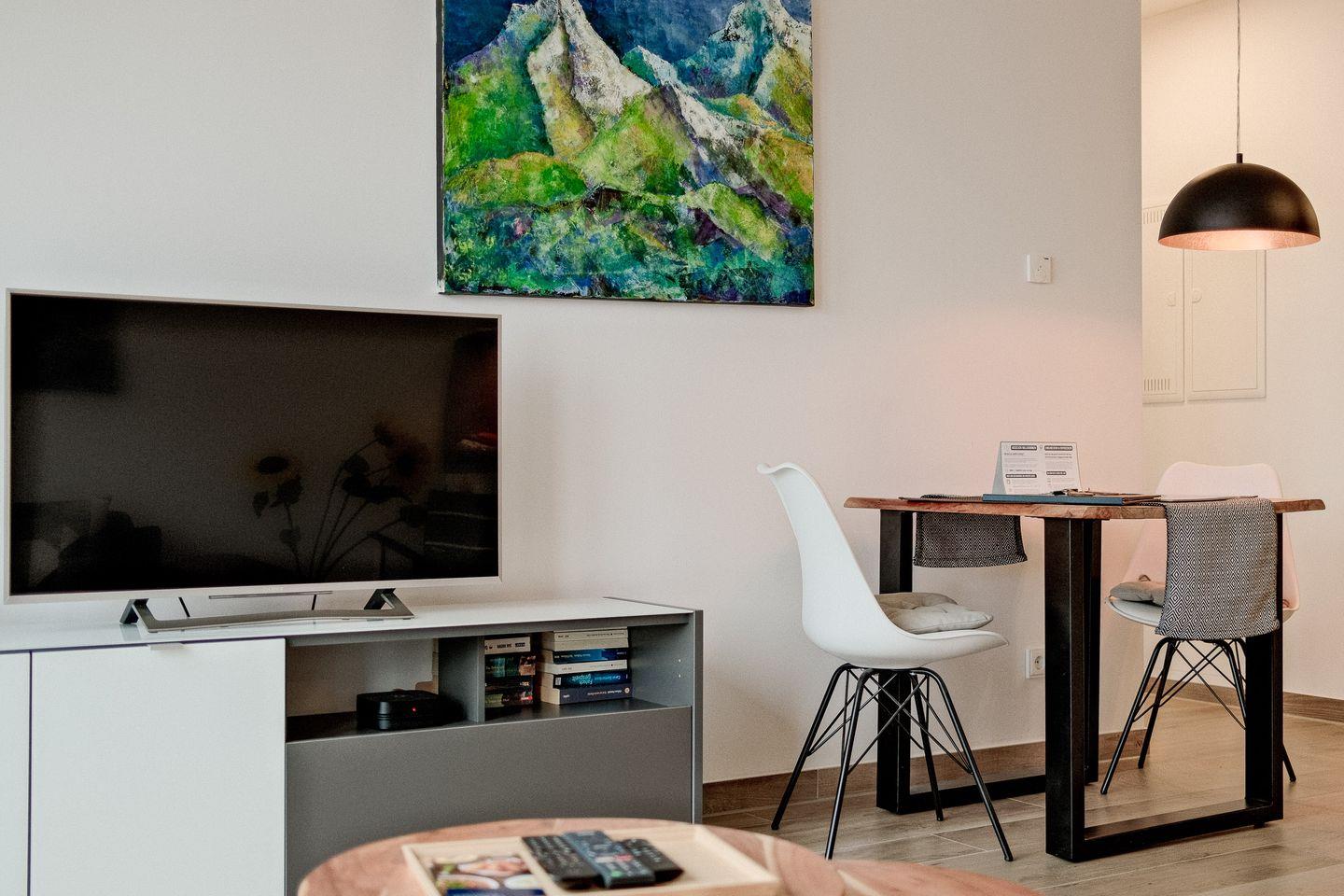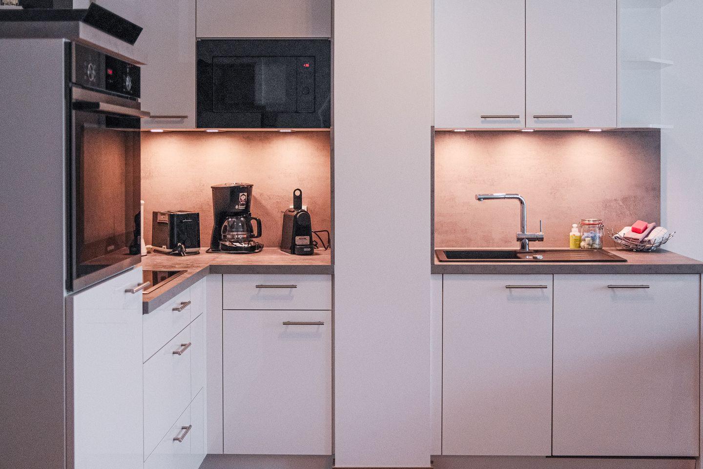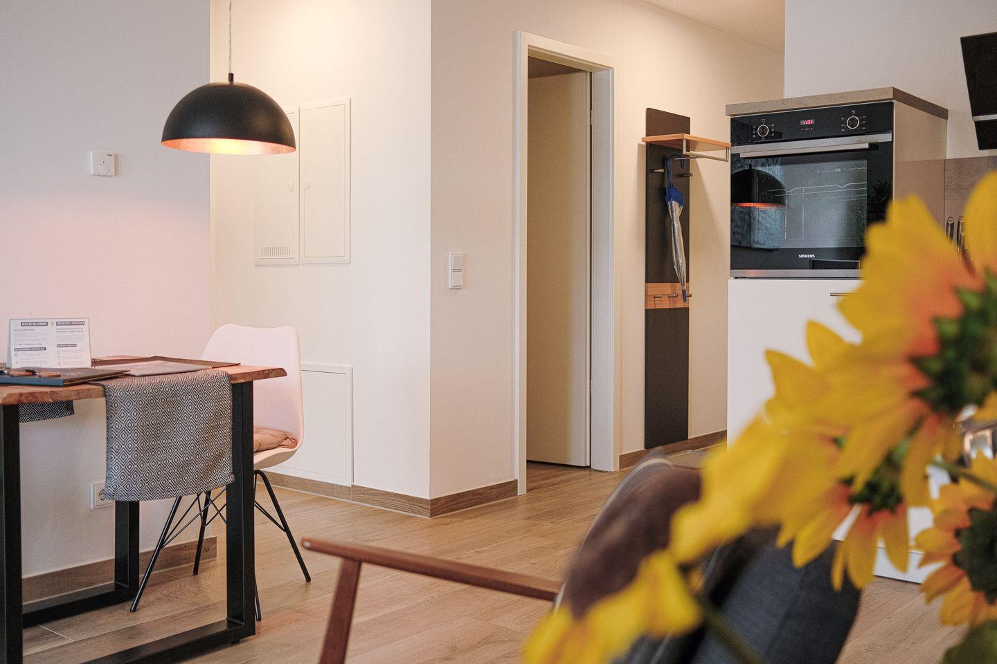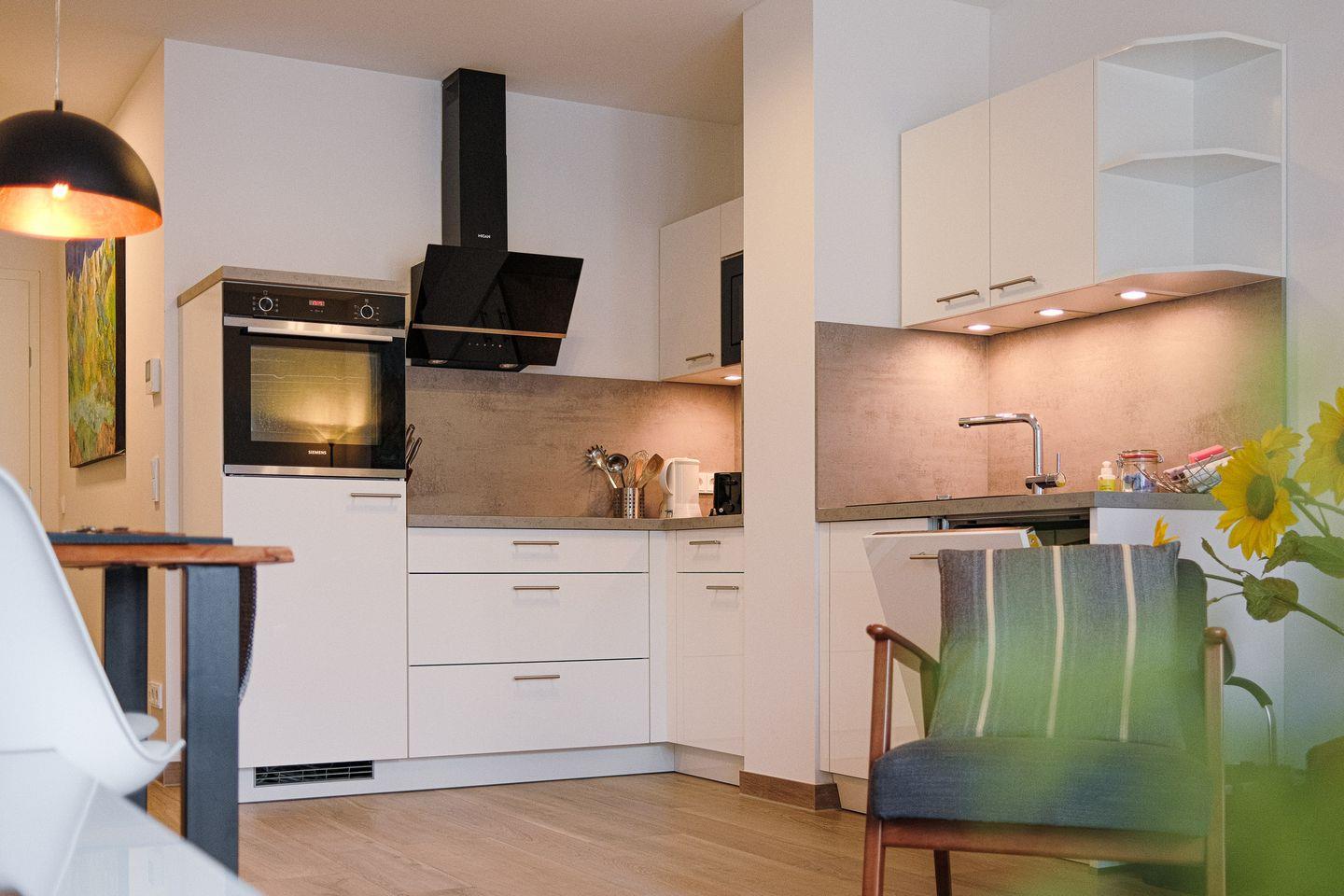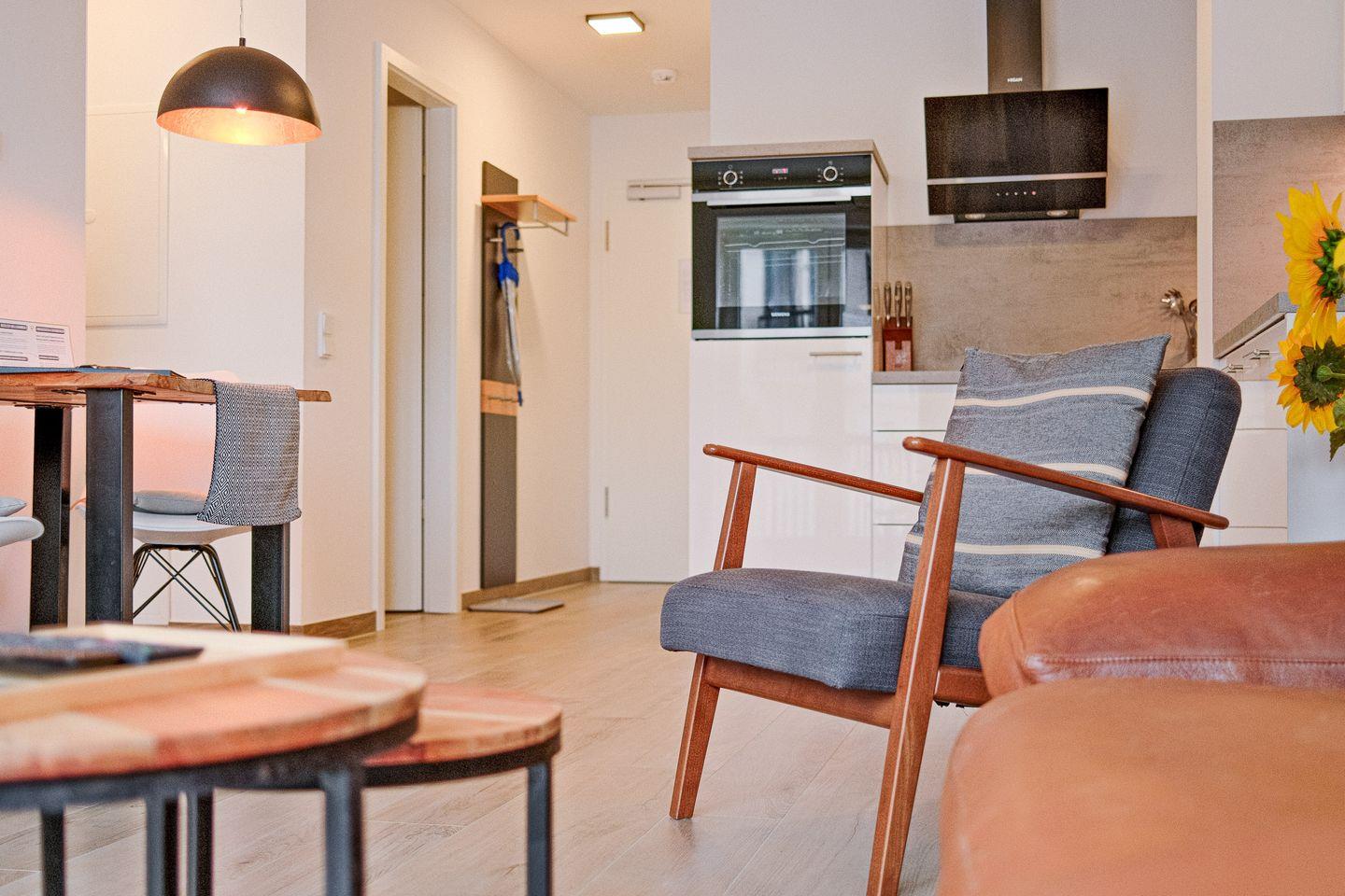 Der helle und offene Wohnraum lädt mit kuscheliger Sofaecke zum Verweilen ein und bietet einen Esstisch für 2 Personen sowie eine moderne, zum Wohnbereich hin offene Küche, die voll ausgestattet ist. Die moderne und elegante Einrichtung schafft eine Atmosphäre der Entspannung und Behaglichkeit, in der Sie sich sofort wie zu Hause fühlen werden.