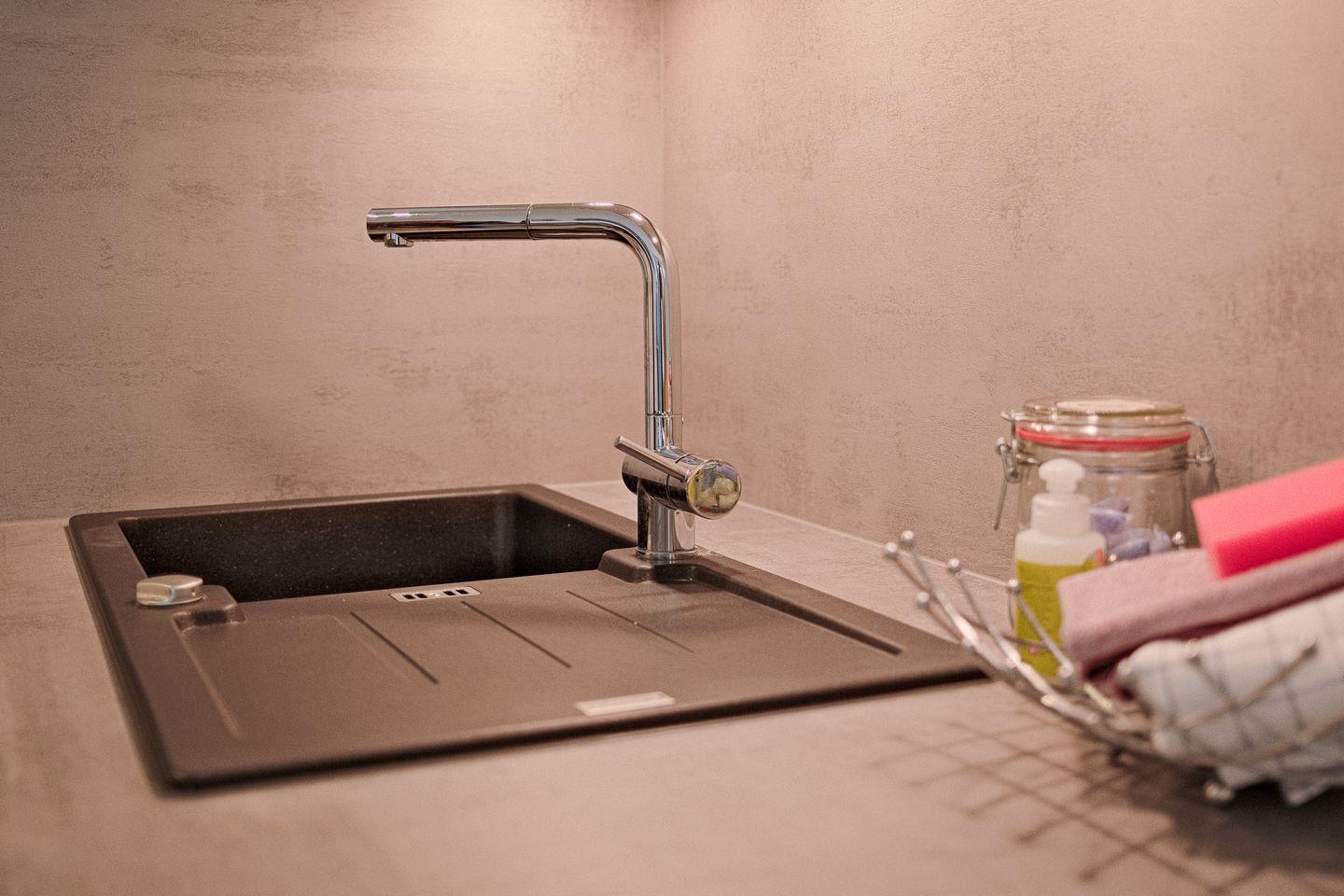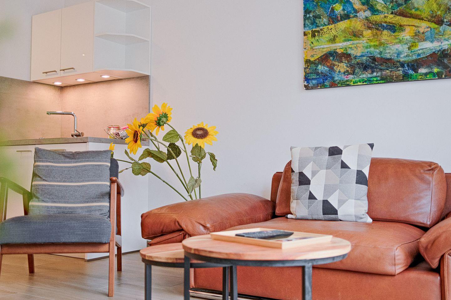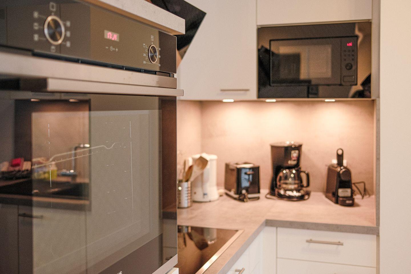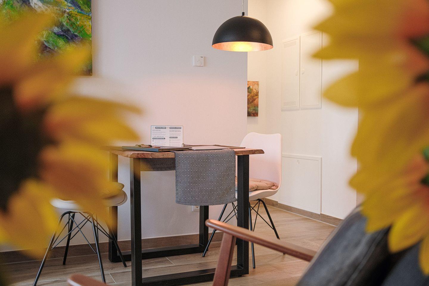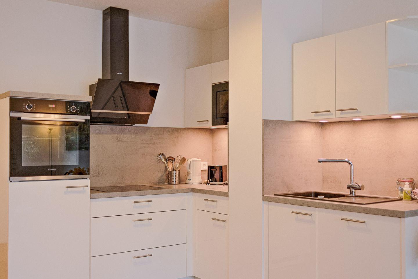 Der helle und offene Wohnraum lädt mit kuscheliger Sofaecke zum Verweilen ein und bietet einen Esstisch für 2 Personen sowie eine moderne, zum Wohnbereich hin offene Küche, die voll ausgestattet ist. Die moderne und elegante Einrichtung schafft eine Atmosphäre der Entspannung und Behaglichkeit, in der Sie sich sofort wie zu Hause fühlen werden.