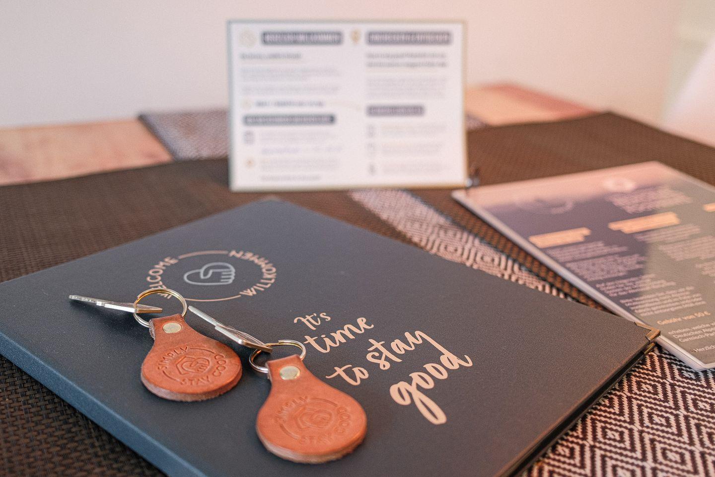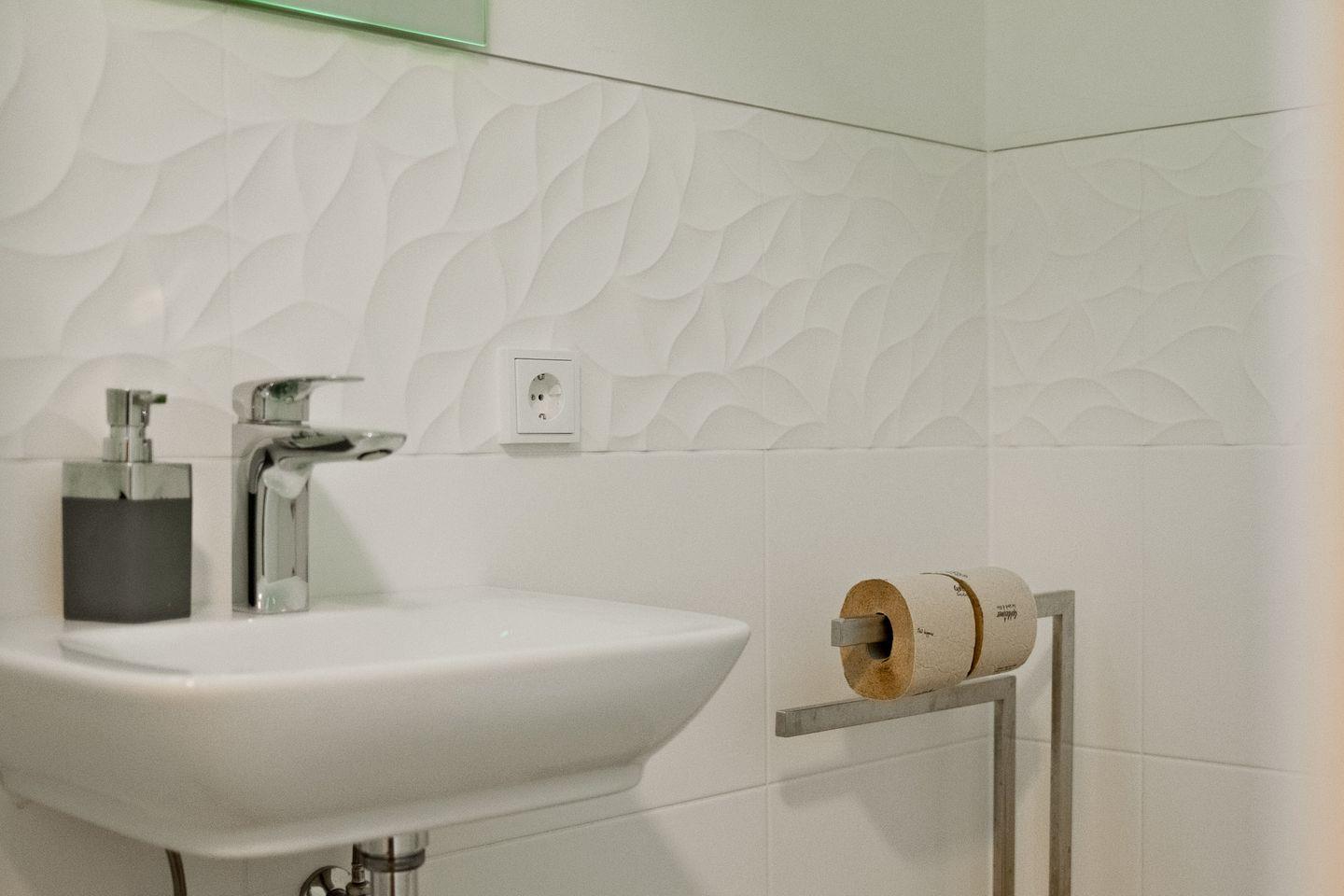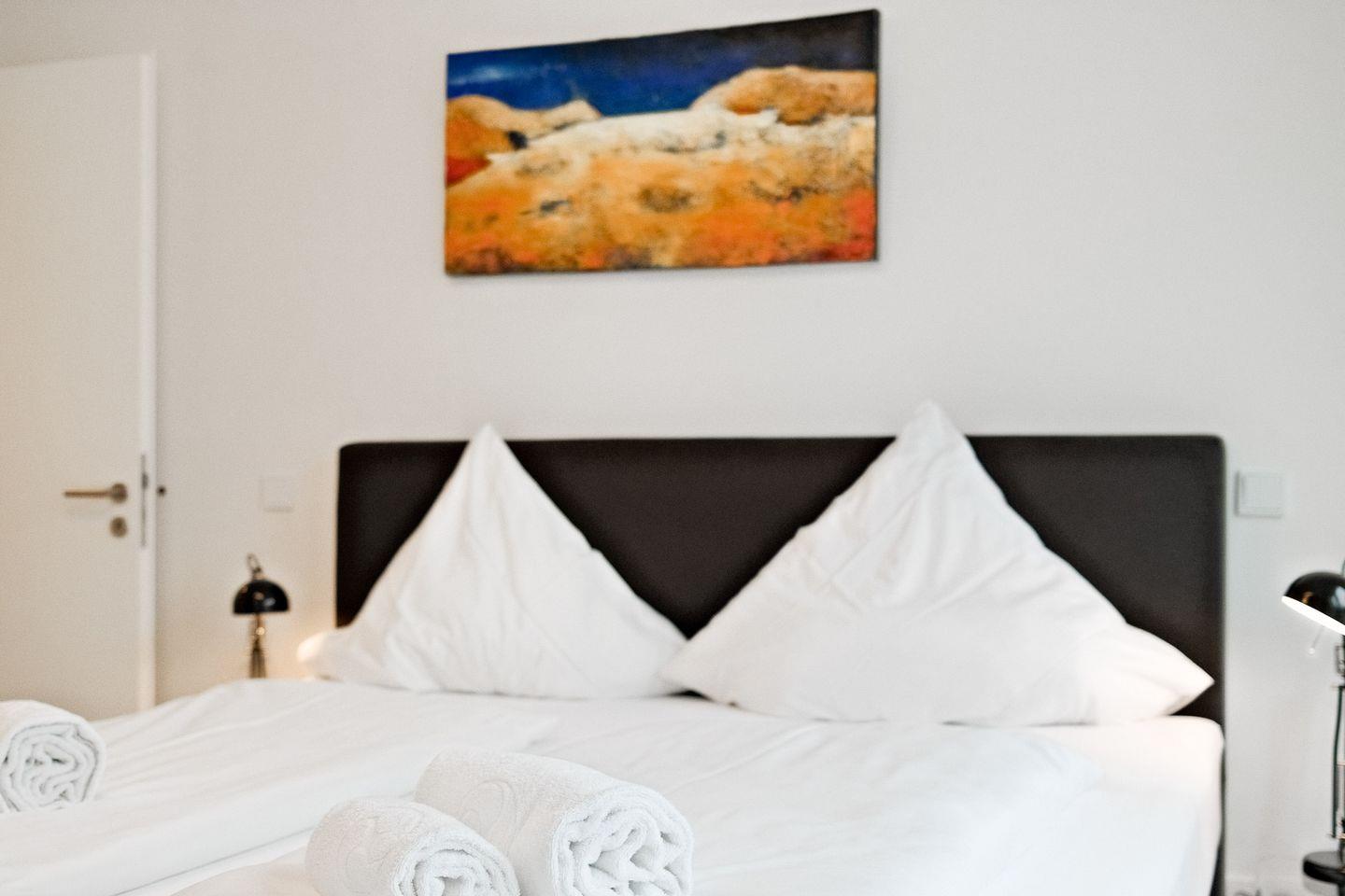 Die Wohnung verfügt über ein Schlafzimmer mit einem gemütlichen Doppel-Boxspringbett und En-suite-Bad mit ebenerdiger Dusche. Ein separates Gäste-WC sorgt für praktische Annehmlichkeiten während Ihres Aufenthalts.