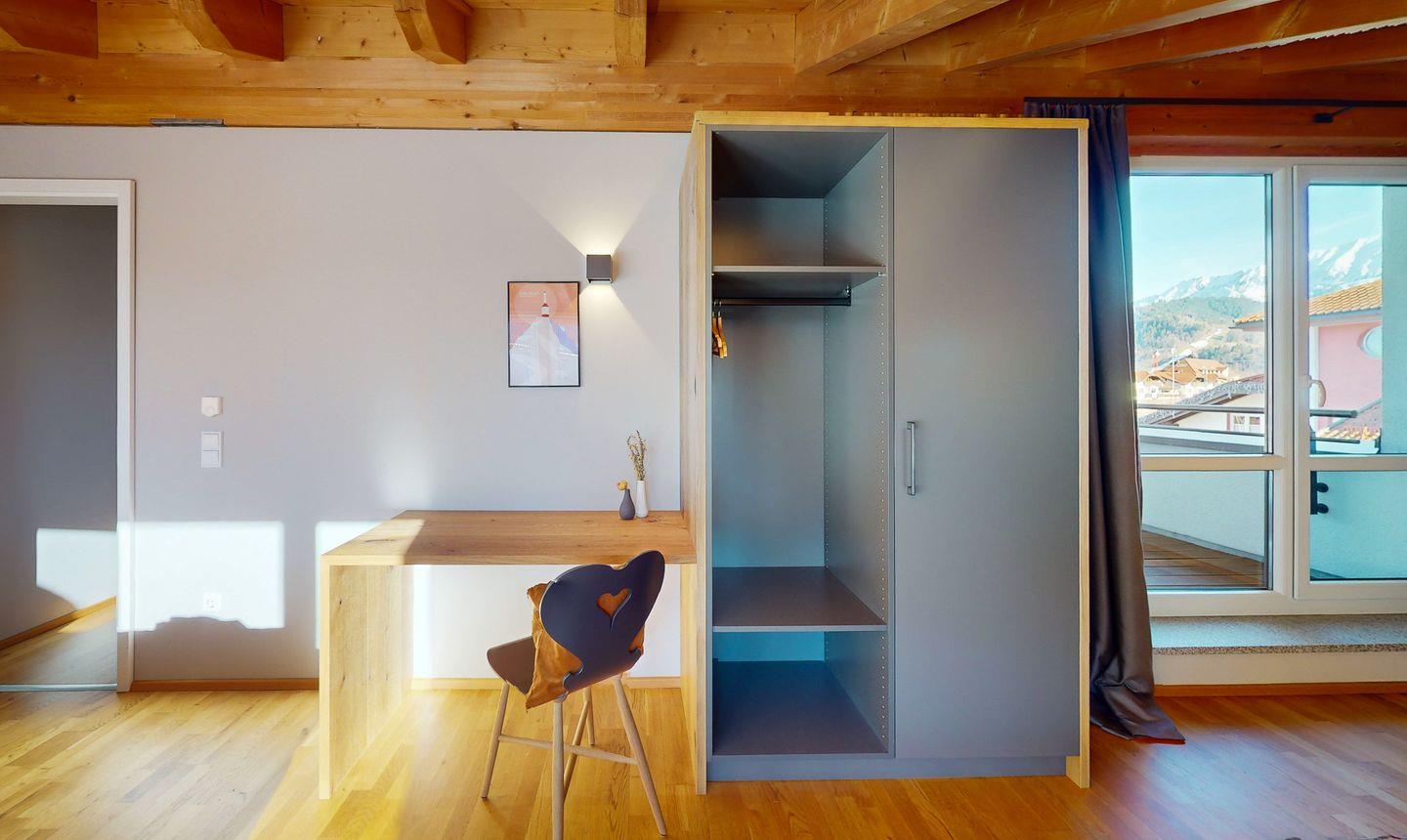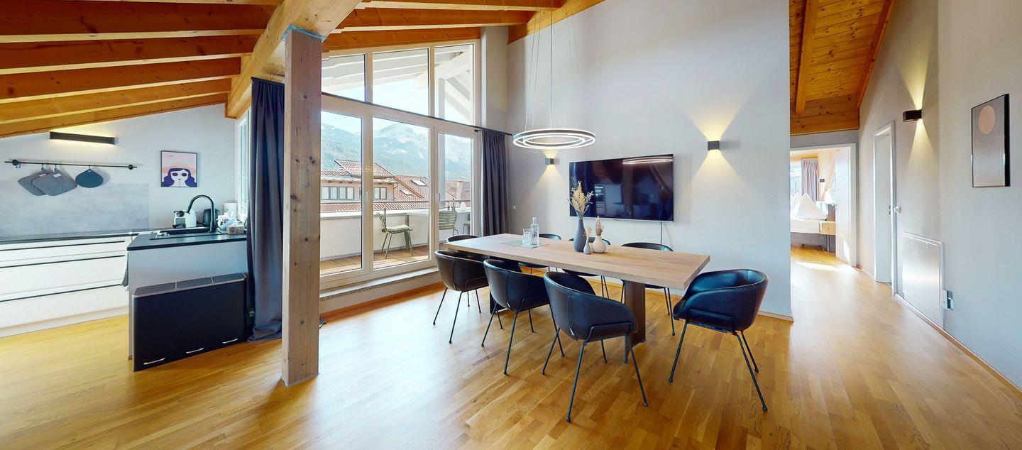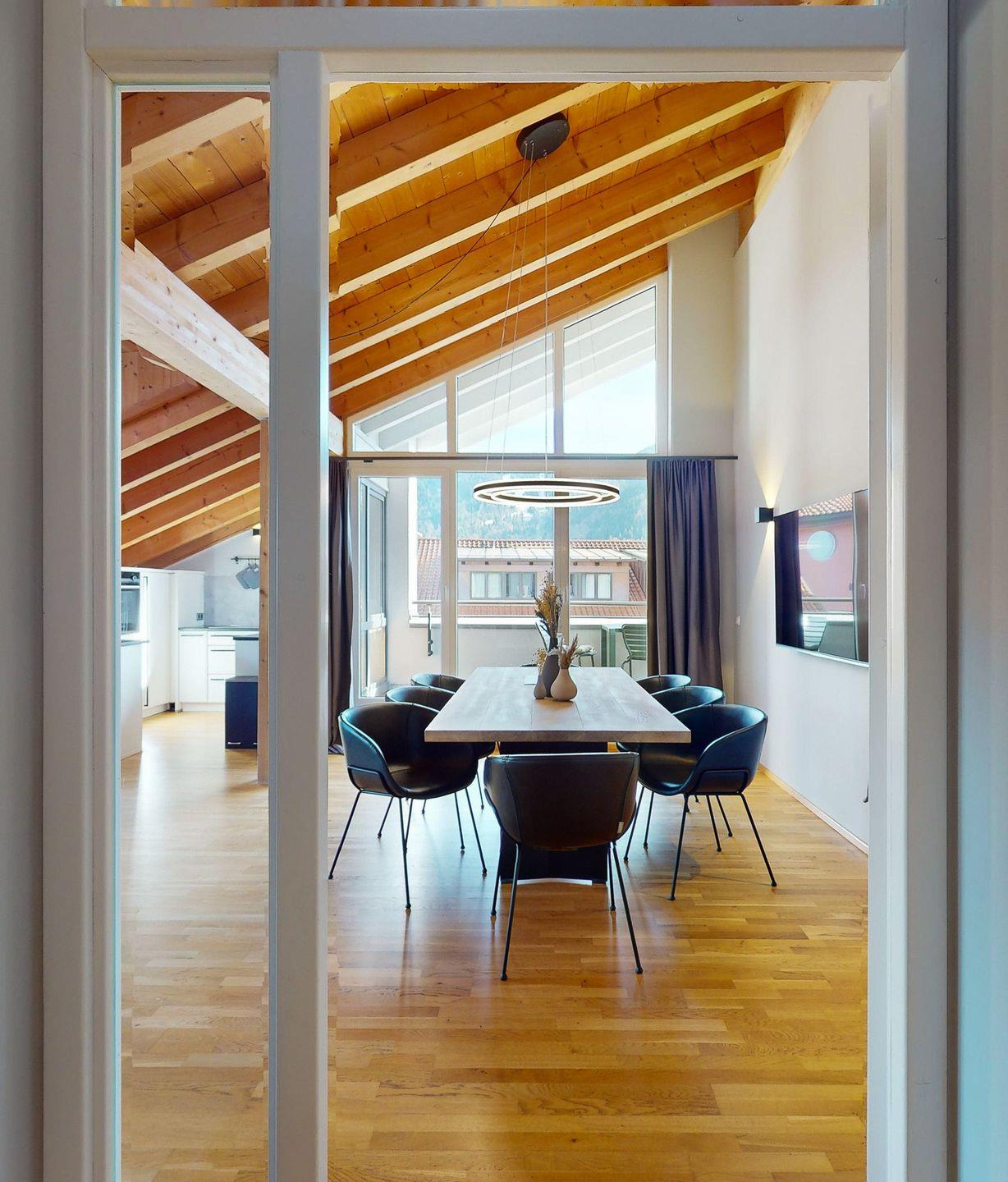 Mit insgesamt vier großzügigen Zimmern bietet die Wohnung ausreichend Platz für alle Ihre Bedürfnisse. Reichlich Fenster durchfluten die Räume mit Tageslicht und lassen über die Dächer der Stadt weit in die Berge blicken. Dazu viel natürliches Holz, gepaart mit elegantem, modernem Design ergeben eine edle Einrichtung und eine komfortable Unterkunft, in der man sich einfach wohlfühlen muss.