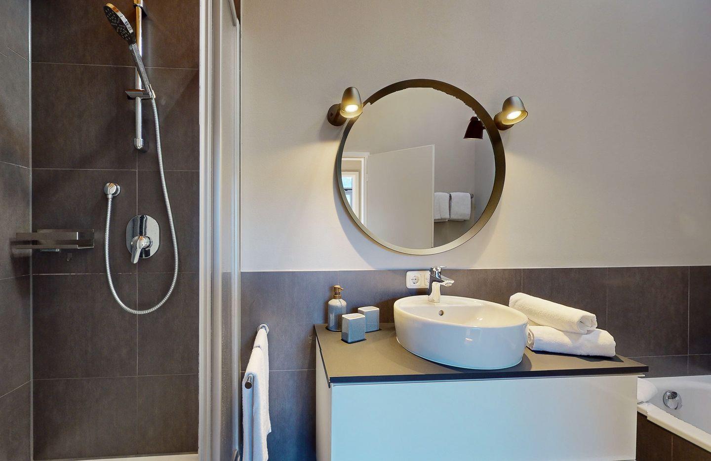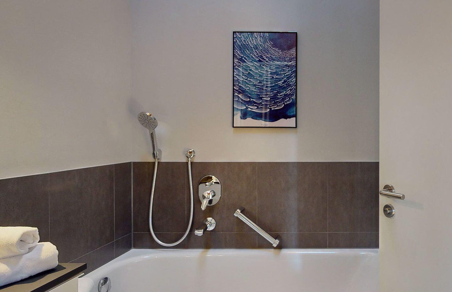 Ein großes Bad mit Dusche und Badewanne sorgt nach anstrengenden Ausflügen für Entspannung. Ein weiteres, kleines Duschbad und ein separates Gäste-WC stellen sicher, dass Sie sich auch bei größeren Reisegruppen nicht um das Badezimmer streiten müssen.
