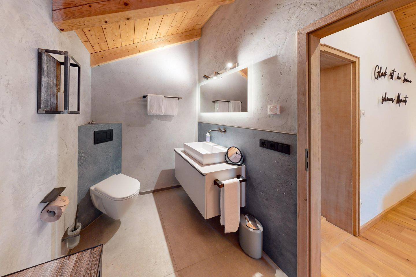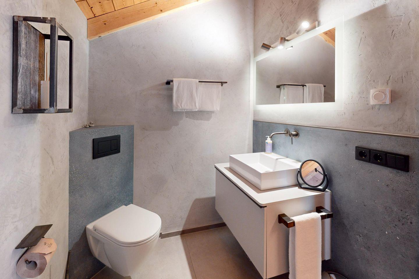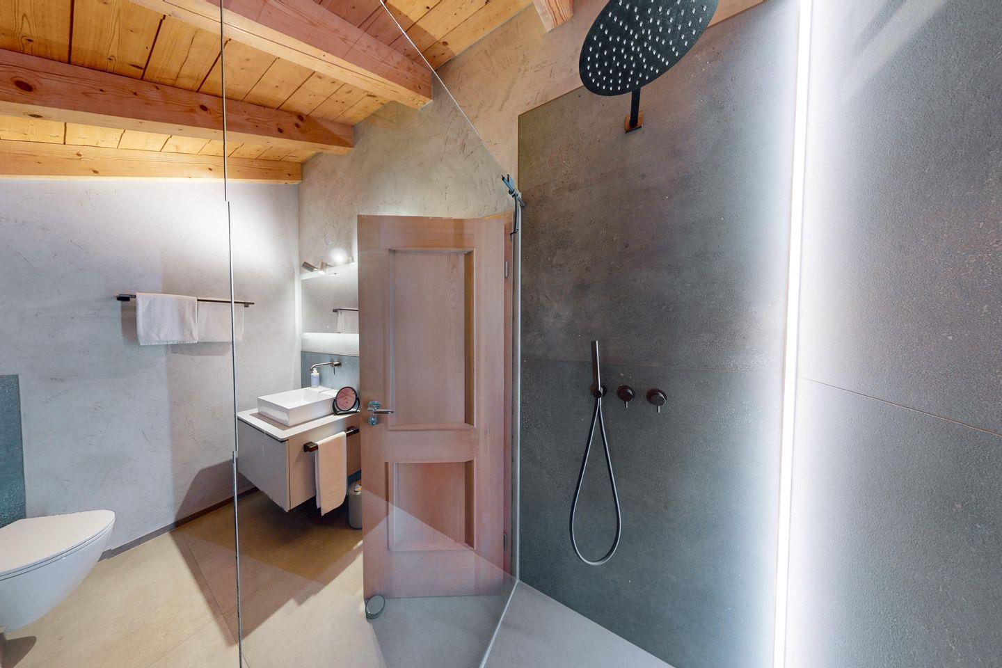Ein modernes Badezimmer grenzt direkt an das Schlafzimmer an und verwöhnt Sie mit einer luxuriösen Regendusche, die nach einem Tag in den Bergen pure Entspannung verspricht.