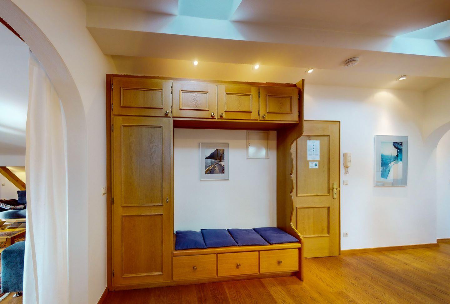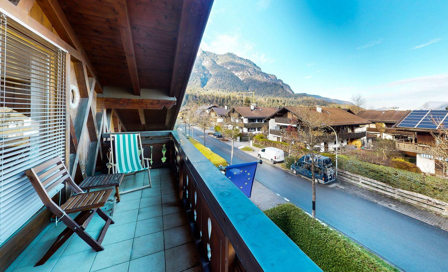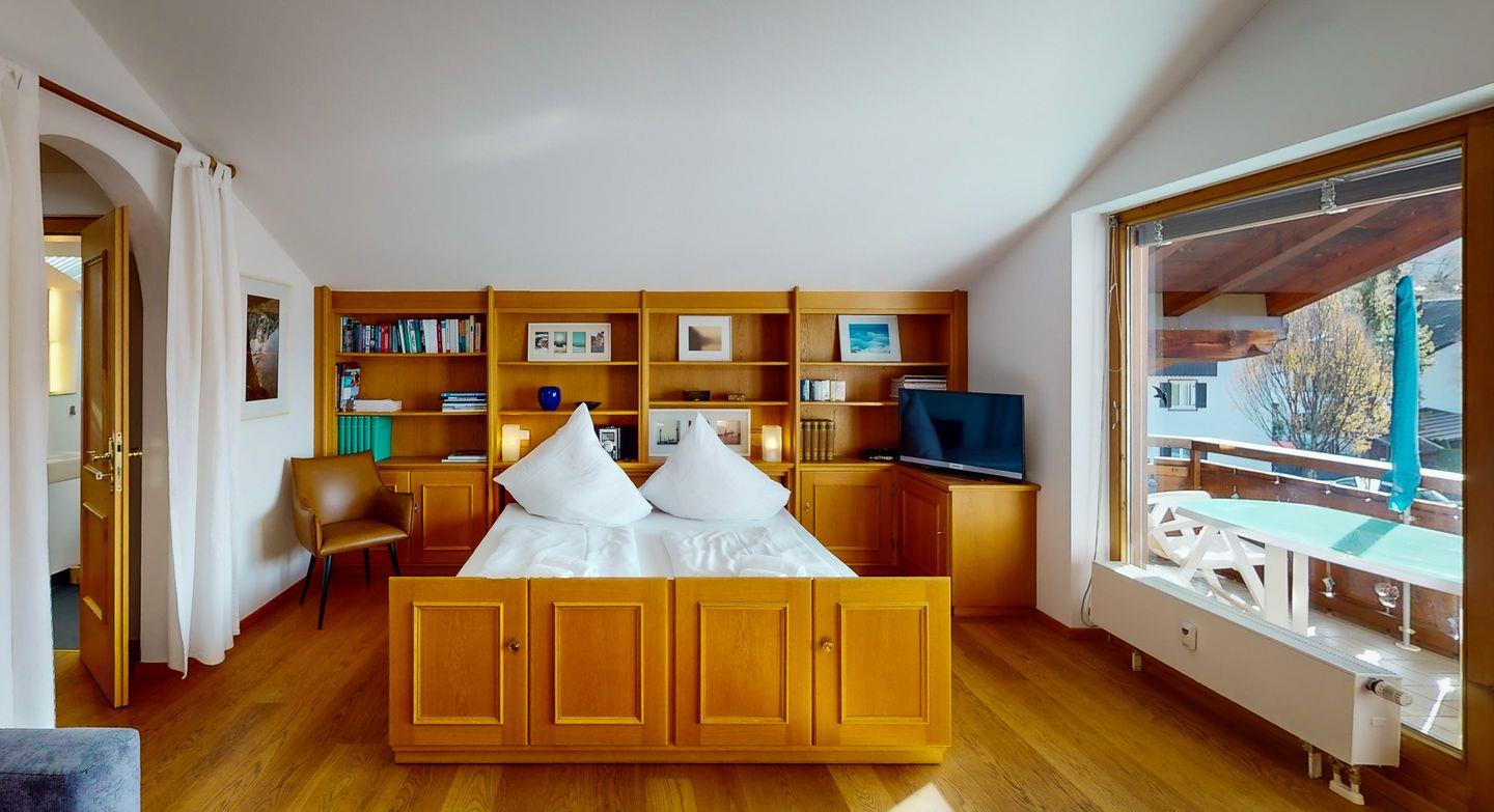 Das Herzstück ist der Wohnbereich mit seiner komfortablen Sitzgarnitur und freiliegenden Holzbalken, die urigen Charakter verleihen. Hier finden Sie auch Zugang zu einem der zwei Balkone, auf dem Sie einen unglaublichen Ausblick auf das Zugspitzmassiv und die umliegenden Berge genießen. Der perfekte Ort, um die Füße hochzulegen und in der Abendsonne zu entspannen. ?Neben reichlich Stauraum, halten die eingebauten Regale zudem ein ausziehbares Schrankbett bereit, welches zwei Personen eine bequeme und praktische Schlafgelegenheit bietet.