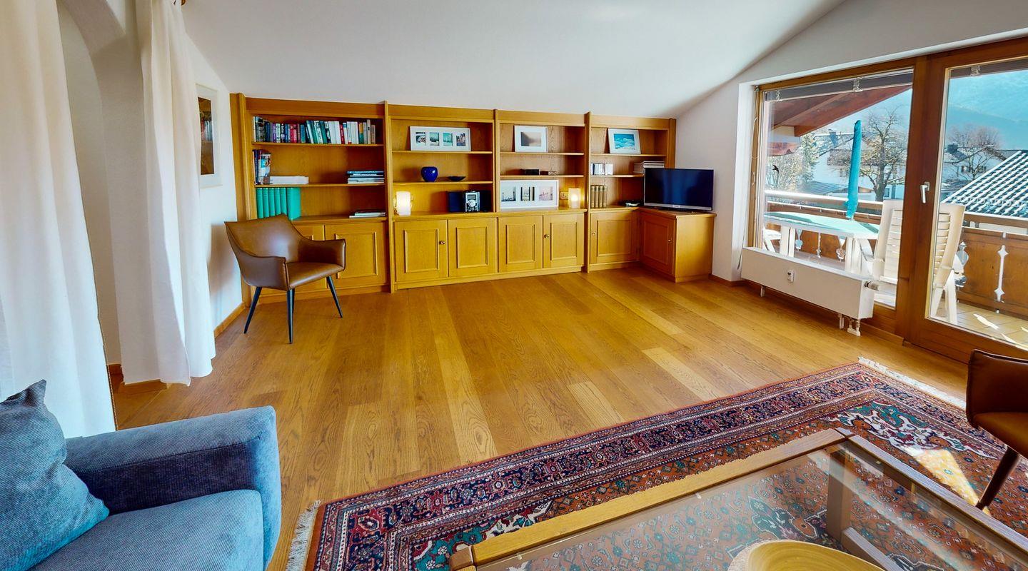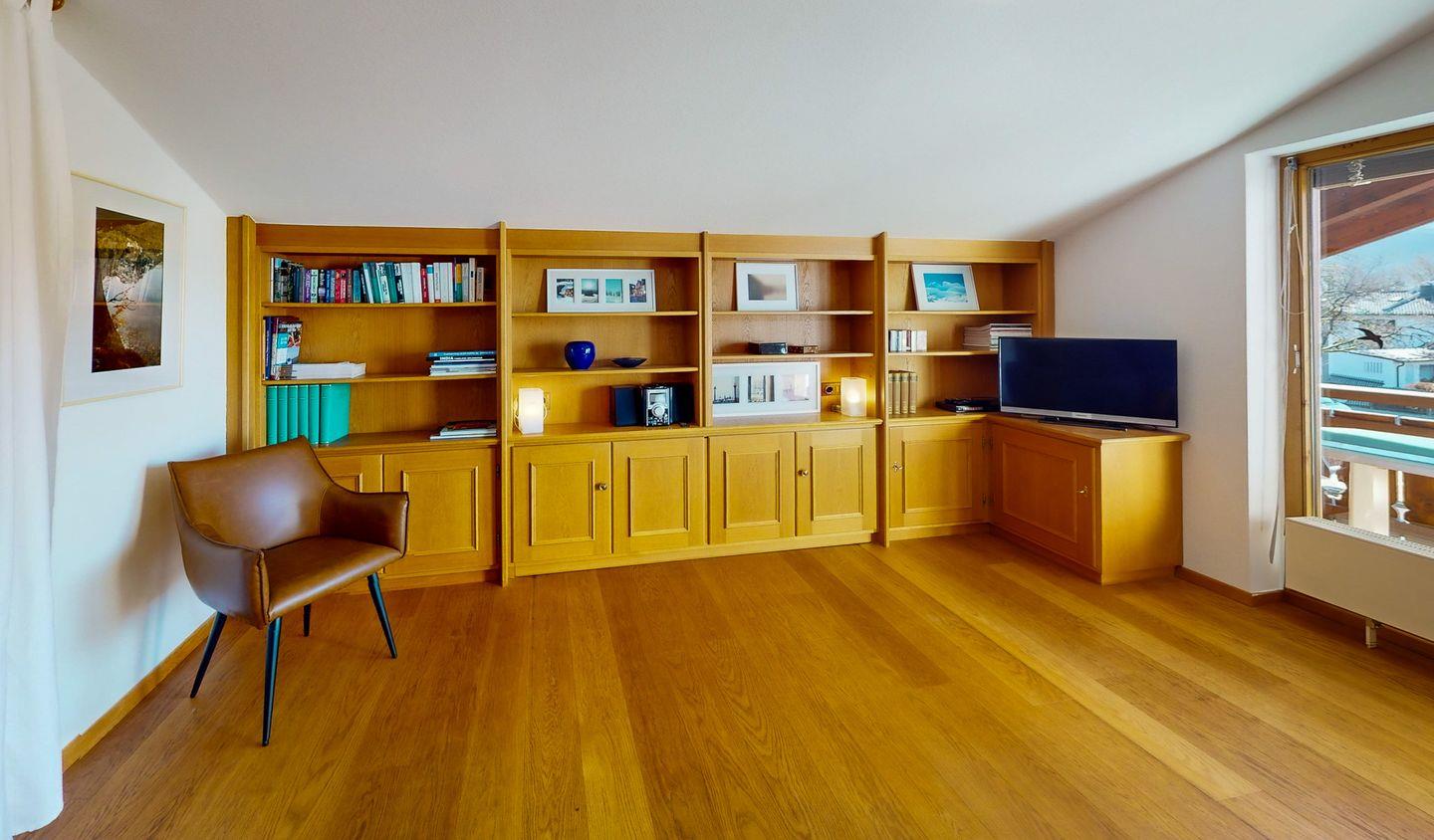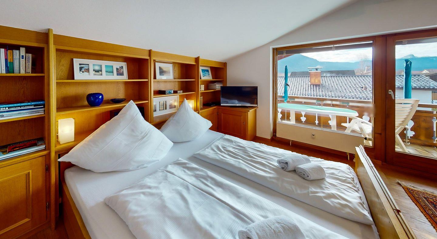 Das Herzstück ist der Wohnbereich mit seiner komfortablen Sitzgarnitur und freiliegenden Holzbalken, die urigen Charakter verleihen. Hier finden Sie auch Zugang zu einem der zwei Balkone, auf dem Sie einen unglaublichen Ausblick auf das Zugspitzmassiv und die umliegenden Berge genießen. Der perfekte Ort, um die Füße hochzulegen und in der Abendsonne zu entspannen. ?Neben reichlich Stauraum, halten die eingebauten Regale zudem ein ausziehbares Schrankbett bereit, welches zwei Personen eine bequeme und praktische Schlafgelegenheit bietet.