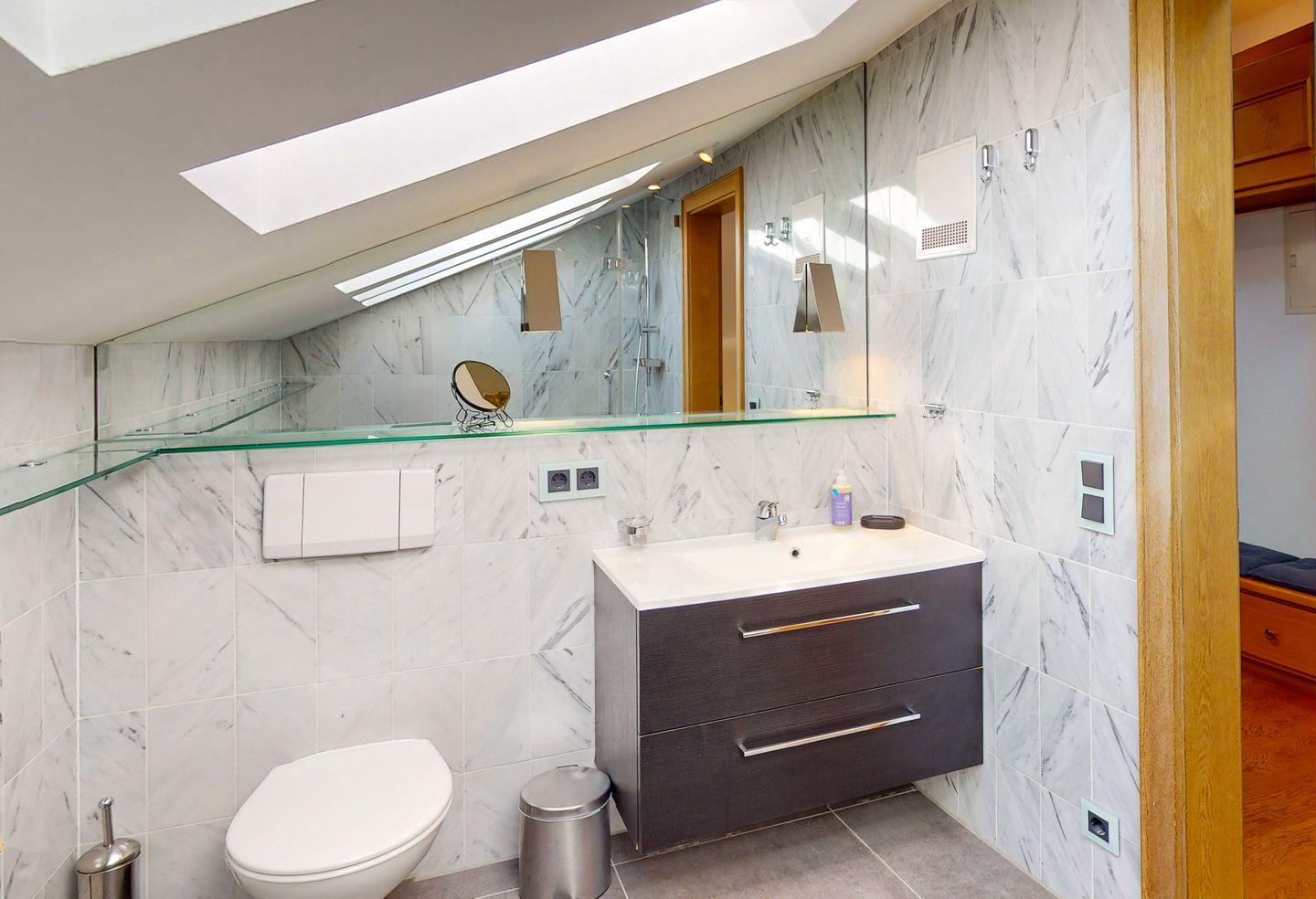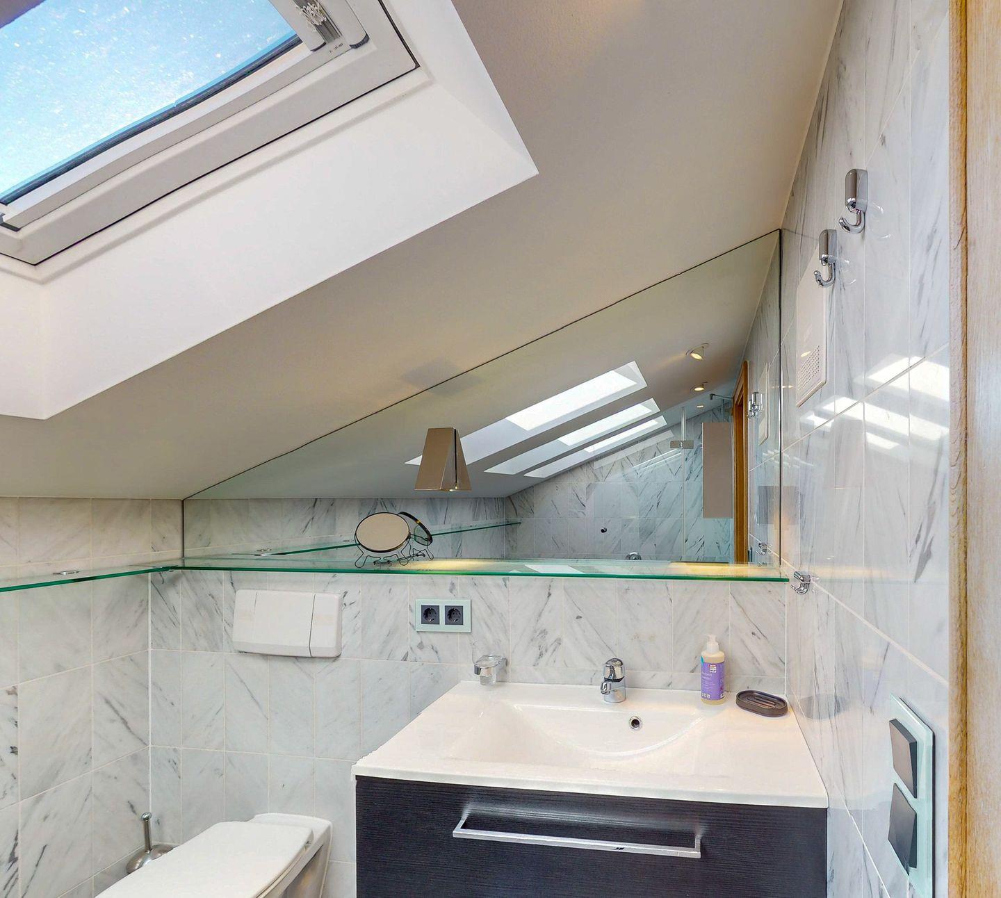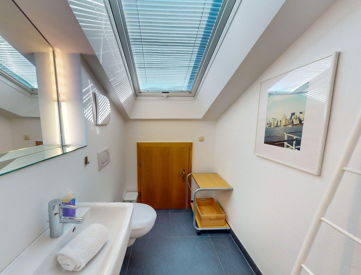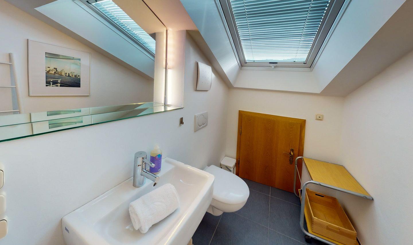 Das Badezimmer verfügt neben einer Toilette und Waschbecken auch über eine ebenerdige Dusche. Zwei Oberlichter sorgen für gute Beleuchtung mit Tageslicht. Ein separates Gäste-WC bietet auch bei einer Belegung mit 4 Personen zusätzlichen Komfort.